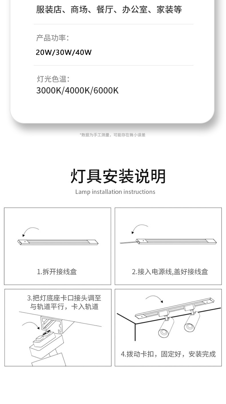| Color Classification | 【Buy 3 Lights✔Free 1m Track] if You Need a Single Installation, Please Contact Customer Service,【Bulk Discounts Available - Contact Customer Service】We Offer 1-on-1 Lighting Design Services. 【Custom Sizes Available】,Limited Time Sale✅[Pack of 3] 30 Watt Black Shell - Choose One of Three Colors★Purchase Limit Is One Piece,Limited Time Sale✅[Pack of 3] 30 Watt White Shell - Choose One of Three Colors★Purchase Limit Is One Piece,3-Pack [Special Offer-20W] Black Shell◎Choose One of Three Colors - 3 Lights and 1 Track,3-Pack [Special Offer-20W] White Shell◎Choose One of Three Colors - 3 Lights and 1 Track,3-Pack [Energy Saving] 30W Black Shell◆White Light-3 Lights 1 Track,3-Pack [Energy Saving] 30W Black Shell◆Neutral Light-3 Lights 1 Track,3-Pack [Energy Saving] 30W Black Shell◆Warm Light-3 Lights 1 Track,3 Pack [Energy Saving] 30W White Shell◆White Light-3 Lights 1 Track,3 Pack [Energy Saving] 30W White Shell◆Neutral Light-3 Lights 1 Track,3 Pack [Energy Saving] 30W White Shell◆Warm Light-3 Lights 1 Track,3-Pack [Commercial Highlight] 30W Black Shell◎White Light-3 Lights 1 Track,3-Pack [Commercial Highlight] 30W Black Shell ◎ Neutral Light-3 Lights 1 Track,3-Pack [Commercial Highlight] 30W Black Shell ◎ Warm Light-3 Lights 1 Track,3-Pack [Commercial Highlight] 30W White Shell◎White Light-3 Lights 1 Track,3-Pack [Commercial Highlight] 30W White Shell◎Neutral Light-3 Lights 1 Track,3-Pack [Commercial Highlight] 30W White Shell◎Warm Light-3 Lights 1 Track,3 Pack [Upgraded Extra Bright] 40W Black Shell◆White Light-3 Lights 1 Track,3 Pack [Upgraded Extra Bright] 40W Black Shell◆Neutral Light-3 Lights 1 Track,3 Pack [Upgraded Extra Bright] 40W Black Shell◆Warm Light-3 Lights 1 Track,3 Pack [Upgraded Extra Bright] 40W White Shell◆White Light-3 Lights 1 Track,3 Pack [Upgraded Extra Bright] 40W White Shell◆Neutral Light-3 Lights 1 Track,3 Pack [Upgraded Extra Bright] 40W White Shell◆Warm Light-3 Lights 1 Track,6 Pack [Energy Saving] 30W Black Shell◎Light Color of Your Choice - 6 Lights, 2 Tracks + 1 Connector,6 Pack [Energy Saving] 30W White Shell◎Light Color of Your Choice - 6 Lights, 2 Tracks + 1 Connector,6-Pack [Commercial Highlight] 30W Black Shell◎Light Color of Your Choice - 6 Lights, 2 Tracks + 1 Connector,6 Pack [Commercial Highlight] 30W White Shell◎Light Color of Your Choice - 6 Lights, 2 Tracks + 1 Connector,6 Pack [Upgraded Extra Bright] 40W Black Shell◎Light Color of Your Choice - 6 Lights, 2 Tracks + 1 Connector,6 Pack [Upgraded Extra Bright] 40W White Shell◎Light Color of Your Choice - 6 Lights, 2 Tracks + 1 Connector,9 Pieces [Energy Saving] 30W Black Shell◆Customizable Light Color - 9 Lights, 3 Tracks + 2 Connectors,9 Pieces [Energy Saving] 30W White Shell◆Customizable Light Color - 9 Lights, 3 Tracks + 2 Connectors,9 Pieces [Commercial Highlight] 30W Black Shell◆Customizable Light Color - 9 Lights, 3 Tracks + 2 Connectors,9 Pieces [Commercial Highlight] 30W White Shell◆Customizable Light Color - 9 Lights, 3 Tracks + 2 Connectors,9 Pieces [Upgraded Extra Bright] 40W Black Shell◆Customizable Light Color - 9 Lights, 3 Tracks + 2 Connectors,9 Pieces [Upgraded Extra Bright] 40W White Shell◆Customizable Light Color - 9 Lights, 3 Tracks + 2 Connectors,12 Pieces [Energy Saving] 30W Black Shell◎Customizable Light Color - 12 Lights, 4 Tracks + 3 Connectors,12 Pieces [Energy Saving] 30W White Shell◎Customizable Light Color - 12 Lights, 4 Tracks + 3 Connectors,12 Pieces [Commercial Highlight] 30W Black Shell◎Customizable Light Color - 12 Lights, 4 Tracks + 3 Connectors,12 Pieces [Commercial Highlight] 30W White Shell◎Customizable Light Color - 12 Lights, 4 Tracks + 3 Connectors,12 Pieces [Upgraded Extra Bright] 40W Black Shell◎Customizable Light Color - 12 Lights, 4 Tracks + 3 Connectors,12 Pieces [Upgraded Extra Bright] 40W White Shell◎Customizable Light Color - 12 Lights, 4 Tracks + 3 Connectors,Super Cost-Effective✔24 Pieces [Commercial Extra Bright] 30W Black Shell✨Customizable Light Color - 24 Lights with 8 Tracks and 7 Connectors Included,Super Cost-Effective✔24 Pieces [Commercial Extra Bright] 30W White Shell✨Customizable Light Color - 24 Lights with 8 Tracks and 7 Connectors Included,3 Pack [Three-Color Dimming] 30W Black Shell⭐3 Lights 1 Track,3 Pack [Three-Color Dimming] 30W White Shell⭐3 Lights 1 Track,3-Pack [Commercial 24H] 30W Black Shell ✅ Light Color of Your Choice - 3 Lights and 1 Track,3-Pack [Commercial 24H] 30W White Shell✅Light Color of Your Choice - 3 Lights and 1 Track,▼ ▼ ▼ The Following Are Track Accessories ▼ ▼ ▼,[Track Strip] 1m Track-Black and White Remarks,[Track Strip] 0.5m Track-Black and White Remarks,[Direct Line] Black and White Remarks-Black and White Remarks,[Corner Connection] Black and White Remarks-Black and White Remarks,【Track Crane Boom】50Cm Fixed Pole - Black/White (Please Specify),【Overhead Crane Jib】50-100 Telescopic Jib Arm - Black/White (Please Specify),【Overhead Crane Jib】75-150 Telescopic Jib Arm - Black/White (Please Specify),【Overhead Crane Jib】100-200 Telescopic Jib Arm - Black/White (Please Specify),Wiring-Free Accessories [3m Switch Wire]★Silent Black |