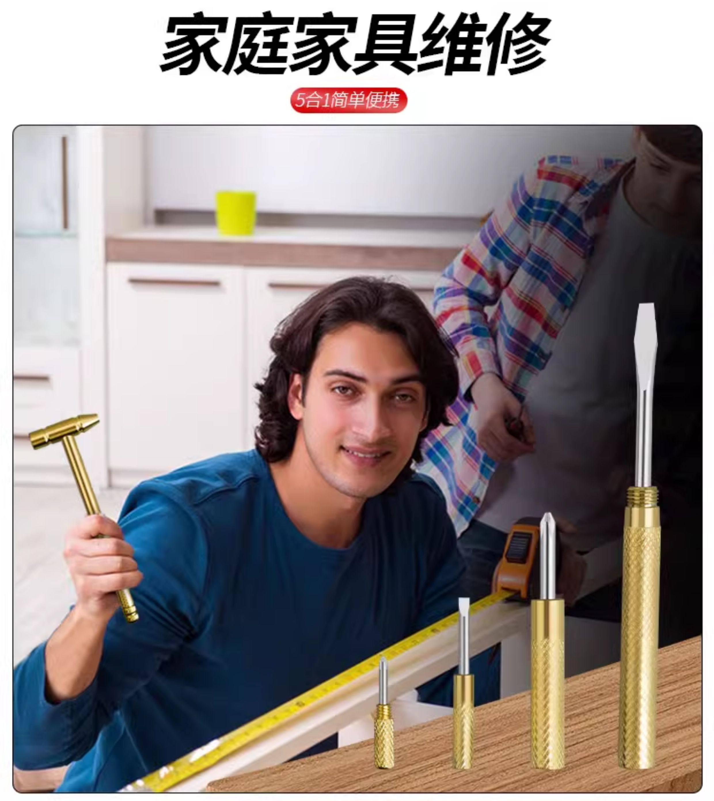 Mini Multi-Functional Small Copper Hammer, Household Small Hammer, Five-In-One Copper-Plated Hammer, Round Head Hammer, Knife Hammer, Iron Hammer