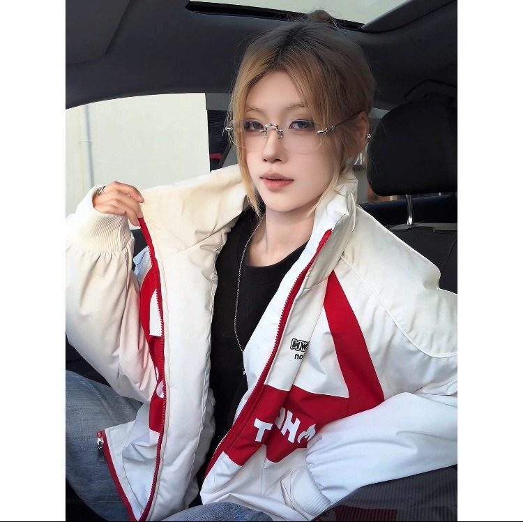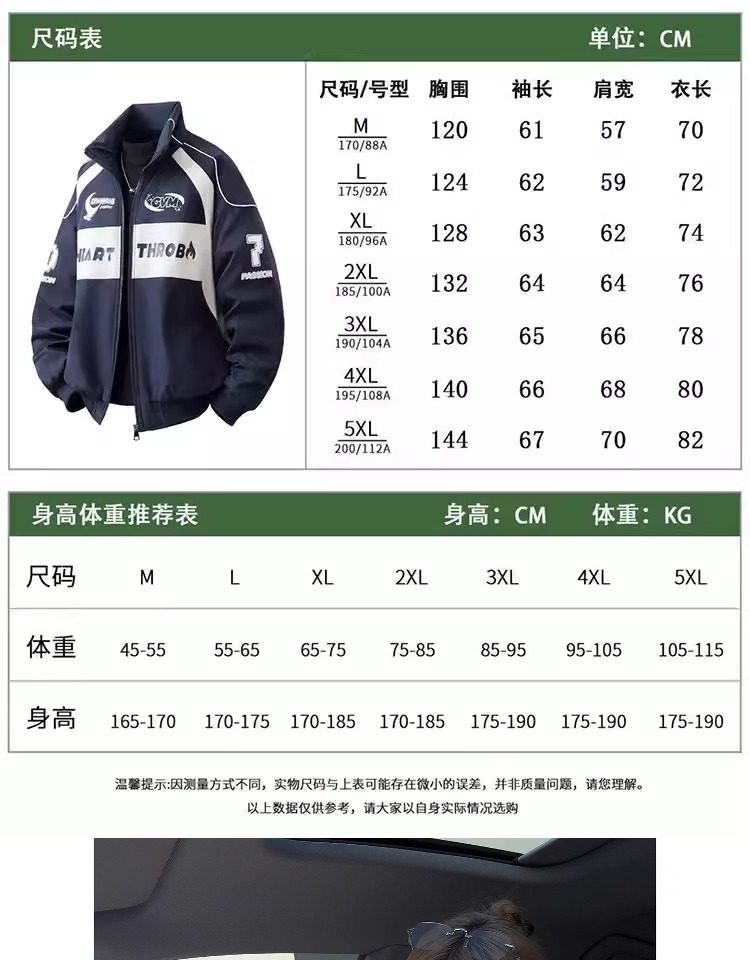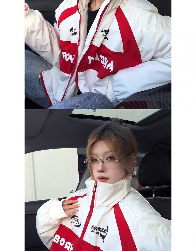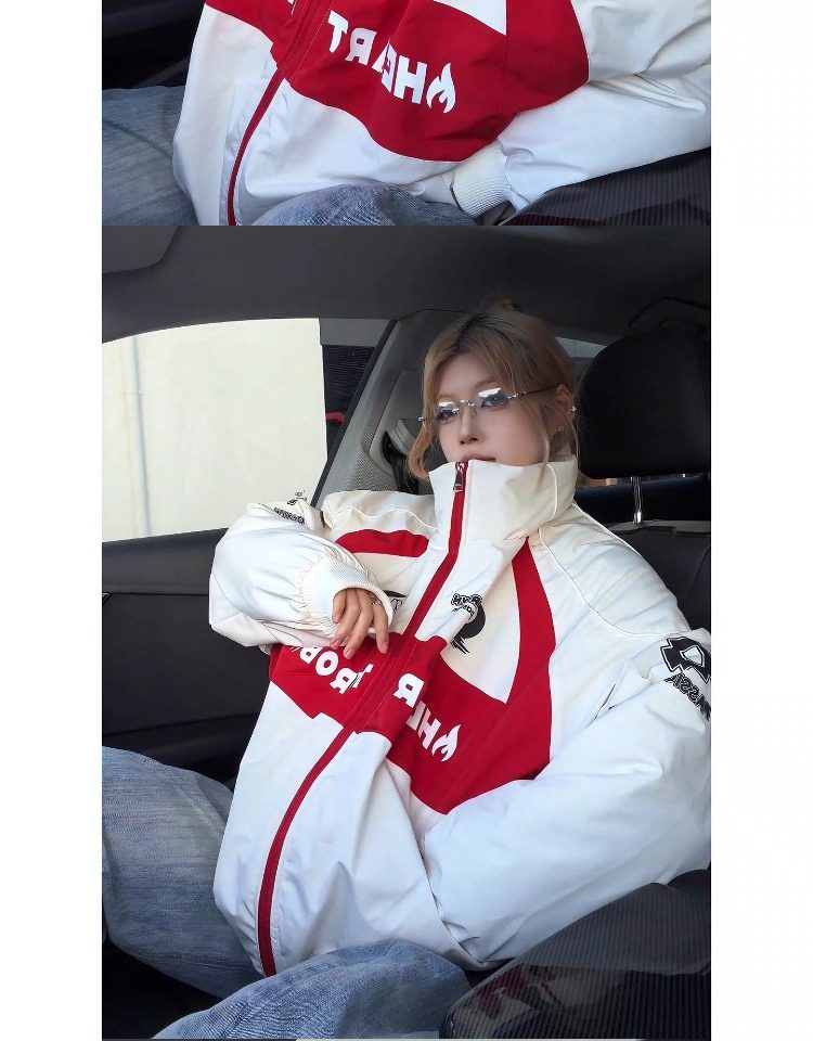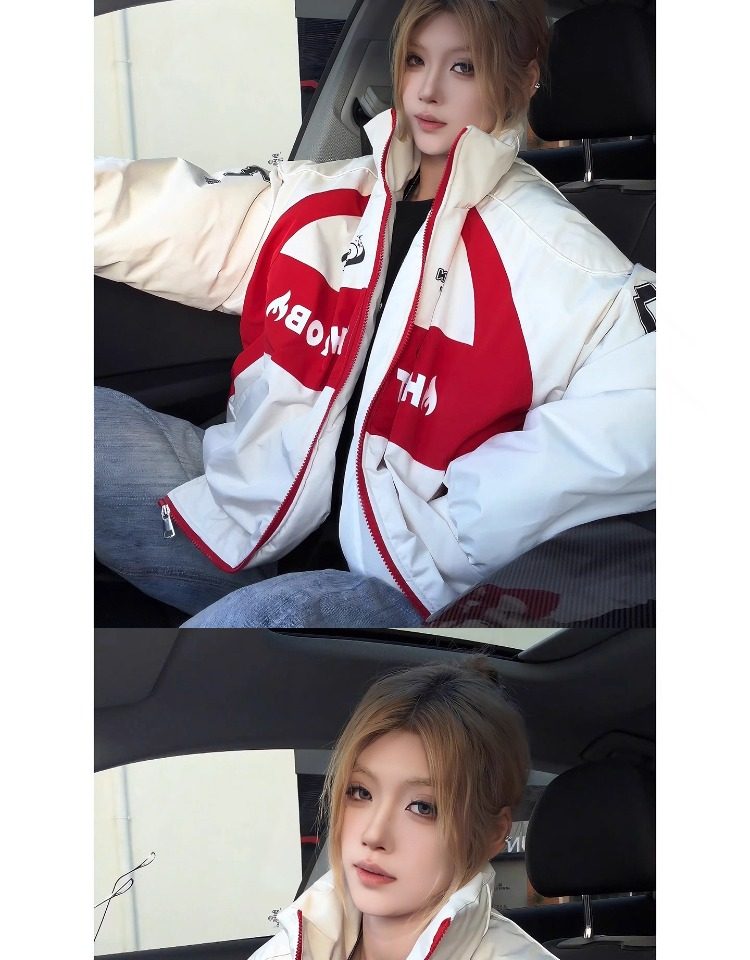 American-Style Color-Block Printed down Jacket for Men and Women, Winter Vintage Biker Cotton Jacket with a High-End Feel, Stand-Up Collar Racing Cotton Coat