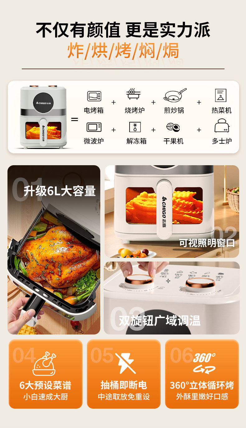 Chigo Air Fryer for Home Use, Multifunctional, All-In-One, Visible, Large Capacity, Fully Automatic, 2025 New Model Electric Fryer