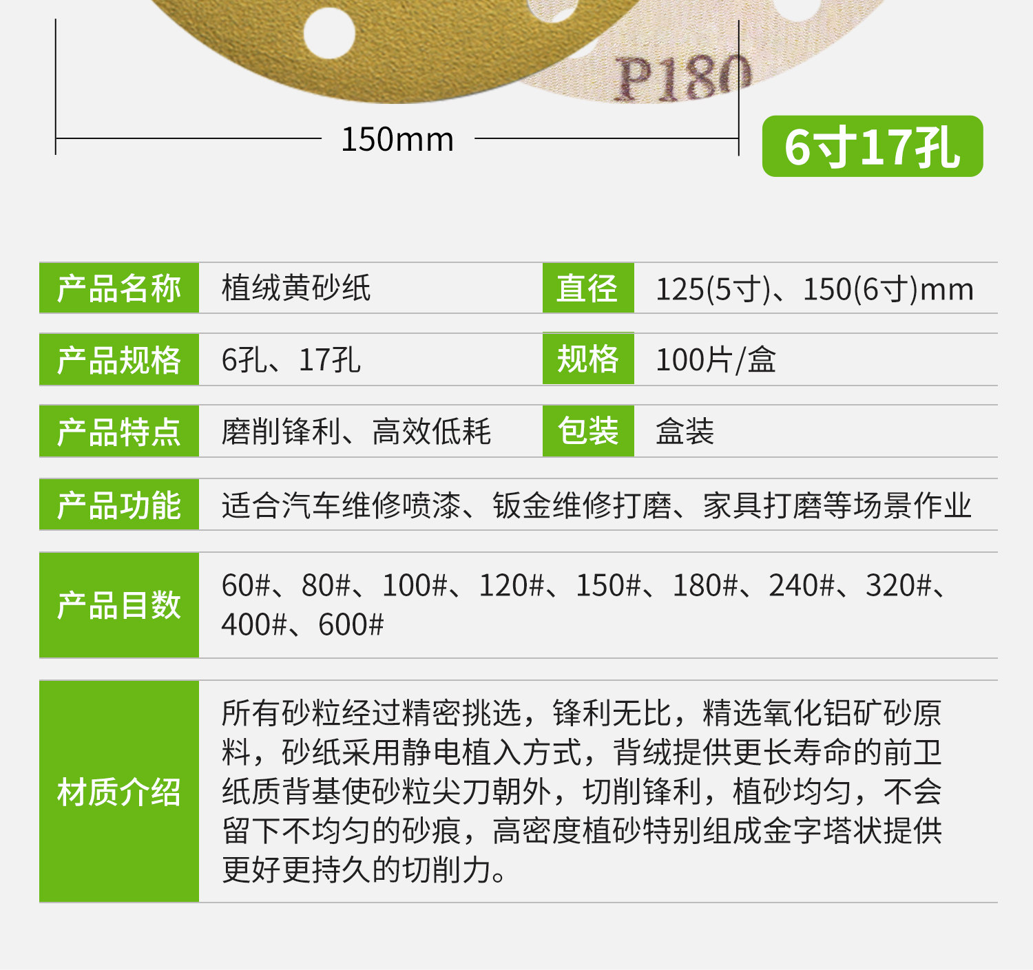 | Color Classification | 5 Inches 6 Holes 60# 【100 Pieces】,5 Inches 6 Holes 80#【100 Pieces】,5 Inches 6 Holes 100#【100 Pieces】,5 Inches 6 Holes 120#【100 Pieces】,5 Inches 6 Holes 150#【100 Pieces】,5 Inches 6 Holes 180#【100 Pieces】,5 Inches 6 Holes 240#【100 Pieces】,5 Inches 6 Holes 320#【100 Pieces】,5 Inches 6 Holes 400#【100 Pieces】,5 Inches 6 Holes 600#【100 Pieces】,6 Inches 17 Holes 60#【100 Pieces】,6 Inches 17 Holes 80#【100 Pieces】,6 Inches 17 Holes 100#【100 Pieces】,6 Inches 17 Holes 120#【100 Pieces】,6 Inches 17 Holes 150#【100 Pieces】,6 Inches 17 Holes 180#【100 Pieces】,6 Inches 17 Holes 240#【100 Pieces】,6 Inches 17 Holes 320#【100 Pieces】,6 Inches 17 Holes 400#【100 Pieces】,6 Inches 17 Holes 600#【100 Pieces】,Selection Guide: Choose the Number of Holes That Matches the Number of Holes on Your Machine or Adhesive Pad. |
