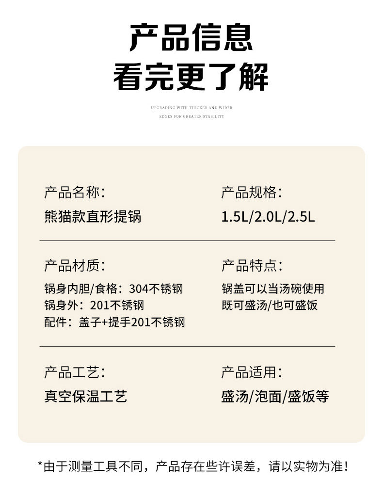 | Color Classification | ⭐✅ [Exquisite Panda Pattern] Dry Rice Man❤Really Fragrant❤The Series Patterns Are Uv Hot-Printed and Will Not Fade or Fall Off.✅✅,⭐✅ [Free Chopsticks + Spoon Tableware]✅High Vacuum, Ultra-Long Insulation. Trust the Wudu Hui Brand! ↓↓ Choose Your Size Below ↓↓,【Panda Design - Foodie】304 Stainless Steel 【Straight Vacuum Insulated 1.5L】Includes Utensils,【Panda Design - Foodie】304 Stainless Steel 【Straight Vacuum Insulated 2.0L】Includes Utensils,【Panda Design - Rice Lover】304 Stainless Steel 【Straight Vacuum Insulated 2.5L】Includes Utensils,[Panda Pattern - Really Fragrant] 304 Stainless Steel [Straight Vacuum Insulation 1.5L] Free Tableware,[Panda Pattern - Really Fragrant] 304 Stainless Steel [Straight Vacuum Insulation 2.0L] Free Tableware,[Panda Pattern - Really Fragrant] 304 Stainless Steel [Straight Vacuum Insulation 2.5L] Free Tableware,【Panda Design - Foodie】304 Stainless Steel 【Straight Vacuum Insulated 1.5L】 Includes Utensils + Panda Insulated Bag,【Panda Design - Foodie Edition】304 Stainless Steel 【Straight Vacuum Insulated 2.0L】 Includes Utensils + Panda Insulated Bag,【Panda Design - Foodie Edition】304 Stainless Steel 【Straight Vacuum Insulated 2.5L】 Includes Utensils + Panda Insulated Bag,[Panda Pattern - Really Fragrant] 304 Stainless Steel [Straight Vacuum Insulation 1.5L] Free Tableware + Panda Insulation Bag,[Panda Pattern - Really Fragrant] 304 Stainless Steel [Straight Vacuum Insulation 2.0L] Comes with Tableware + Panda Insulation Bag,[Panda Pattern - Really Fragrant] 304 Stainless Steel [Straight Vacuum Insulation 2.5L] Free Tableware + Panda Insulation Bag |