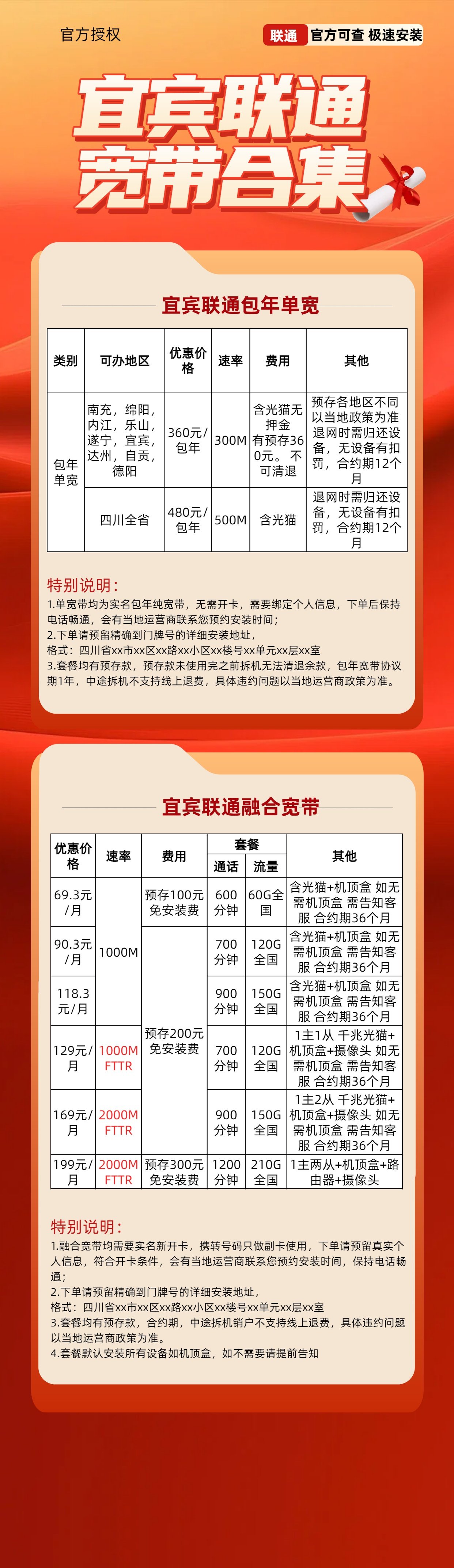 Broadband Installation and Rental Lt Yibin Annual Single Broadband 300m/360 Yuan Per Year,Lt Yibin Annual Single Broadband 500m/480 Yuan Per Year,Lt Yibin Fusion❀ 69.3 Yuan/Month=600 Minutes+60G+1000M❀Card Required,Lt Yibin Fusion❀ 90.3 Yuan/Month=700 Minutes+120G+1000M❀Card Required,Lt Yibin Fusion❀ 118.3 Yuan/Month=900 Minutes+150G+1000M❀Card Required,Lt Yibin Fusion❀ 129 Yuan/Month=700 Minutes+120G+1000M❀Fttr One Master and One Slave,Lt Yibin Fusion❀ 169 Yuan/Month=900 Minutes+150G+2000M❀Fttr One Master and Two Slaves,Lt Yibin Fusion ❀ 199 Yuan/Month=1200 Minutes+210G+2000M ❀ Fttr One Master and Two Slaves