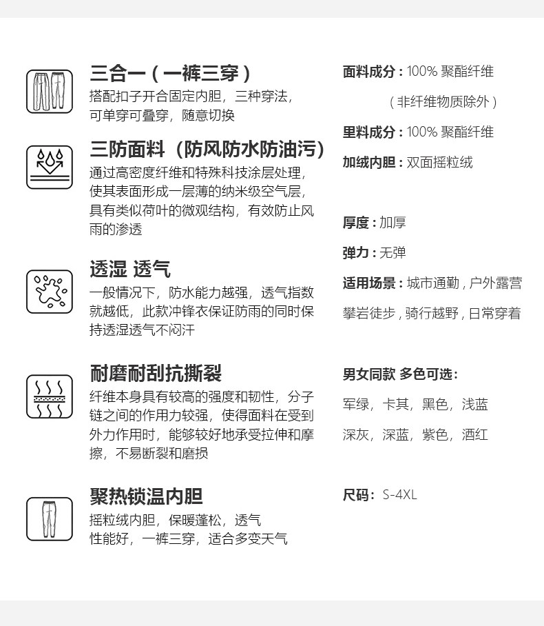 | Color Classification | Same Style for Men and Women - Light Pink [Three-In-One/Two Pieces Detachable],Same Style for Men and Women - Light Green [Three-In-One/Two Detachable],Same Style for Men and Women - Light Blue [Three-In-One/Two Detachable],Same Style for Men and Women - Burgundy [Three-In-One/Two Pieces Detachable],Same Style for Men and Women - Black [Three-In-One/Two Detachable],Same Style for Men and Women - Military Green [Three-In-One/Two Detachable],Same Style for Men and Women - Purple [Three-In-One/Two Detachable],Same Style for Men and Women - Khaki [Three-In-One/Two Pieces Detachable],Same Style for Men and Women - Light Pink [Single Pants],Same Style for Men and Women - Military Green [Single Pants],Same Style for Men and Women-Khaki [Single Pants],Same Style for Men and Women - Black [Single Pants],Same Style for Men and Women-Burgundy [Single Pants],Same Style for Men and Women - Light Blue [Single Pants],Same Style for Men and Women - Light Green [Single Pants],Same Style for Men and Women - Purple [Single Pants],Same Style for Men and Women - Light Pink [Three-In-One/Down Liner],Same Style for Men and Women - Light Green [Three-In-One/Down Liner],Same Style for Men and Women - Light Blue [Three-In-One/Down Liner],Same Style for Men and Women - Burgundy [Three-In-One/Down Liner],Same Style for Men and Women - Black [Three-In-One/Down Liner],Same Style for Men and Women - Military Green [Three-In-One/Down Liner],Same Style for Men and Women - Purple [Three-In-One/Down Liner],Same Style for Men and Women-Khaki [Three-In-One/Down Liner] |