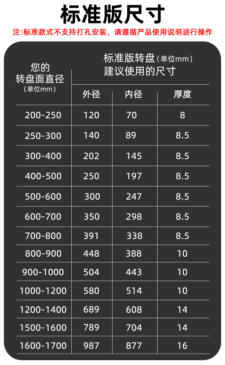 | Color Classification | Share the Video and Contact Customer Service to Return 5m,If You Have a Wooden Table at Home, Please Select the "Wooden Table Specific" Option at the Bottom.,Upgraded Smooth Version 120mm [Applicable to 200-250 Turns],Upgraded Smooth Version 140mm [Applicable to 250-300 Turns],Upgraded Smooth Version 200mm [Applicable to 300-400 Turns],Upgraded Smooth Version 250mm [Applicable to 400-500 Turns],Upgraded Smooth Version 300mm [Applicable to 500-600 Turns],Upgraded Smooth Version 350mm [Applicable to 600-700 Turns],Upgraded Smooth Version 390mm [Applicable to 700-800 Turns],Upgraded Smooth Version 450mm [Applicable to 800-900 Turns],Upgraded Smooth Version 490mm [Applicable to 900-1000 Turns],Upgraded Smooth Version 580mm [Applicable to 1000-1200 Turns],Upgraded Smooth Version 680mm [Applicable to 1200-1400 Turns],Upgraded Smooth Version 800mm [Applicable to 1500-1600-Turn Surface],Upgraded Smooth Model 990mm [Applicable to 1600-1700 Rpm],---The Following Is the Thickened Sound-Absorbing Model---,Upgraded Thickened Silencer Model 200mm [Applicable to 300-400 Turns] Can Be Screwed in if Misaligned,Upgraded Thickened Silencer Model 250mm [Applicable to 400-500 Turns] Can Be Screwed in if Misaligned,Upgraded Thickened Silencer Model 300mm [Applicable to 500-600 Turns] Can Be Screwed in if Misaligned,Upgraded Thickened Silencer Model 350mm [Applicable to 600-700 Turns] Can Be Screwed in if Misaligned,Upgraded Thickened Silencer Model 400mm [Applicable to 700-800 Turns] Can Be Screwed in if Misaligned,Upgraded Thickened Silencer Model 450mm [Applicable to 800-900 Turns] Can Be Screwed in if Misaligned,Upgraded Thickened Silencer Model 500mm [Applicable to 900-1000 Turns] Can Be Screwed in if Misaligned,Upgraded Thickened Silencer Model 600mm [Applicable to 1000-1200 Turns] Screws Can Be Installed in Misalignment,Upgraded Thickened Silencer Model 680mm [Applicable to 1200-1400 Turns] Can Be Screwed in if Misaligned,Upgraded Thickened Silencer Model 800mm [Applicable to 1500-1600-Turn Surface] Screws Can Be Installed if Misaligned,Upgraded Thickened Silencer Model 990mm [Applicable to 1600-1700 Turns] Screws Can Be Installed if Misaligned,---The Following Is the Wooden Table Model---,30cm for Wooden Round Table [Applicable to 50-60cm Turning Surface] [Installation Accessories Included] Cold-Rolled Steel,Special 40cm for Wooden Round Table, Suitable for 70-80cm Turning Surface] [Installation Accessories Included] Cold-Rolled Steel,50cm for Wooden Round Table [Applicable to 100-110cm Turning Surface] [Installation Accessories Included] Cold-Rolled Steel,60cm for Wooden Round Table [Applicable to 110-120cm Rotation] [Installation Accessories Included] Cold-Rolled Steel,70cm for Wooden Round Table [Applicable to 120-140cm Turning Surface] [Installation Accessories Included] Cold-Rolled Steel,80cm for Wooden Round Table [Applicable to 140-160cm Rotation Surface] [Installation Accessories Included] Cold-Rolled Steel,[Extended Anti-Slip Pad] Special Model for Wooden Tables 90cm [Applicable to 160-180cm Turning Surface] [Free Installation Accessories] Cold-Rolled Steel,[Extended Anti-Slip Pad] Special Model for Wooden Tables 100cm [Applicable to 180-200cm Turning Surface] [Installation Accessories Included] Cold-Rolled Steel |