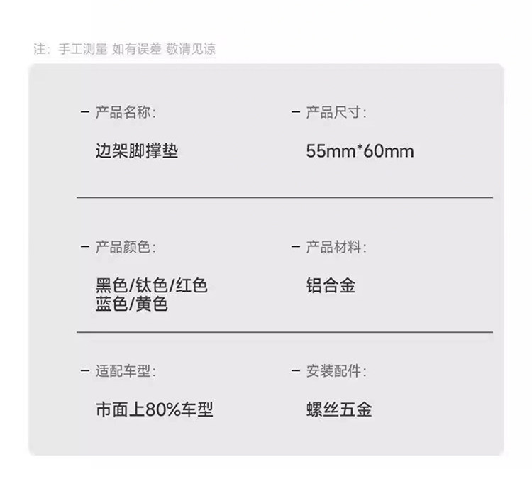 | Color Classification | Brand New Upgradeâ Universal High-Quality Kickstand Pad for Electric Bikes/MotorcyclesâSupporting Foot Pads [Black 1 Set]âAnti-Slip and Wear-Resistant,Brand New Upgradeâ Universal High-Quality Kickstand Pad for Electric Bikes/MotorcyclesâSupporting Foot Pads [Red 1 Set]âAnti-Slip and Wear-Resistant,Brand New Upgradeâ Universal High-Quality Kickstand Pad for Electric Bikes/MotorcyclesâSupporting Foot Pads [Blue 1 Set]âAnti-Slip and Wear-Resistant,Brand New Upgradeâ Universal High-Quality Kickstand Pad for Electric Bikes/MotorcyclesâSupporting Foot Pads [Silver 1 Set]âAnti-Slip and Wear-Resistant,Support Foot Pad [Electric Vehicle/Motorcycle] [Black 1 Set],Support Foot Pad [Electric Vehicle/Motorcycle] [Red 1 Set],Support Foot Pad [Electric Vehicle/Motorcycle] [Blue 1 Set],Support Foot Pad [Electric Vehicle/Motorcycle] [Titanium Gray 1 Set] |