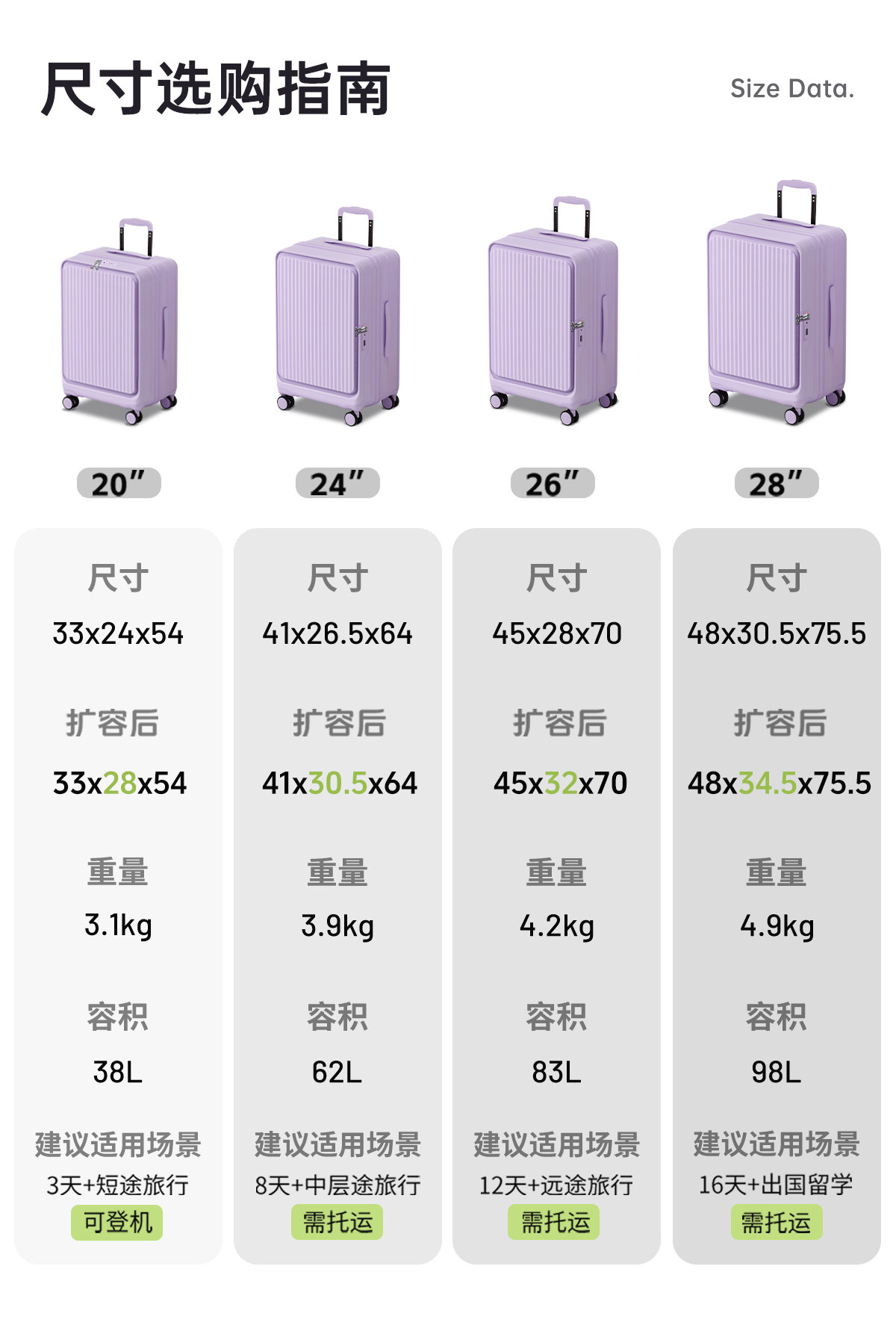 Front-Opening Flip-Top Expandable Suitcase Made of Pure Pc, Large Capacity Travel Boarding Checked Luggage Trolley Case 24