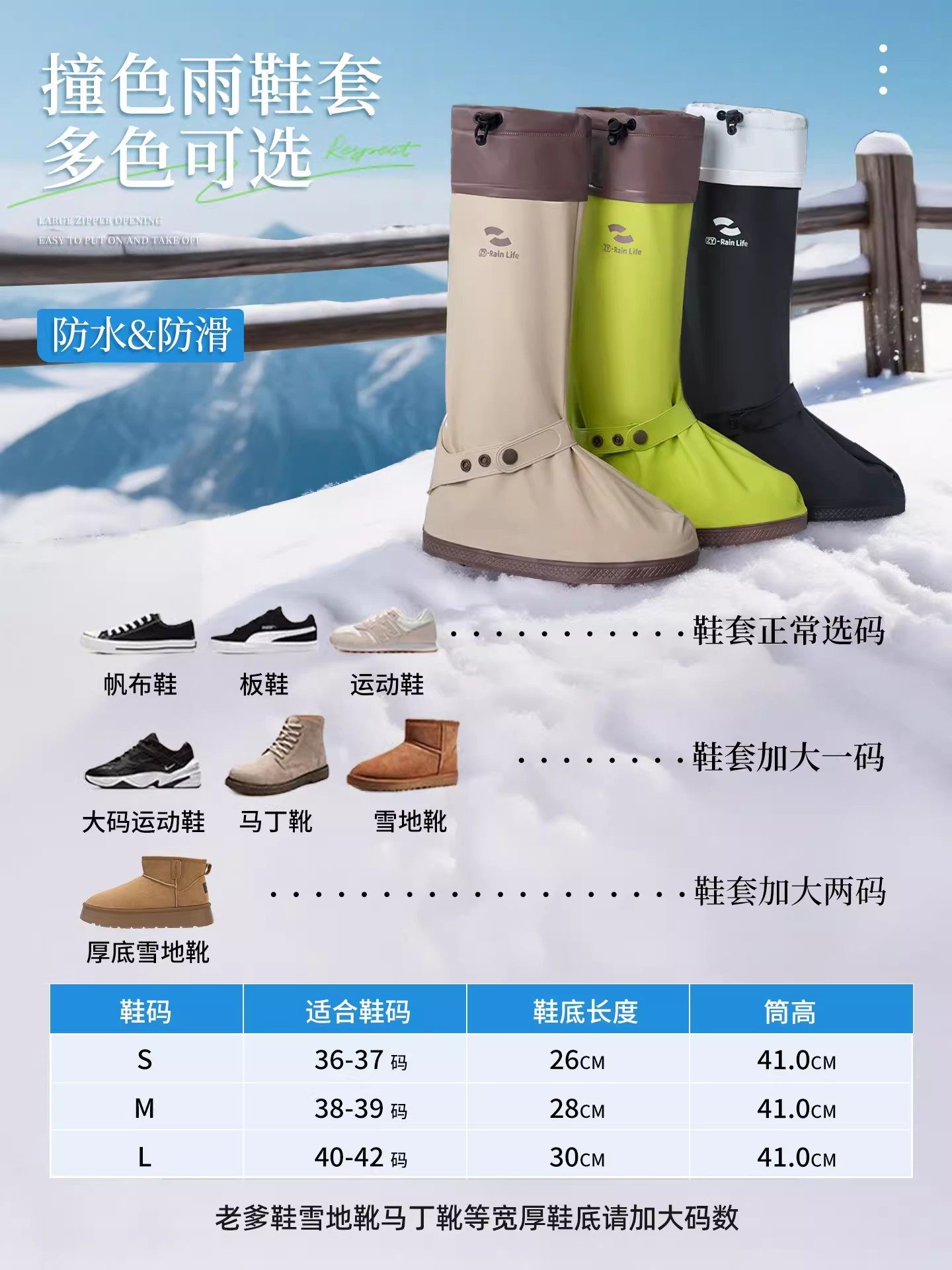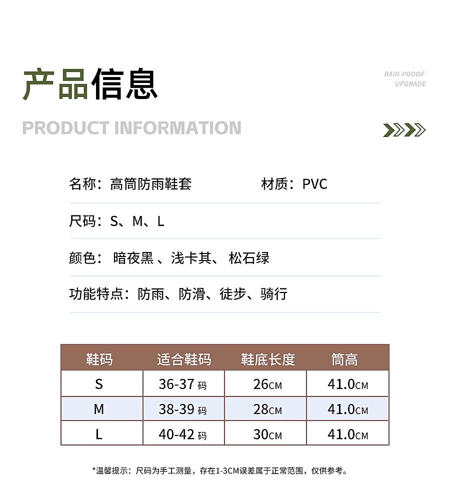 | Color Classification | S_Adult Model - Turquoise Green [42cm High Tube | Zipper Is Easy to Put on and Take Off | Drawstring Cuff Will Not Fall Off | Integrated Strap],M_Adult Model - Turquoise Green [42cm High Tube | Zipper Is Easy to Put on and Take Off | Drawstring Drawstring Will Not Fall Off | Integrated Strap],L_Adult Model - Turquoise Green [42cm High Tube | Zipper Is Easy to Put on and Take Off | Drawstring Cuff Will Not Fall Off | Integrated Strap],S_Adult Model-Dark Night Black [42cm High Tube | Zipper Is Easy to Put on and Take Off | Drawstring Cuff Will Not Fall Off | One-Piece Strap],M_Adult Model-Dark Night Black [42cm High Tube | Zipper Is Easy to Put on and Take Off | Drawstring Cuff Will Not Fall Off | Integrated Strap],L_Adult Model-Dark Night Black [42cm High Tube | Zipper Is Easy to Put on and Take Off | Drawstring Cuff Will Not Fall Off | One-Piece Strap],S_Adult Model - Light Khaki [42cm High Tube | Zipper Is Easy to Put on and Take Off | Drawstring Cuff Will Not Fall Off | Integrated Strap],M_Adult Model - Light Khaki [42cm High Tube | Zipper Is Easy to Put on and Take Off | Drawstring Cuff Will Not Fall Off | Integrated Strap],L_Adult Model - Light Khaki [42cm High Tube | Zipper Is Easy to Put on and Take Off | Drawstring Cuff Will Not Fall Off | Integrated Strap],Purple (Professional) Size S (Suitable for Shoe Sizes 35-37) [Snowproof, Waterproof, Sandproof / Thickened, Warm, and Wear-Resistant],Purple (Professional Model) m Size (Suitable for Shoe Sizes 38-40) [Snowproof, Waterproof, Sandproof / Thickened, Warm, and Wear-Resistant],Purple (Professional Model) L Size (Suitable for Shoe Sizes 41-43) [Snowproof, Waterproof, Sandproof / Thickened, Warm, and Wear-Resistant],Purple (Professional Model) XL Size (Suitable for Shoe Sizes 44-46) [Snowproof, Waterproof, Sandproof / Thickened, Warm, and Wear-Resistant] |