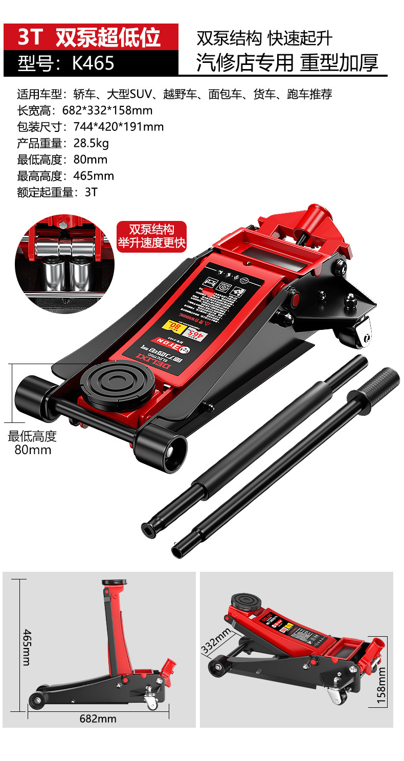 | Color Classification | 2 Tons Single Pump Hydraulic/One-Way Wheel (Height 14.5-40cm),2.5-Ton Single-Pump Hydraulic/Universal Rear Wheel (Height 8.5-38.5cm),3 Tons Single Pump Hydraulic/Universal Rear Wheel (Height 13.5-46cm),3 Tons Double Pump Hydraulic/Universal Rear Wheel (Height 8-46.5cm),3 Tons Double Pump Hydraulic/Universal Rear Wheel (Height 7.3-50cm),4 Tons Double Pump Hydraulic/Universal Rear Wheel (Height 8.5-50cm),2-Ton Single Pump Hydraulic/One-Way Wheel (Height 14.5-40cm) + 3-Ton Safety Support Bracket,2.5-Ton Single-Pump Hydraulic/Universal Rear Wheel (Height 8.5-38.5cm) + 3-Ton Security Bracket,3-Ton Single Pump Hydraulic/Universal Rear Wheel (Height 13.5-46cm) + 3-Ton Safety Support Stand,3-Ton Dual-Pump Hydraulic/Universal Rear Wheel (Height 8-46.5cm) + 3-Ton Safety Support Stand,3-Ton Dual-Pump Hydraulic/Universal Rear Wheel (Height 7.3-50cm) + 3-Ton Safety Support Stand,4-Ton Dual-Pump Hydraulic/Universal Rear Wheel (Height 8.5-50cm) + 3-Ton Safety Support Stand,2 Tons Single Pump Hydraulic/Universal Rear Wheel (Height 13-33cm),2-Ton Single Pump Hydraulic Jack / Universal Rear Wheel (Height 13-33cm) + 3-Ton Safety Support Stand |
