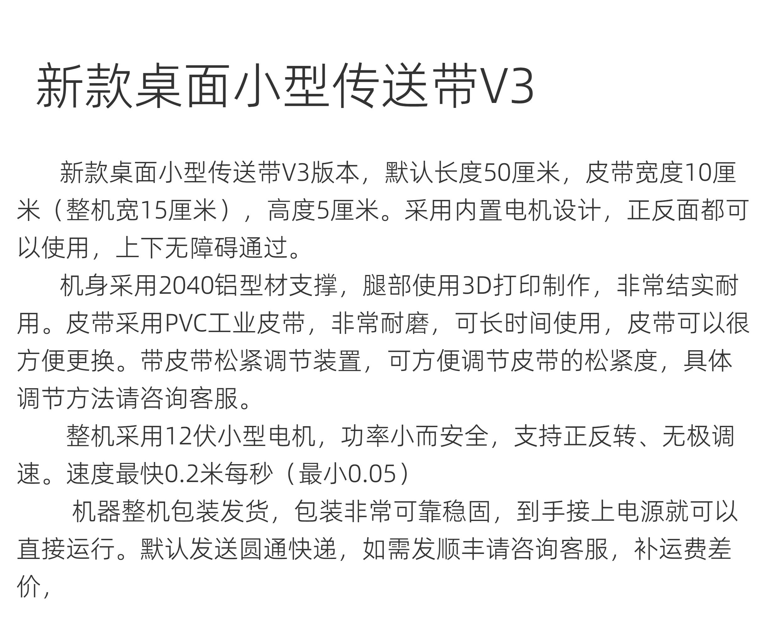 | Color Classification | Finished Product A: Length 30cm - Belt Width 10cm - Height 5cm, with Reversible Rotation and Adjustable Speed,Finished Product B: Length 30cm - Belt Width 15cm - Height 5cm, with Reversible Rotation and Adjustable Speed.,Finished Product C: Length 50cm - Belt Width 10cm - Height 5cm, with Reversible Rotation and Adjustable Speed.,Finished Product D: Length 50cm - Belt Width 15cm - Height 5cm, with Reversible Rotation and Adjustable Speed.,Finished Product E: Length 50cm - Belt Width 20cm - Height 5cm, with Reversible Rotation and Adjustable Speed.,For Other Sizes, Please Consult Customer Service (Length Less Than 80cm and Width Less Than 20cm) |