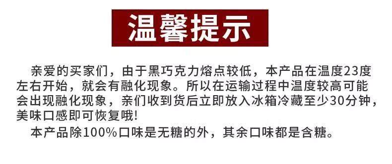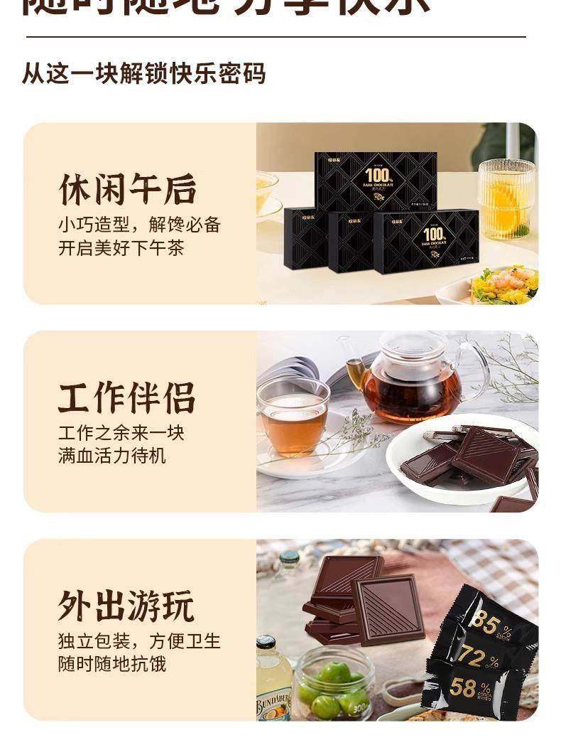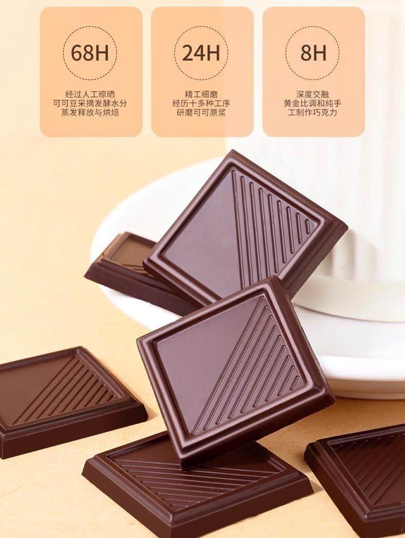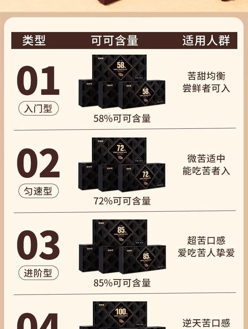 | Food Taste | [Dark Chocolate] 58%-Popular Flavor*1 Box [110G/Box],[Dark Chocolate] 72%-Bitter and Sweet Balance*1 Box [110G/Box],[Dark Chocolate] 85% - Bitter and Slightly Sweet*1 Box [110G/Box],[Dark Chocolate] 100% - Sugar-Free Extra Bitter*1 Box [110G/Box],[Dark Chocolate] 72%+85%+100%, 3 Boxes in Total [110G/Box],[Dark Chocolate] 1 Box Each of Four Flavors [110G/Box],[Dark Chocolate] 58% - Popular Taste * 2 Boxes [110G/Box],[Dark Chocolate] 72%-Bitter and Sweet Balance*2 Boxes [110G/Box],[Dark Chocolate] 85% - Bitter and Slightly Sweet*2 Boxes [110G/Box],[Dark Chocolate] 100% - Sugar-Free Extra Bitter*2 Boxes [110G/Box],[Dark Chocolate] 58%+72%, 2 Boxes in Total [110G/Box],[Dark Chocolate] 58%+85%, 2 Boxes in Total [110G/Box],[Dark Chocolate] 72%+85%, 2 Boxes in Total [110G/Box],[Dark Chocolate] 72%+100%, 2 Boxes in Total [110G/Box],[Dark Chocolate] 58%-Popular Flavor*4 Boxes [110G/Box],[Dark Chocolate] 72%-Bitter and Sweet Balance*4 Boxes [110G/Box],[Dark Chocolate] 85% - Bitter and Slightly Sweet*4 Boxes [110G/Box],[Dark Chocolate] 100% - Sugar-Free Extra Bitter * 4 Boxes [110G/Box] |