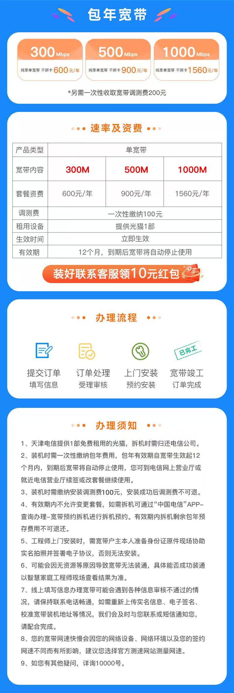 Tianjin Telecom Broadband Online Application for Annual Package, New Installation, Door-To-Door Service, Single Broadband, No Card Binding