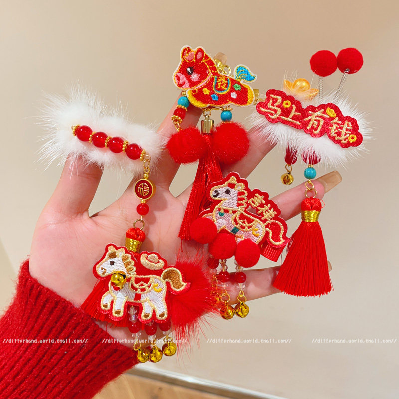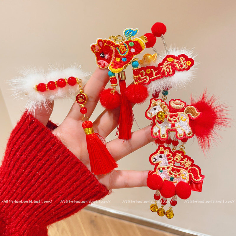 Year of the Horse New Year Red Children's Tassel Hairpin Hair Accessory, Traditional Chinese New Year Headdress, Chinese Style Little Girl Hanfu Hairpin