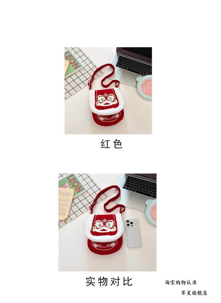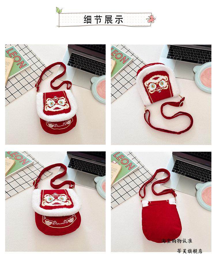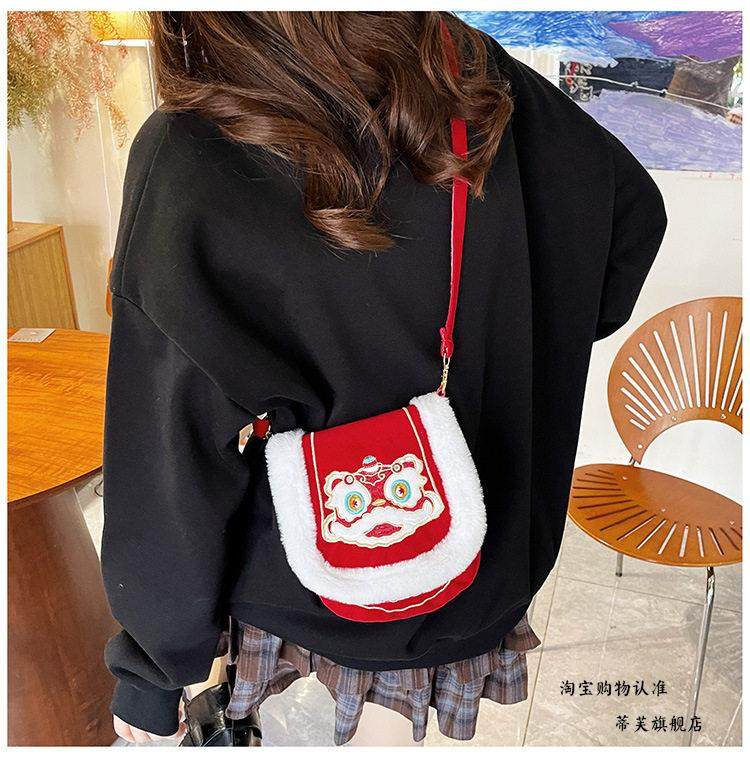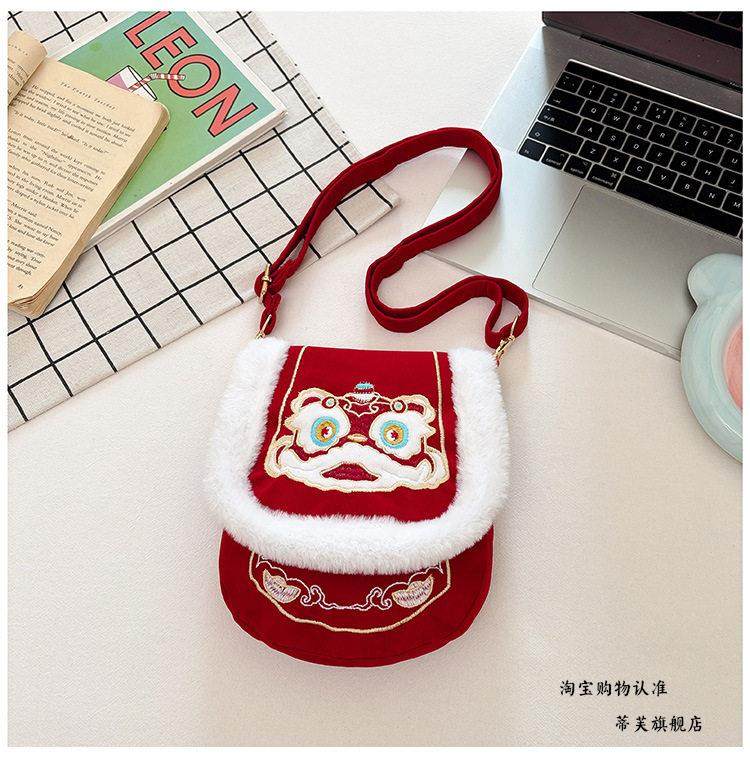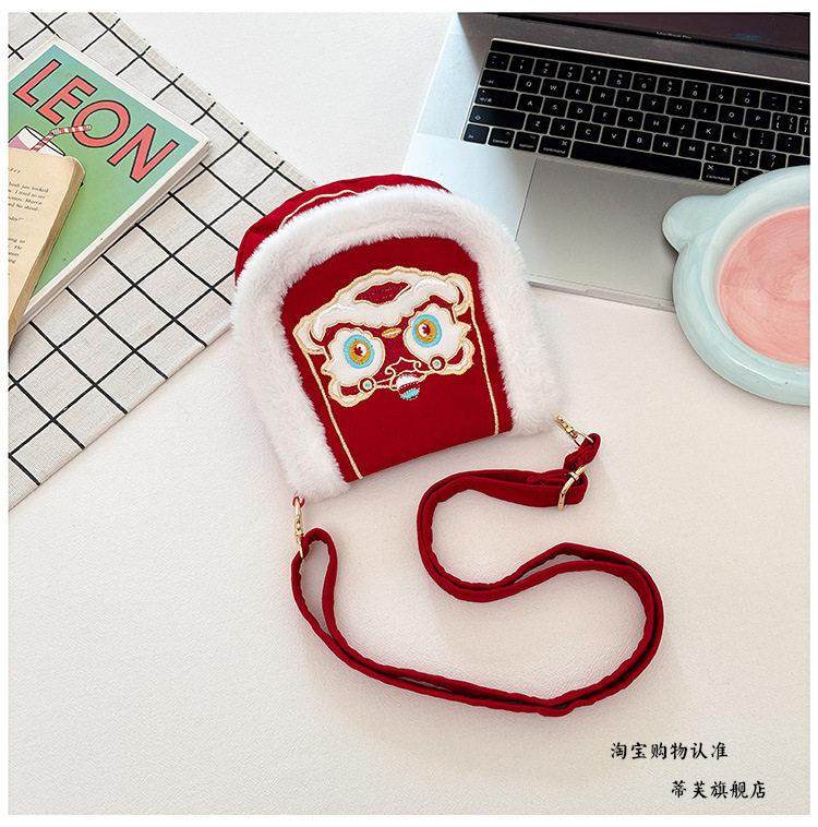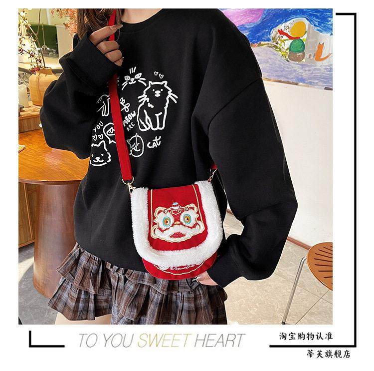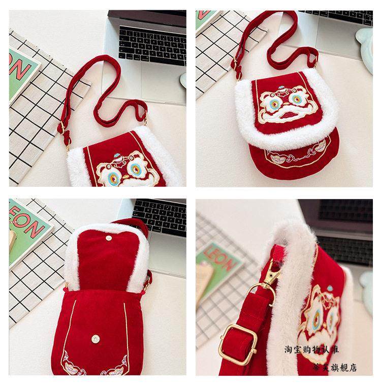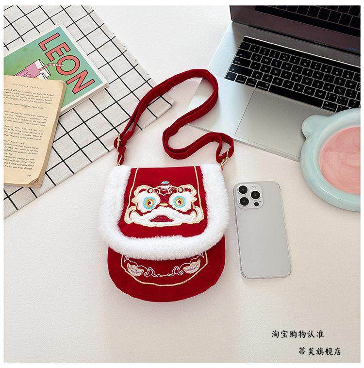 New Chinese-Style Lion Dance Embroidery Phone Bag, Unisex Red Plush-Edged Crossbody Bag, Chinese Trend New Year Lucky Money Wallet