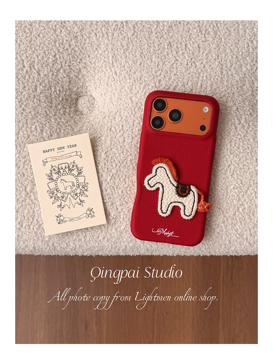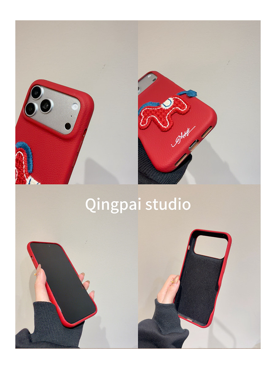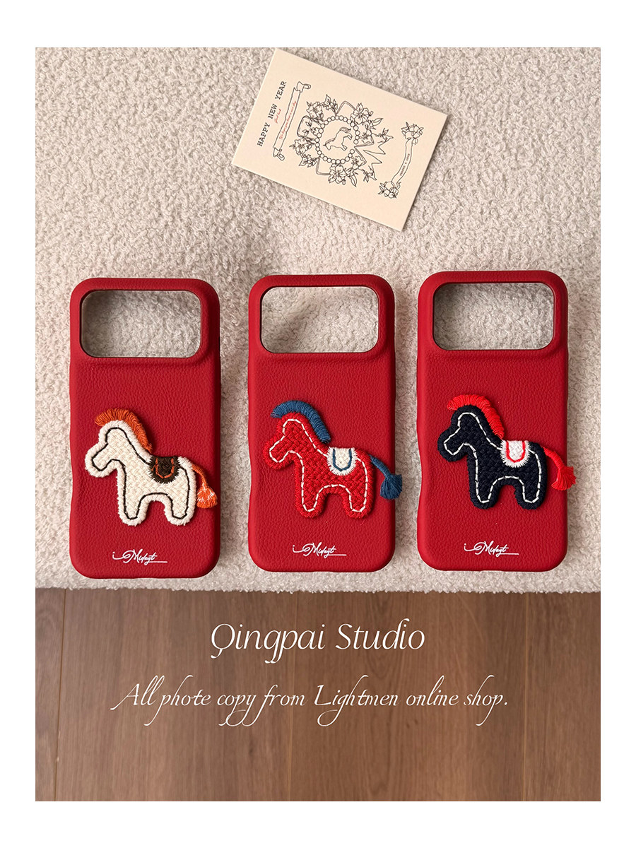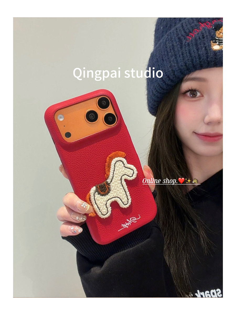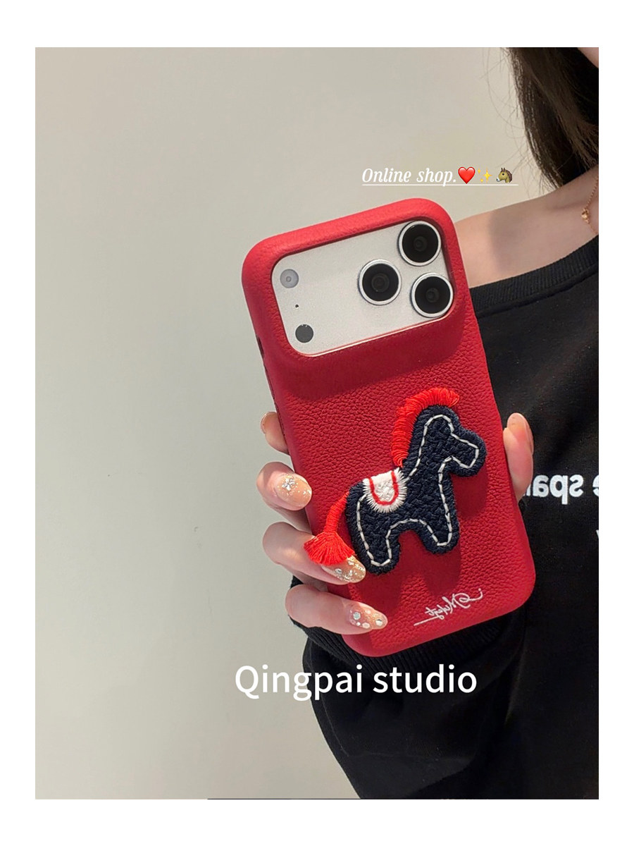 Lightweight New Year Red Embroidered 3D Pony Phone Case for Apple 17 Pro Max, iPhone 16 Pro New Model, 15 Women's Model, 14 Leather Simple Design, 13 Creative Year of the Horse Festive Full-Cover Hard Case