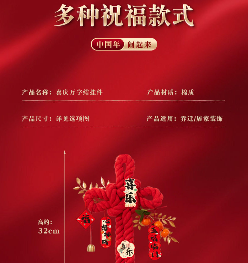 | Color Classification | Blessed New HomeāSmall Thousand Character Knot + Accessories,HousewarmingāMedium Thousand Character Knot + Accessories,Full of Gold and JadeāMedium Thousand Character Knot + Accessories,"Deluxe Edition" Is BoomingāLarge Thousand Character Knot + Accessories,"Deluxe Edition" Lion Dance BlessingsāLarge Thousand Character Knot + Accessories,"Deluxe Edition" Jia Fei Wu Run ā Medium Thousand Character Knot + Accessories |
