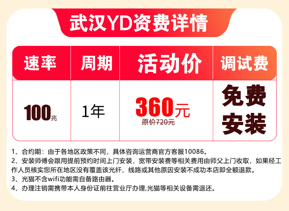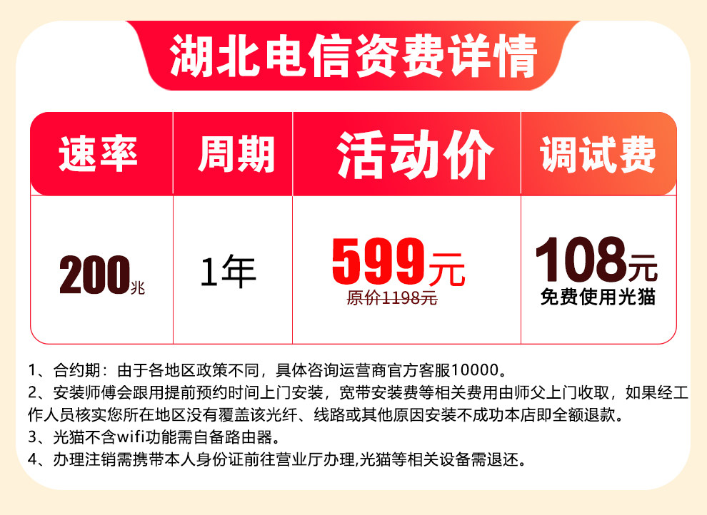 Hubei Wuhan Telecom 1000m Fiber Optic New Installation Gigabit Broadband Without Card Binding, Annual Payment
