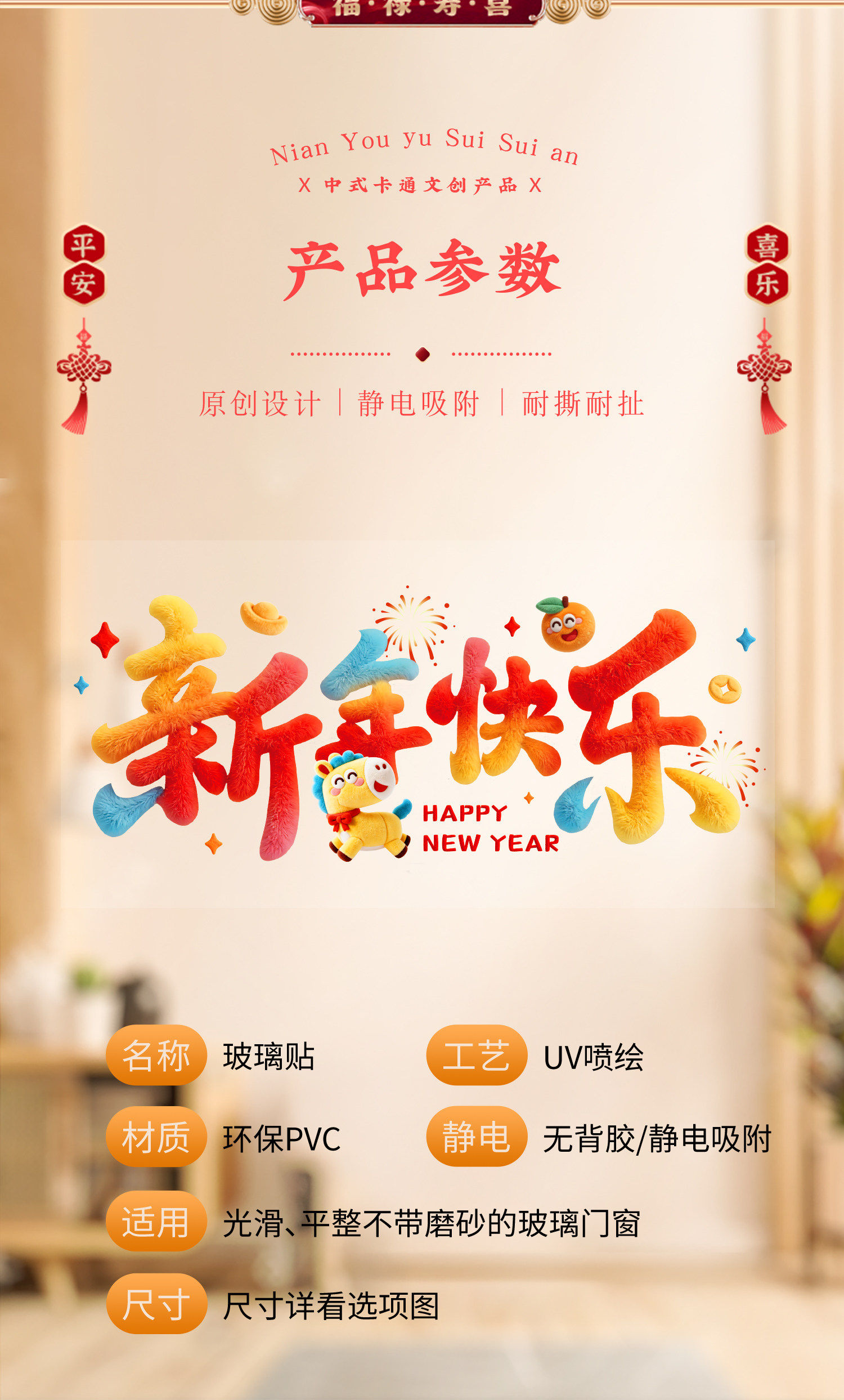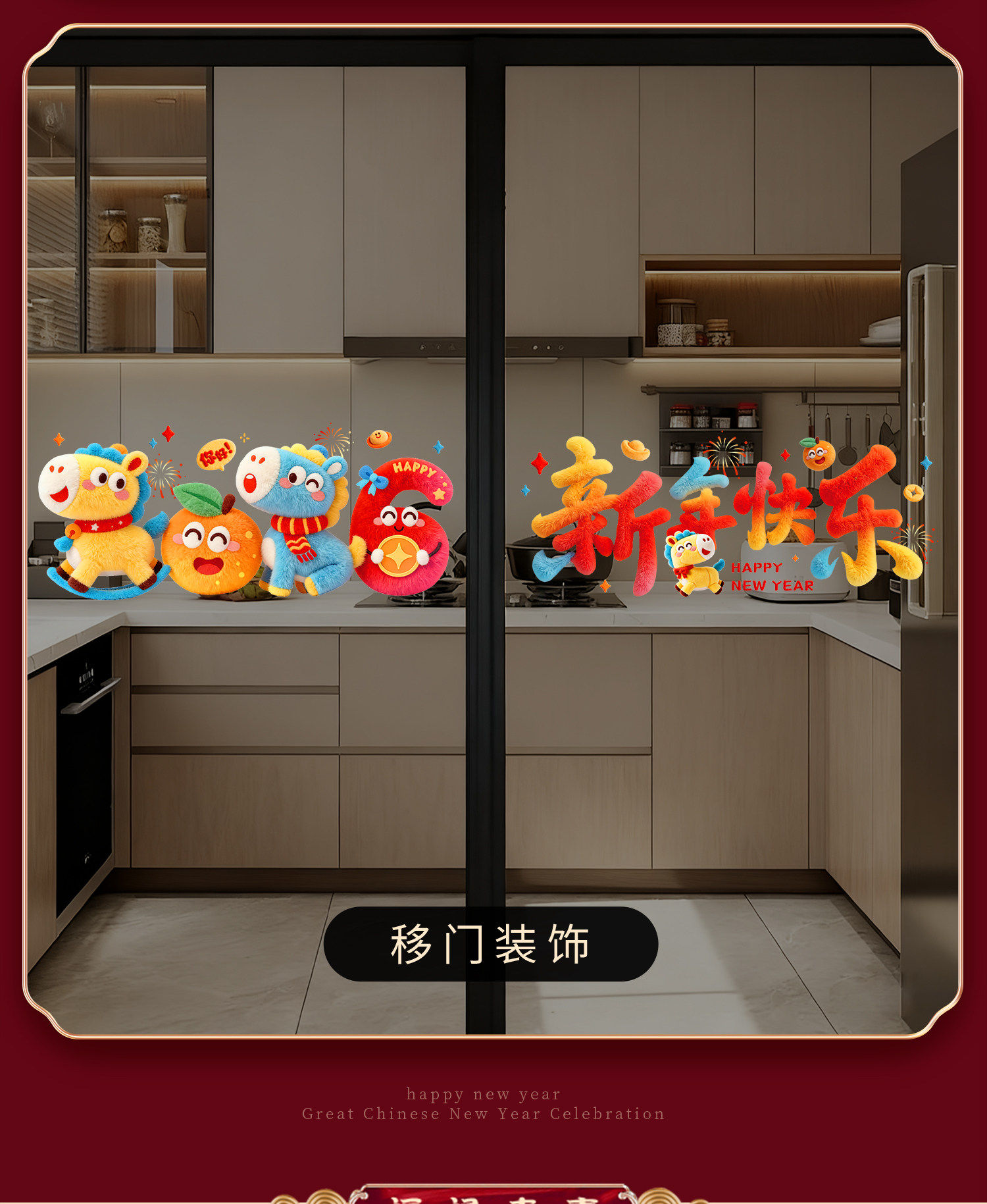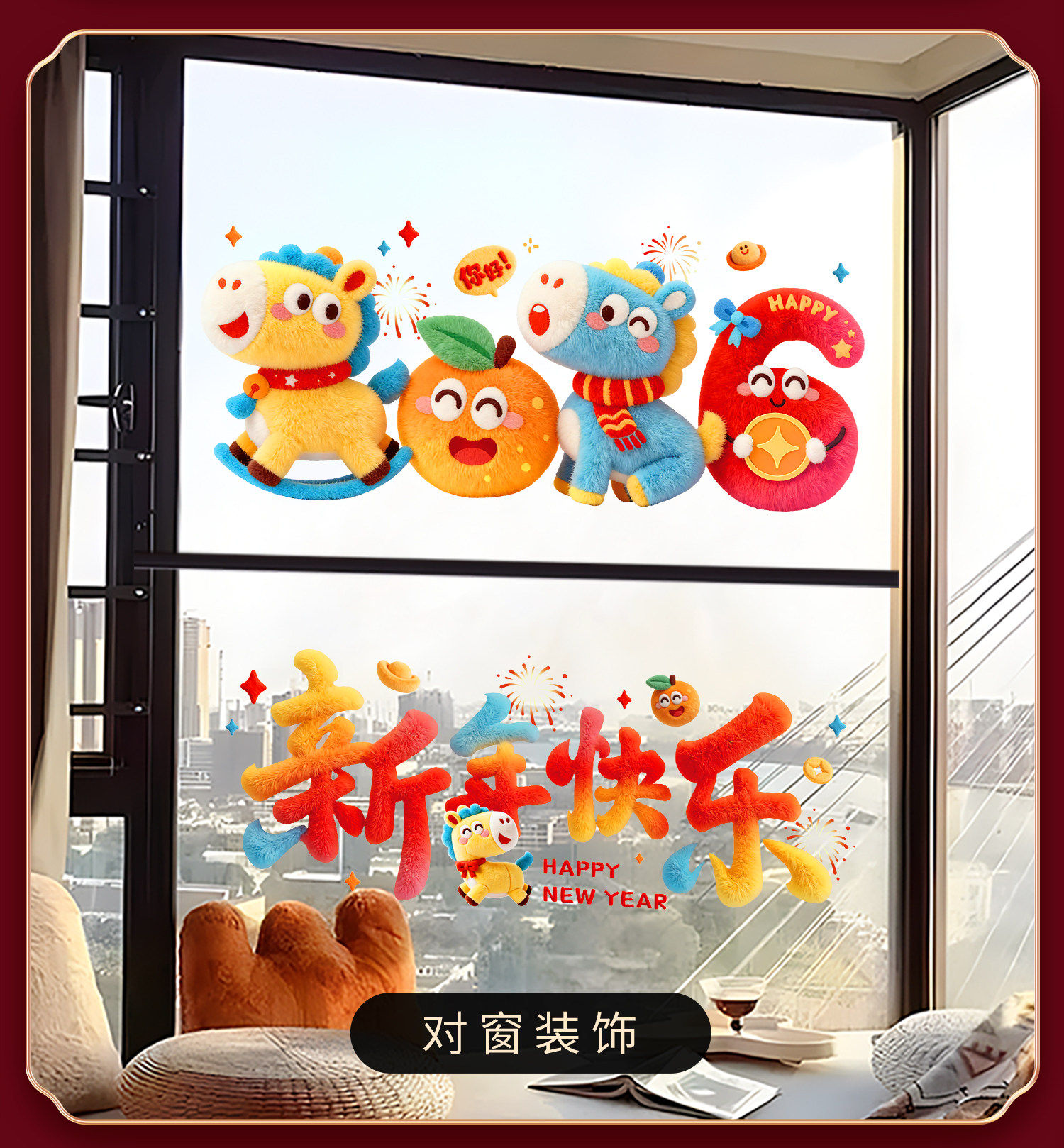 2026 Year of the Horse Happy New Year Cartoon Stickers Plush Windshield Window Decorations Festive Spring Festival New Year Decoration Static Stickers