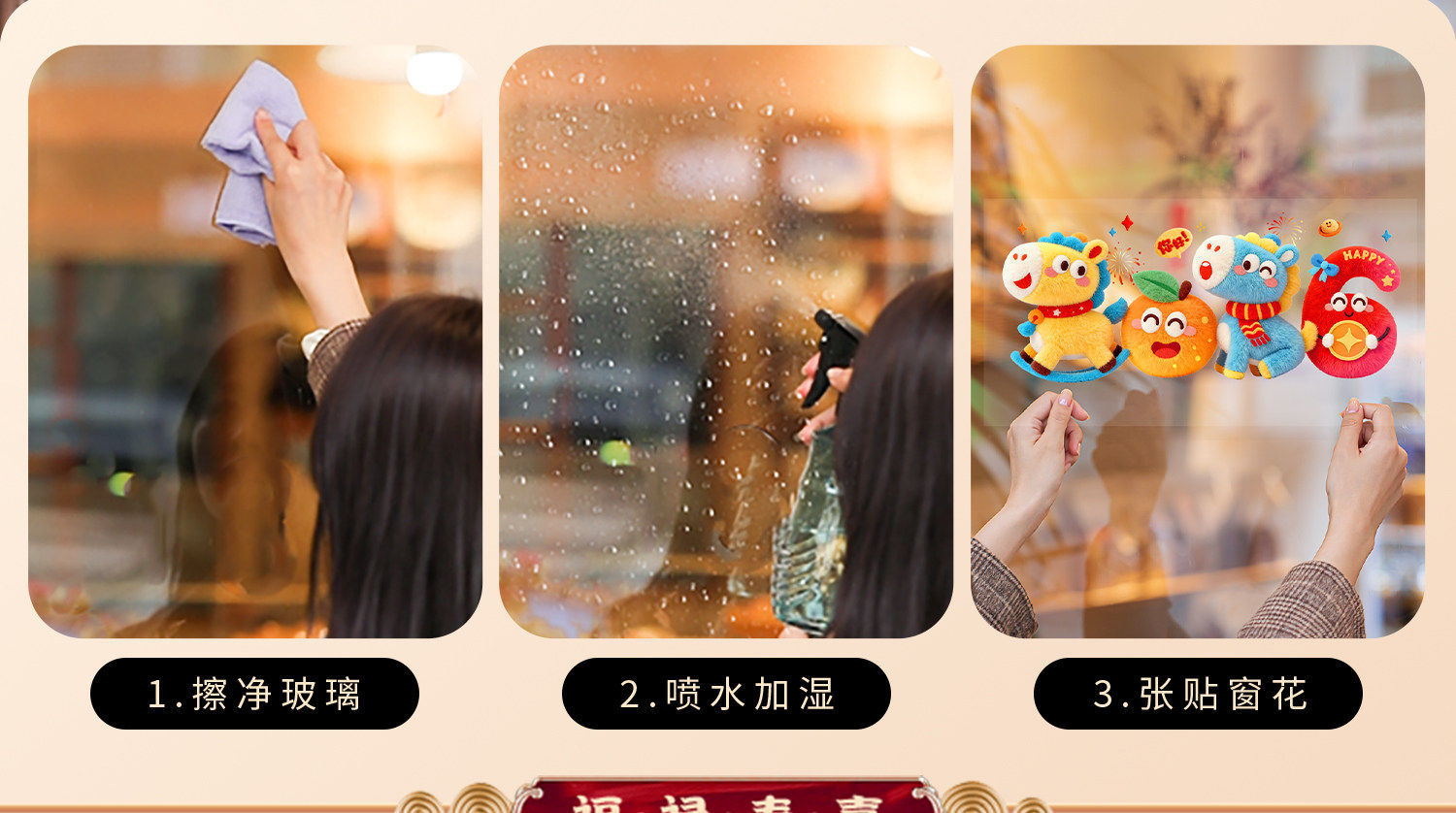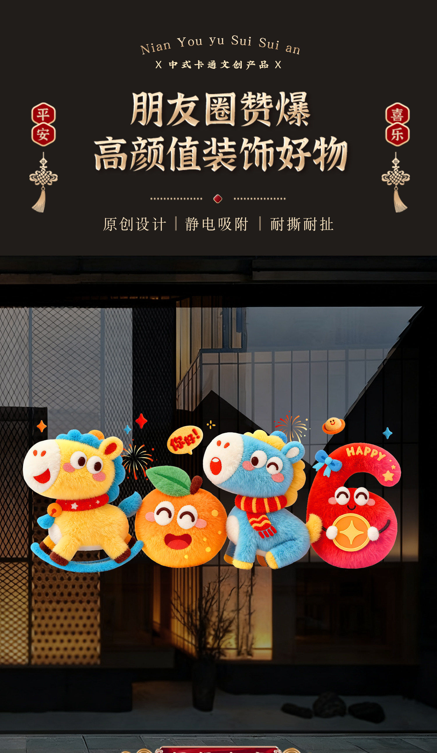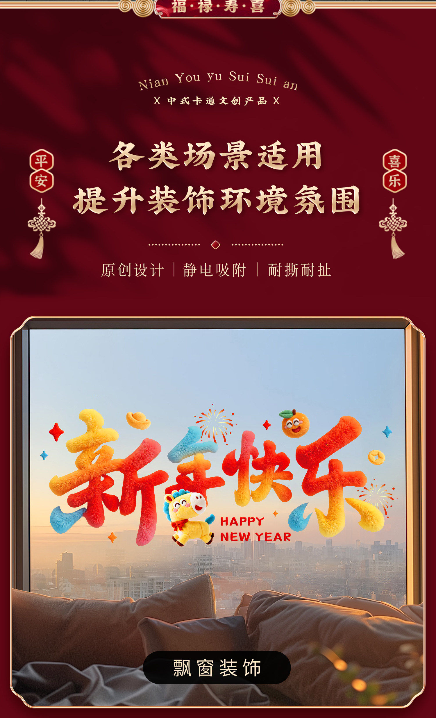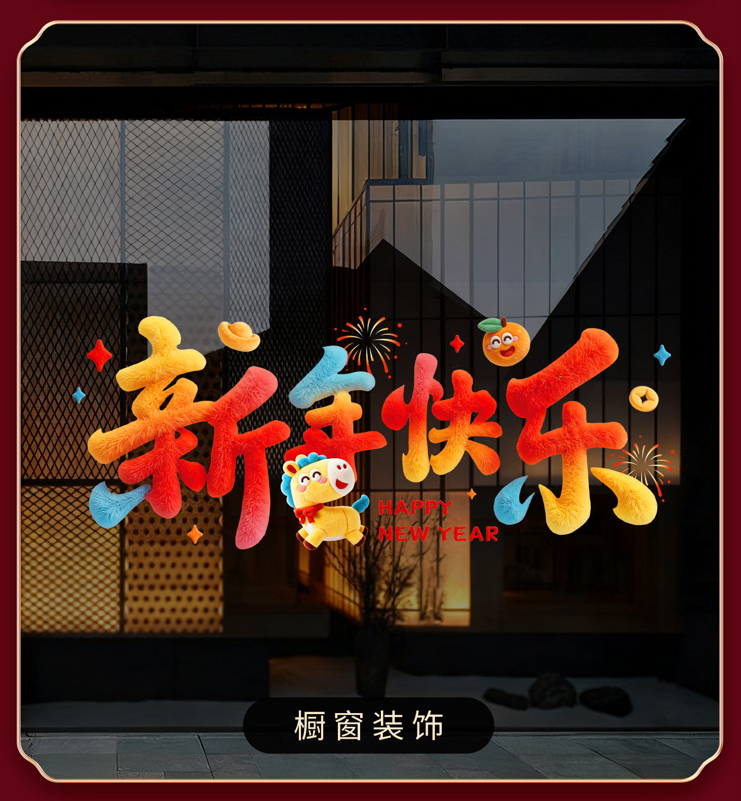 2026 Year of the Horse Happy New Year Cartoon Stickers Plush Windshield Window Decorations Festive Spring Festival New Year Decoration Static Stickers