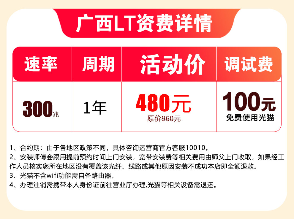 | Value-Added Services | Guangxi China Telecom Broadband [300m = 399 Yuan/Year],Guangxi Telecom Broadband [500 Megabytes = 499 Yuan/Year],Guangxi Yd Broadband [200 m = 500 Yuan/Year] - Free Installation,Guangxi Yd Broadband [300 Mbit/S = 600 Rmb/Year] - Free Installation,Guangxi Yd Broadband [500 m = 760 Yuan/Year] - Free Installation,Guangxi Yd Broadband [1000 Mbit/S = 1080 Rmb/Year] - Free Installation,Guangxi Lt Broadband [300 Megabytes = 480 Yuan/Year] |