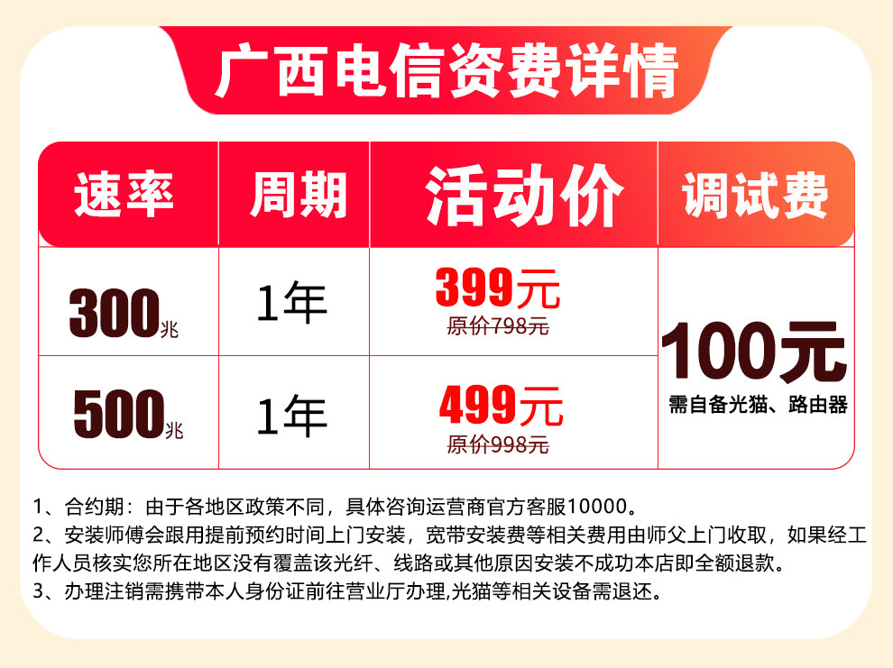 Guangxi Annual Broadband Subscription 1000m Telecom Fiber Optic New Installation Gigabit Service Without Card Binding