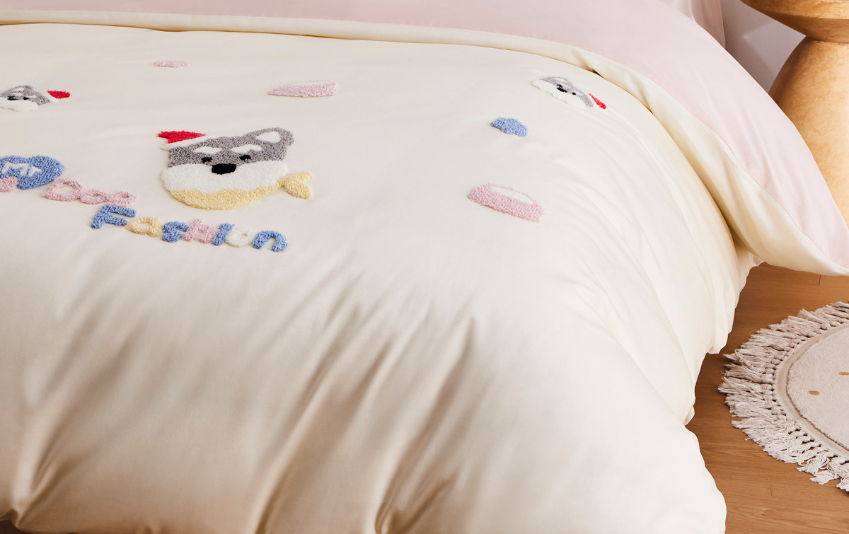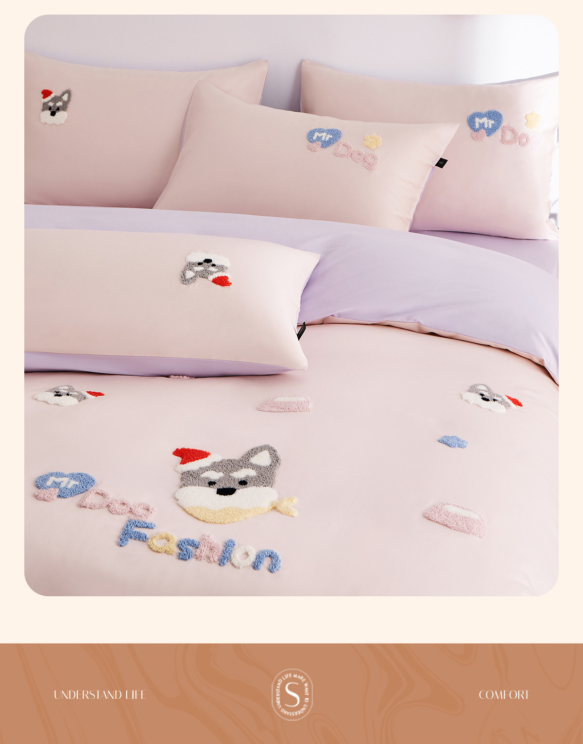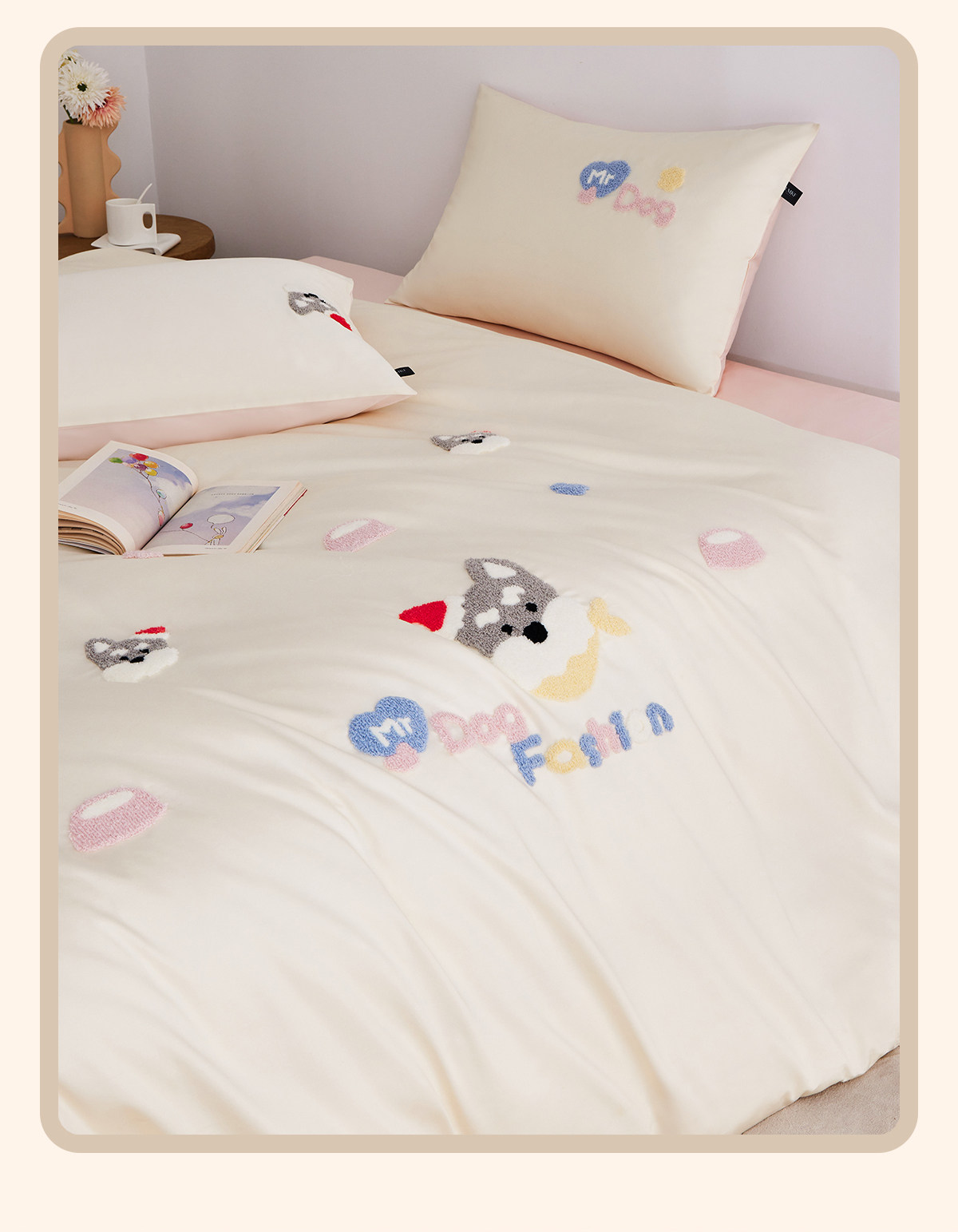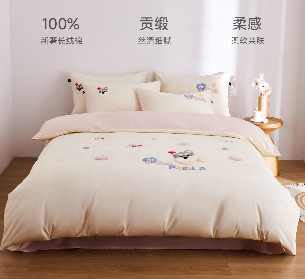 Cute Schnauzer Cartoon Towel Embroidery Four-Piece Bedding Set Pure Cotton 100Pro Satin Duvet Cover Bed Sheet Bedding
