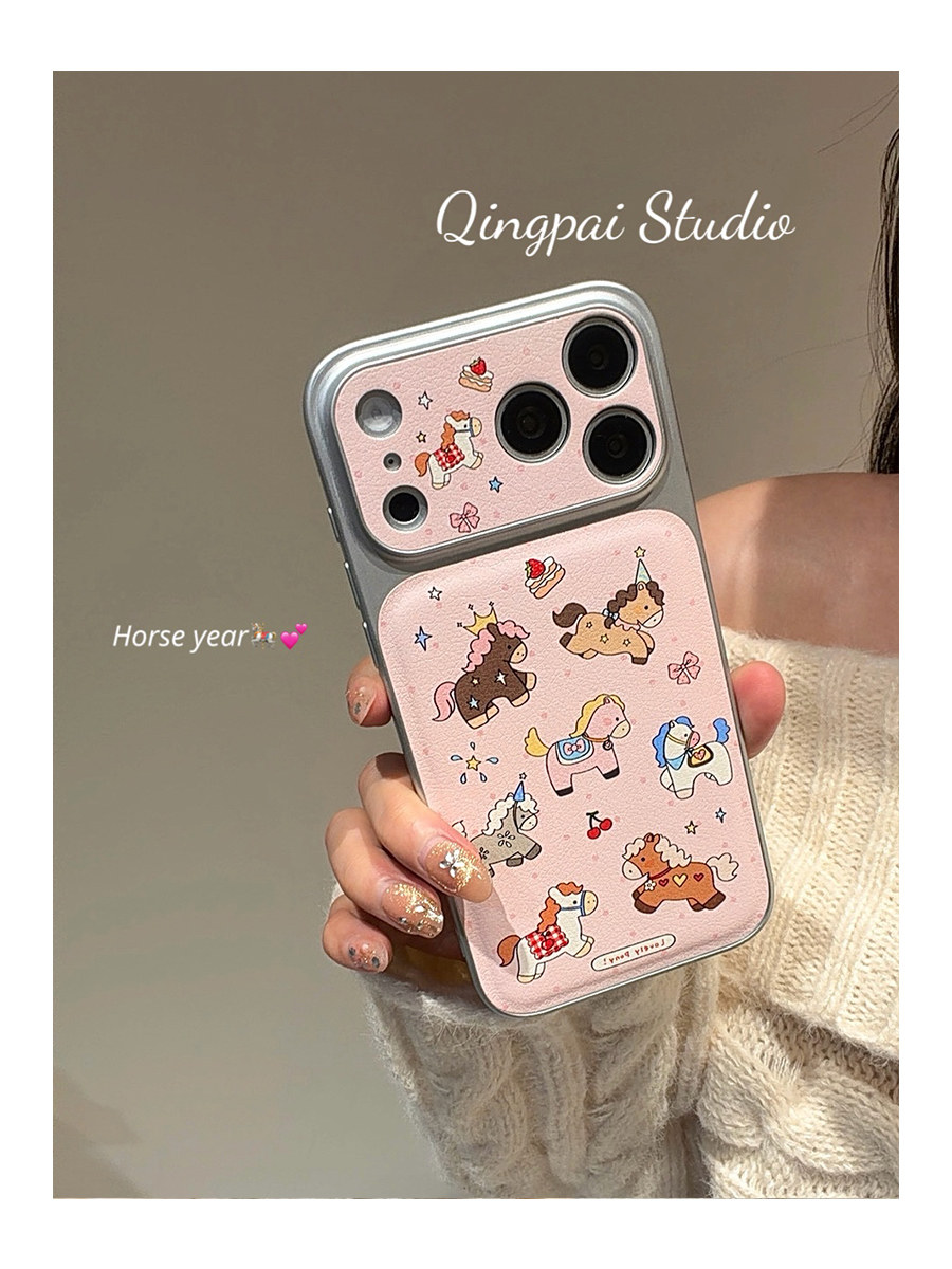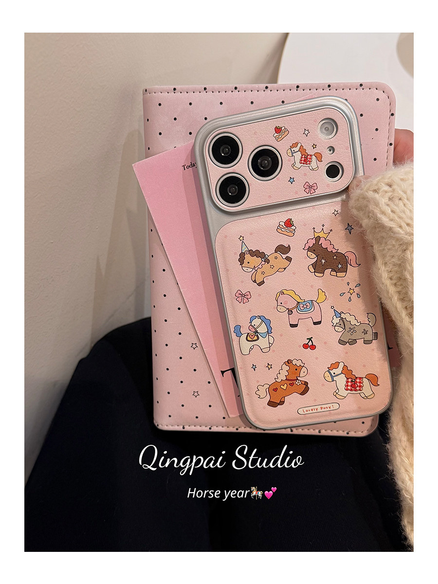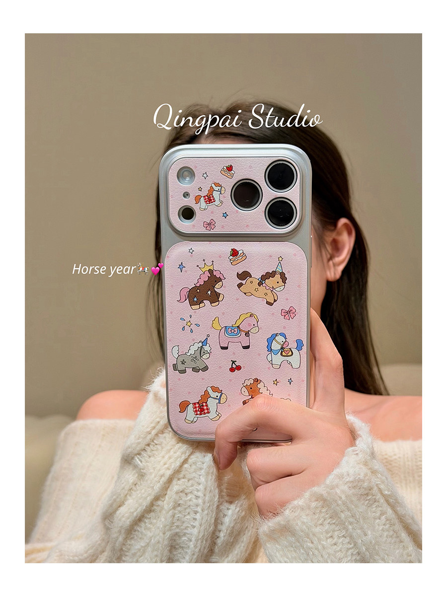 Lightweight Japanese and Korean Style Pink Graffiti Pony Phone Case Suitable for Apple 17 Pro Max, iPhone 16 Pro New Model, 15 Women's Model, 14 Cartoon Cute Creative Silver Border Large Window Full-Cover Hard Case
