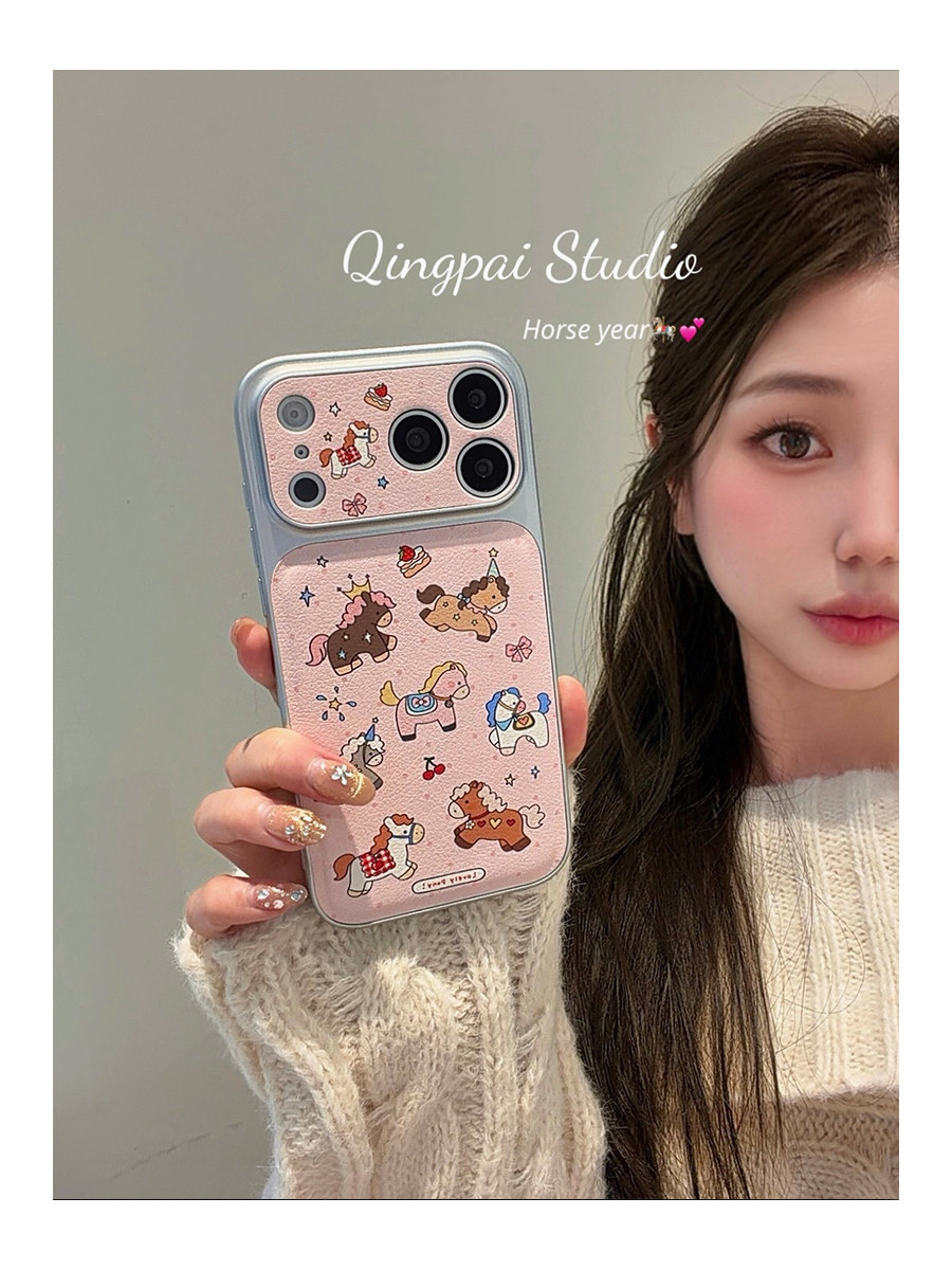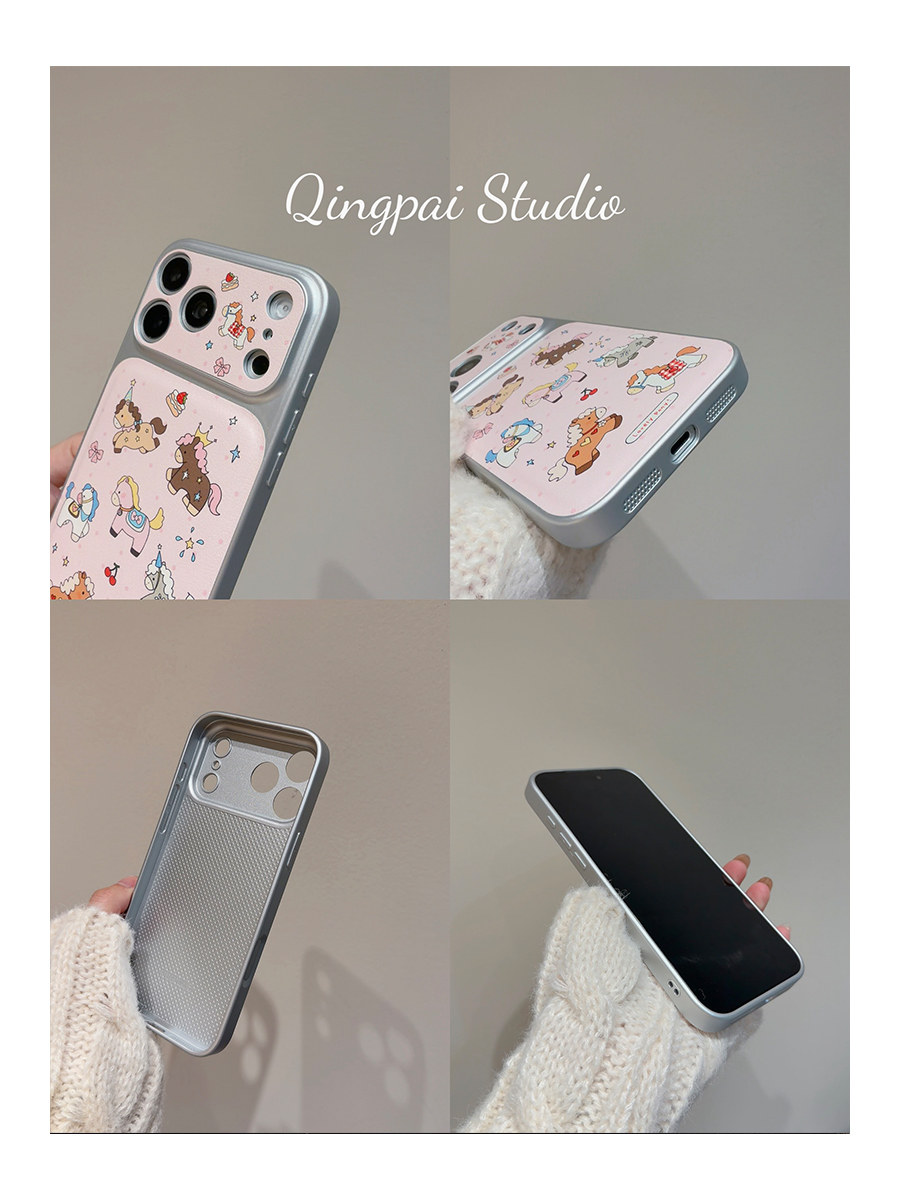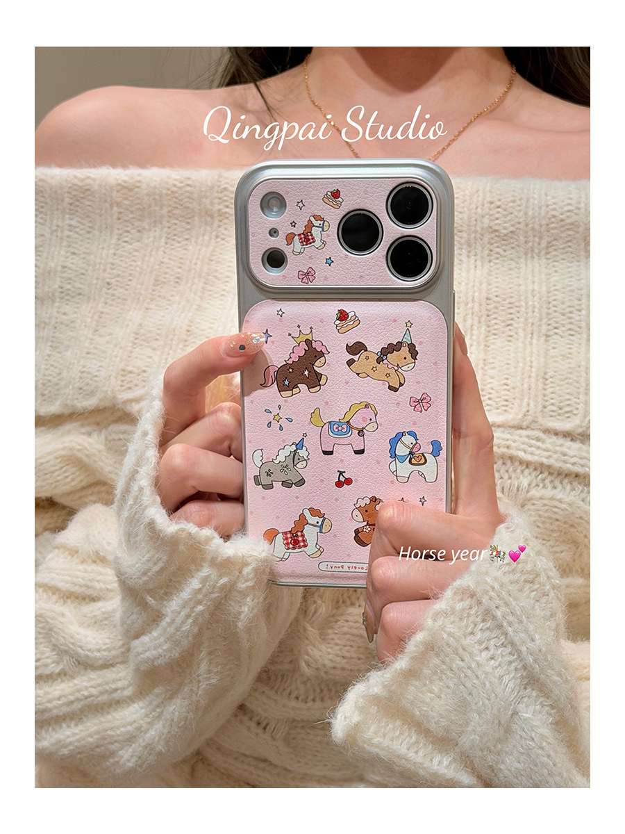 Lightweight Japanese and Korean Style Pink Graffiti Pony Phone Case Suitable for Apple 17 Pro Max, iPhone 16 Pro New Model, 15 Women's Model, 14 Cartoon Cute Creative Silver Border Large Window Full-Cover Hard Case