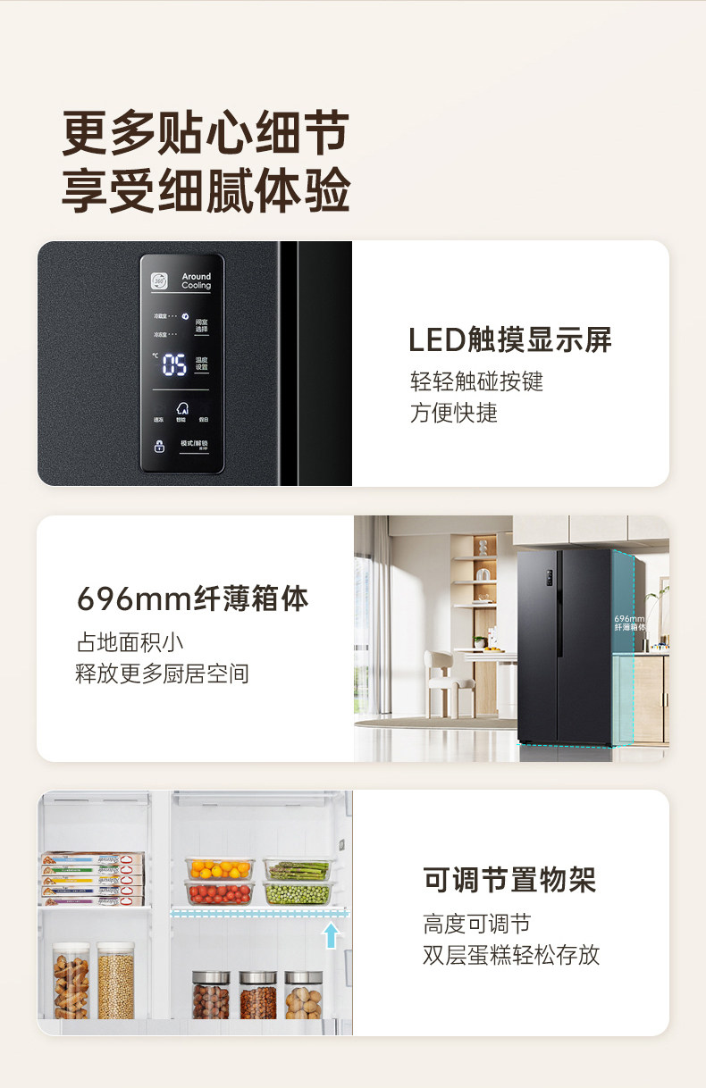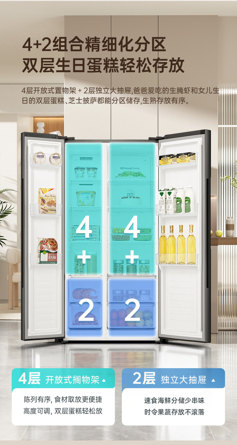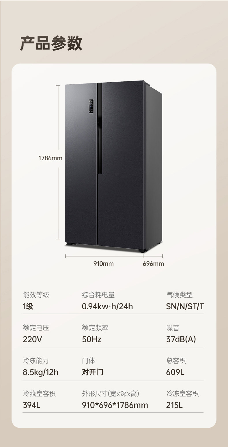 Rongsheng 609-Liter Side-By-Side Refrigerator for Home Use, First-Class Energy Efficiency, Frost-Free, Energy-Saving, Large Capacity, Self-Operated 193