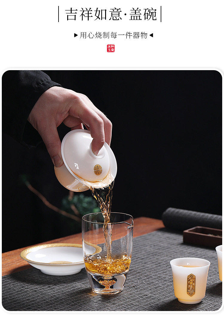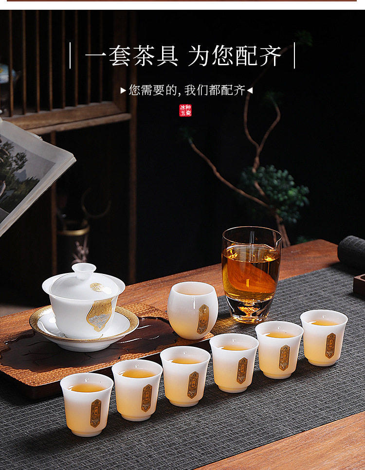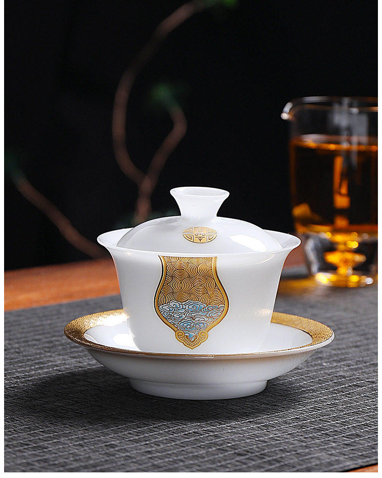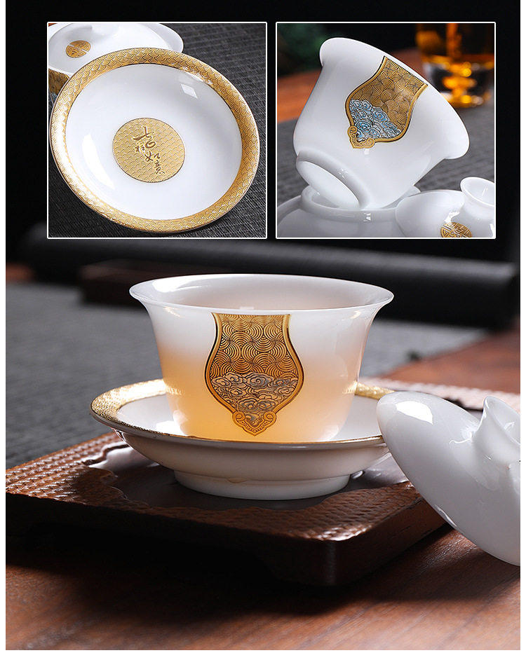 Light Luxury High-End Ice Jade Porcelain Tea Set for Home Use, Dehua Jade Porcelain with Gold-Painted Lid Bowl and Teacup, Suitable for Commercial Use and Gift Giving