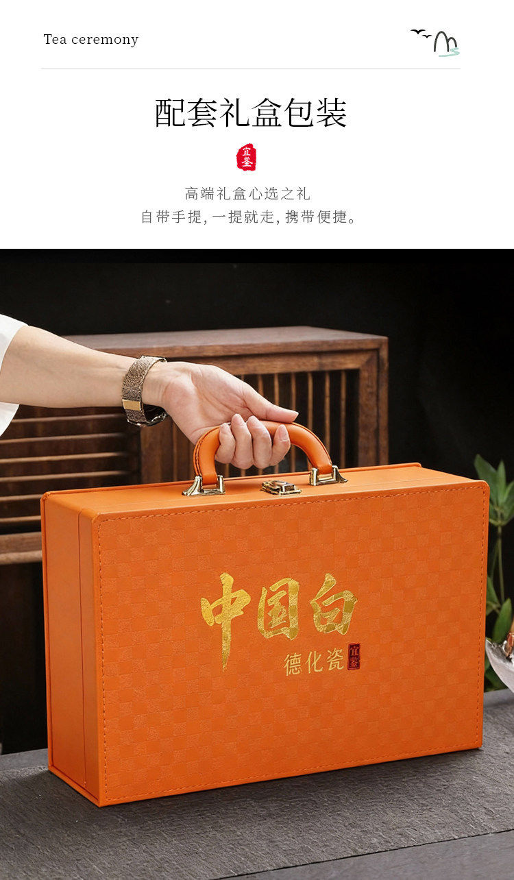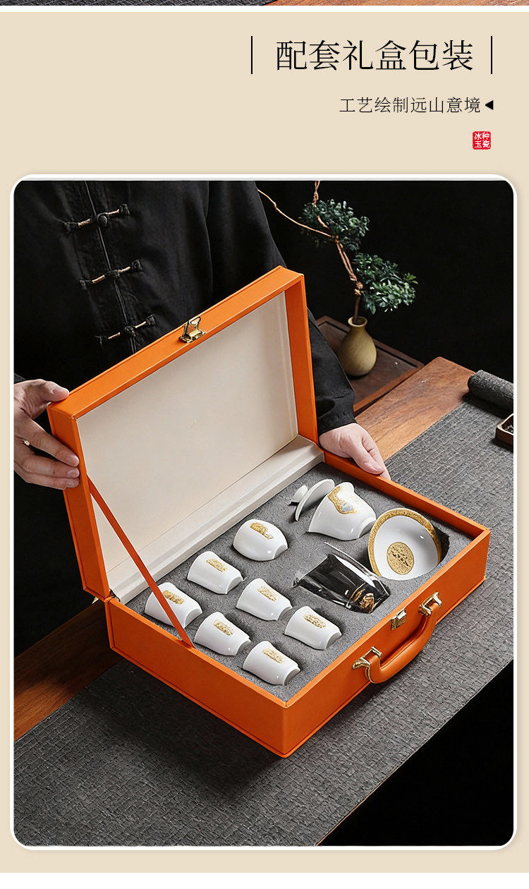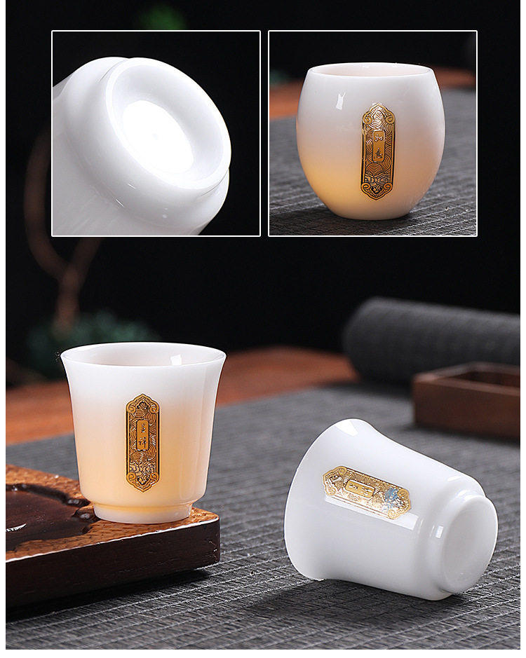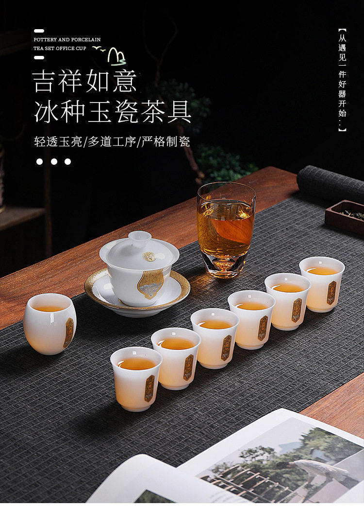 Light Luxury High-End Ice Jade Porcelain Tea Set for Home Use, Dehua Jade Porcelain with Gold-Painted Lid Bowl and Teacup, Suitable for Commercial Use and Gift Giving