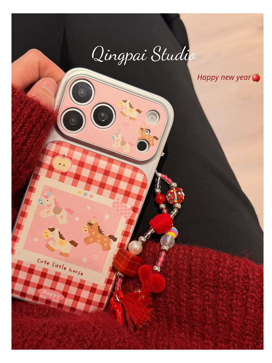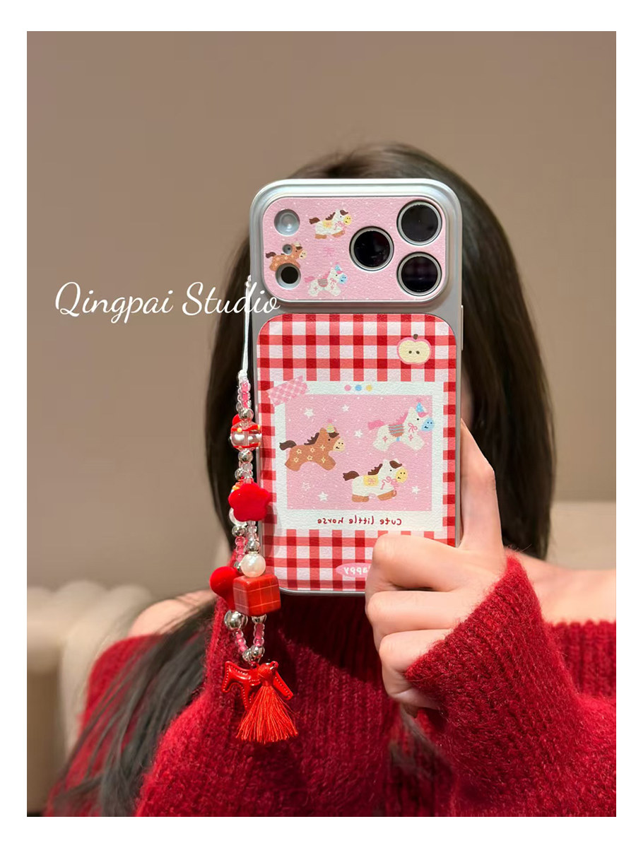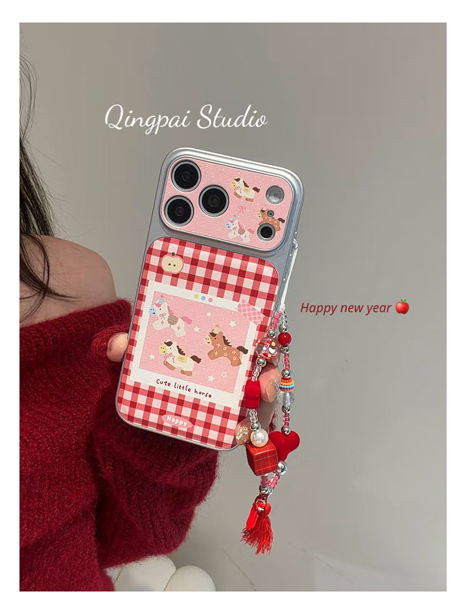 Lightweight New Year Red Plaid Pony with Chain Suitable for Apple 17 Pro Max Phone Case iPhone 16 Pro New Model 15 Women's Model 14 Silver Frame Large Window 13 Cartoon Full-Cover Hard Case