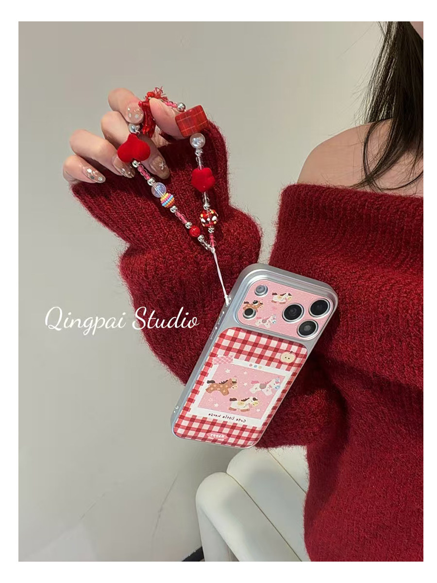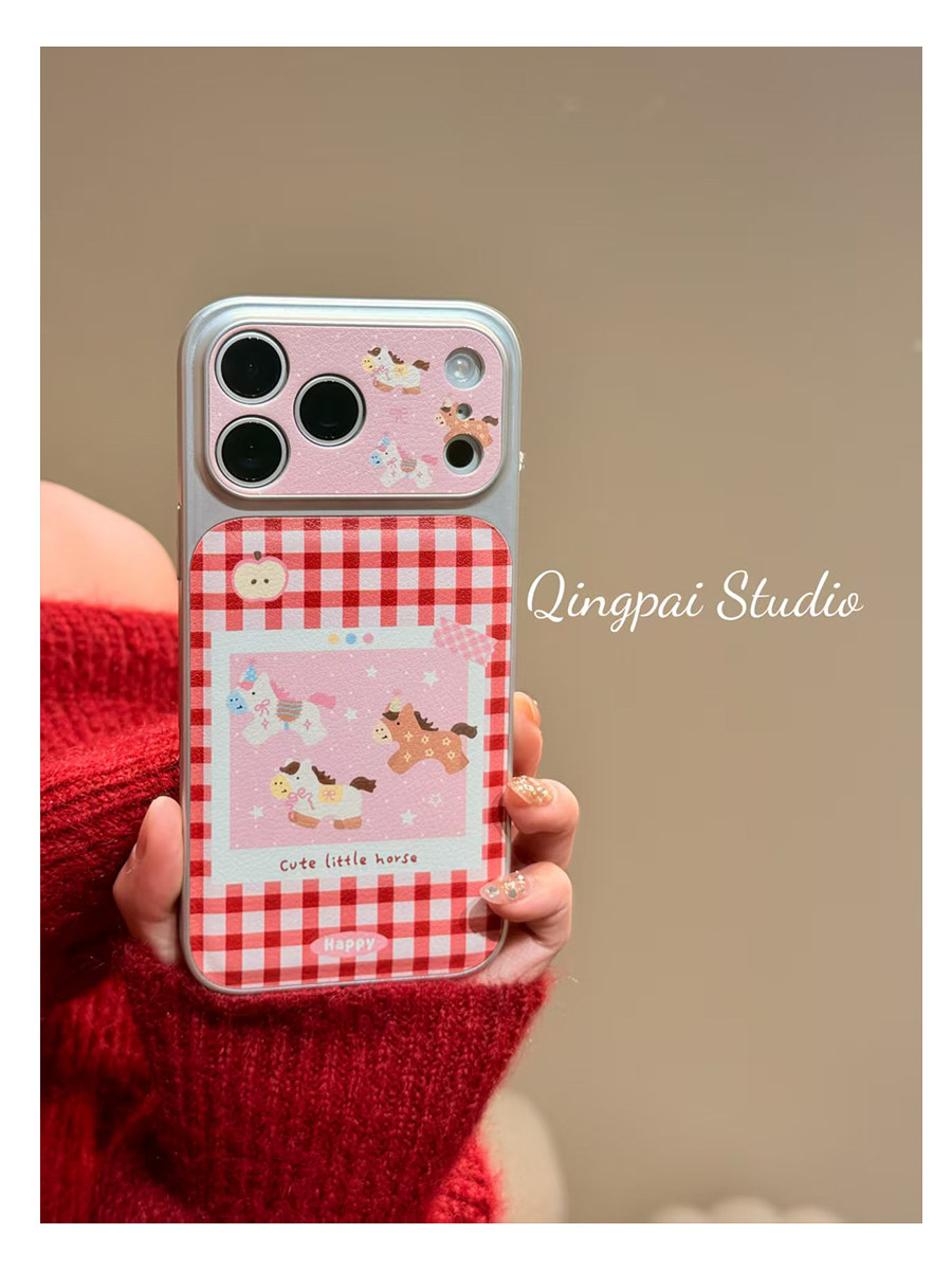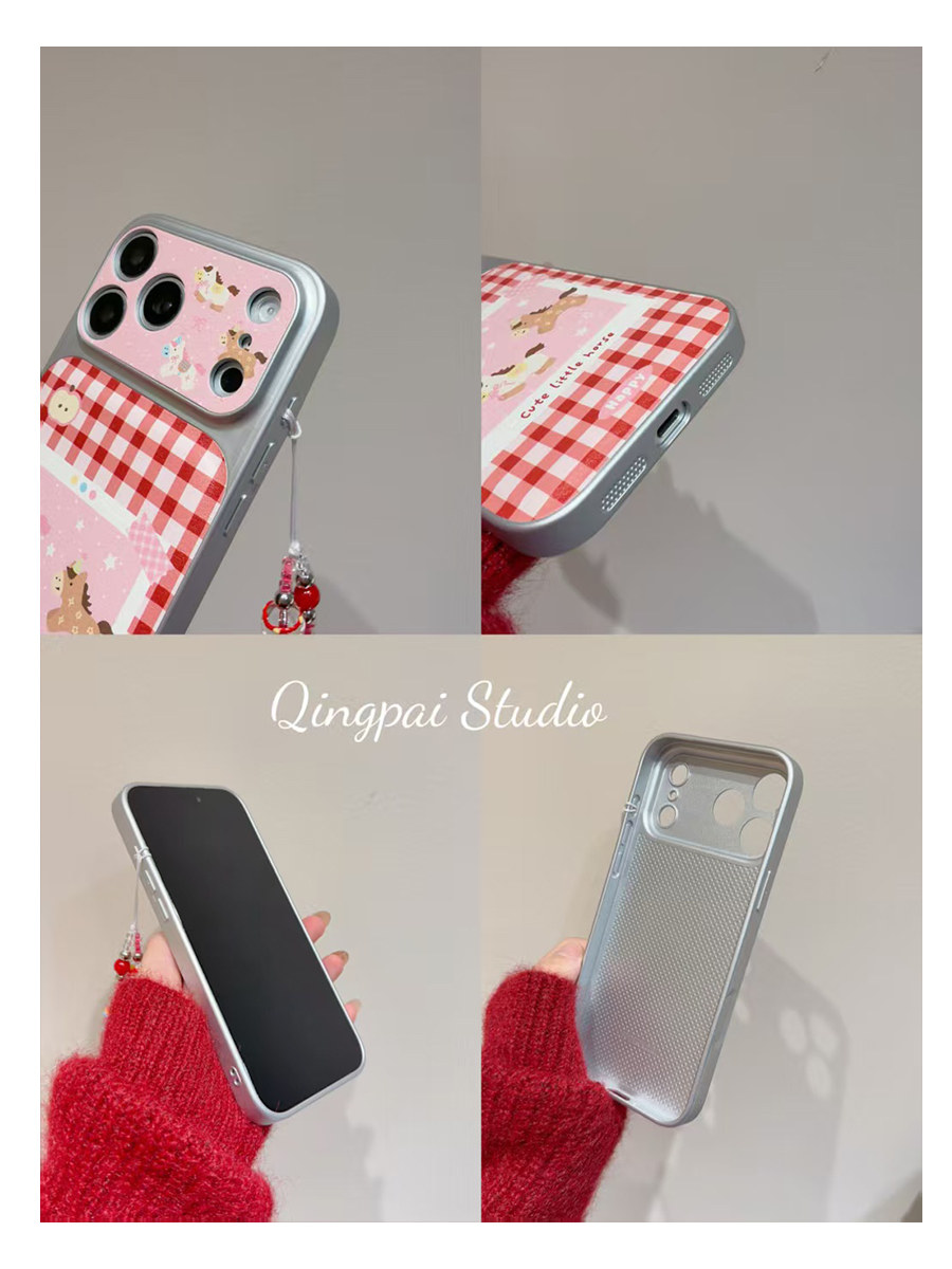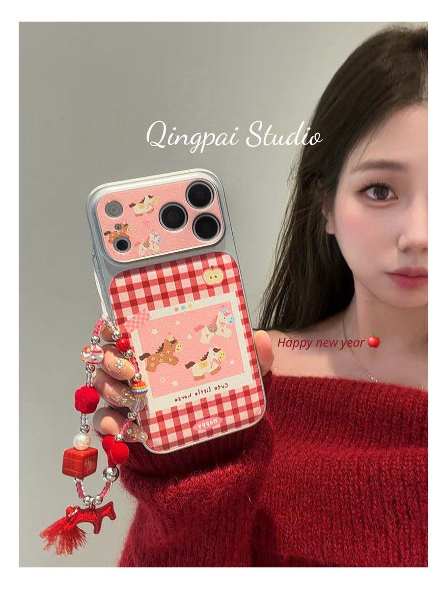 Lightweight New Year Red Plaid Pony with Chain Suitable for Apple 17 Pro Max Phone Case iPhone 16 Pro New Model 15 Women's Model 14 Silver Frame Large Window 13 Cartoon Full-Cover Hard Case
