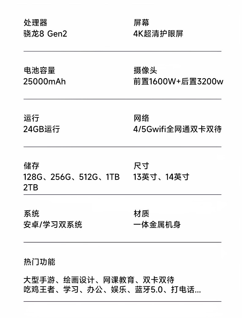 | Network Type | 【Flagship Edition】16Gb Ram + Expandable 4G/5G Cellular with Wi-Fi Connectivity,【Flagship Edition】16Gb Ram + Expandable 4G/5G Cellular with Wi-Fi Connectivity,【14inch Ultimate Edition】24Gb Ram + Expandable 4G/5G Cellular with Wi-Fi Connectivity |