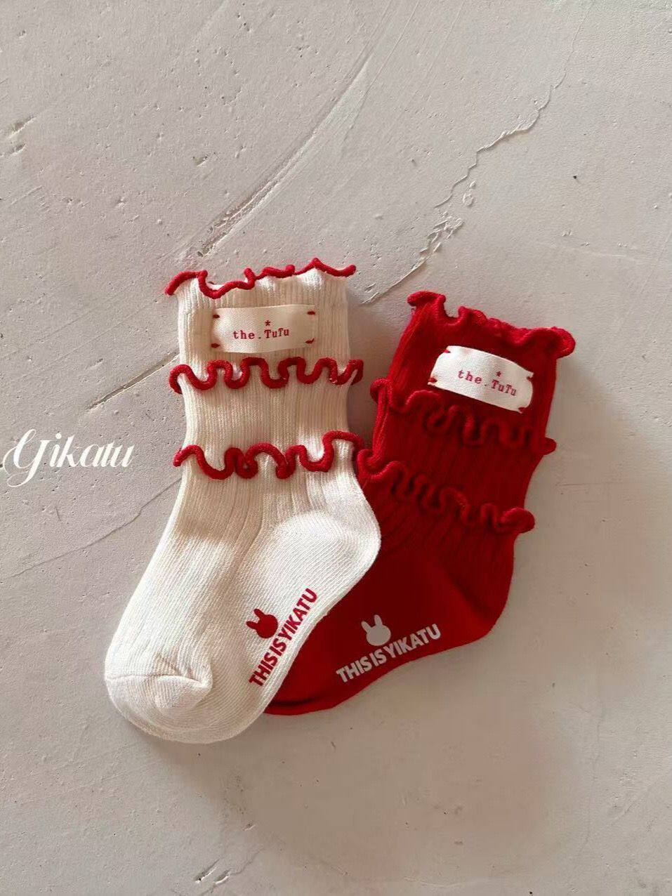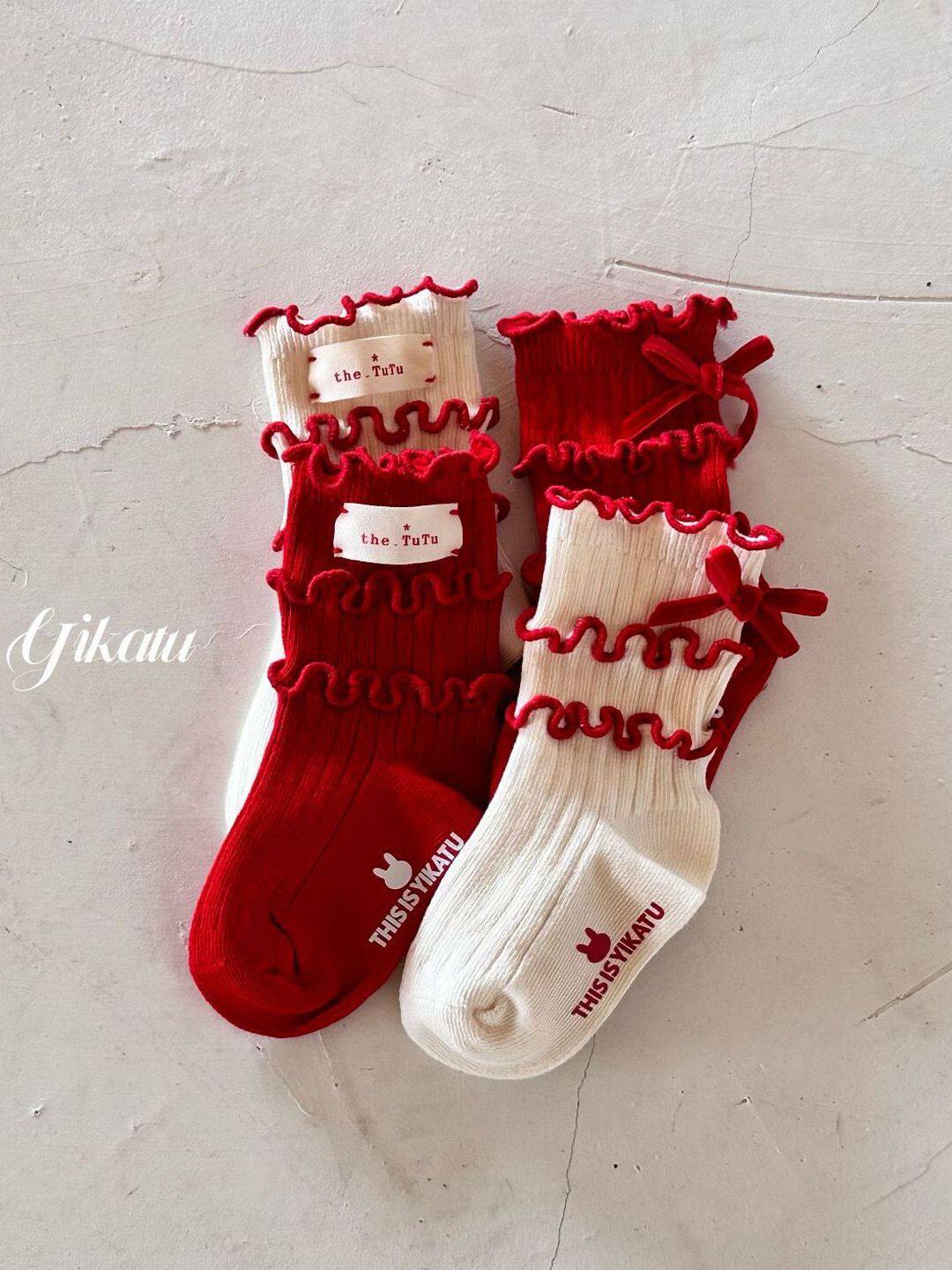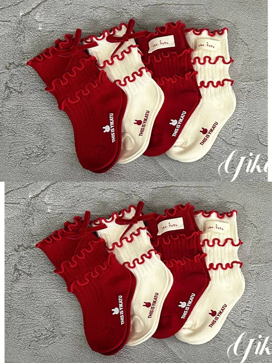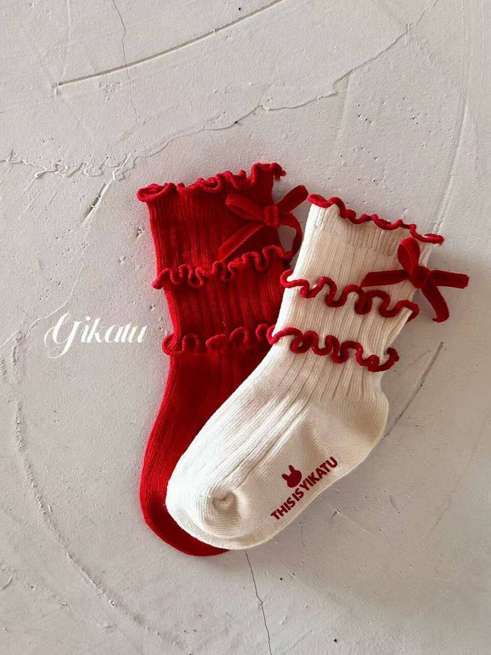 Girls' Autumn and Winter Socks, Mid-Calf Children's Socks, New Year Red Lace Bow Princess Stylish Girl Baby Lace Socks