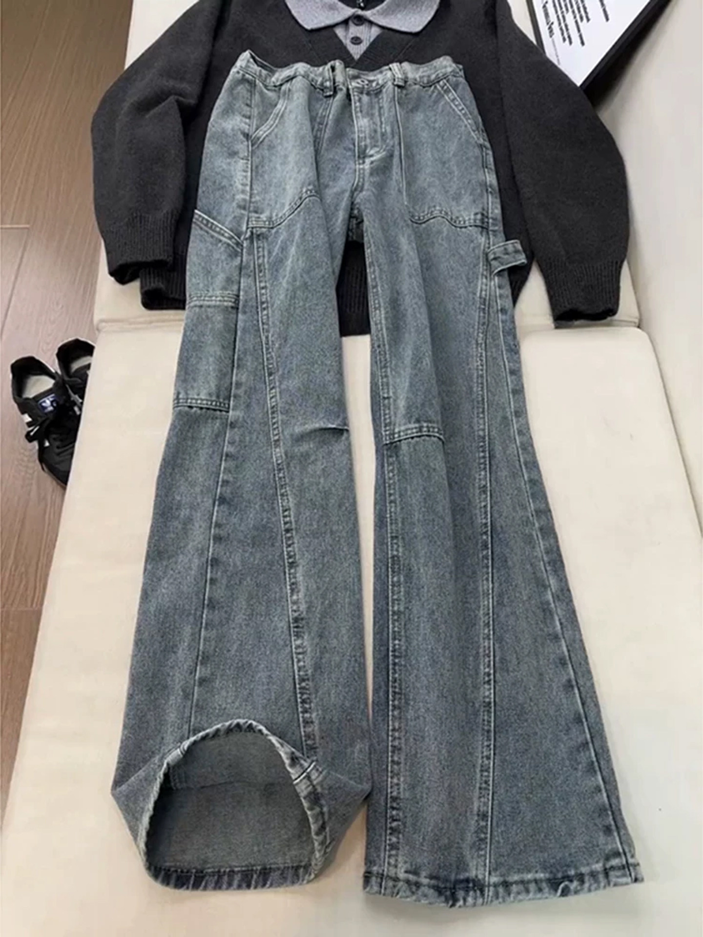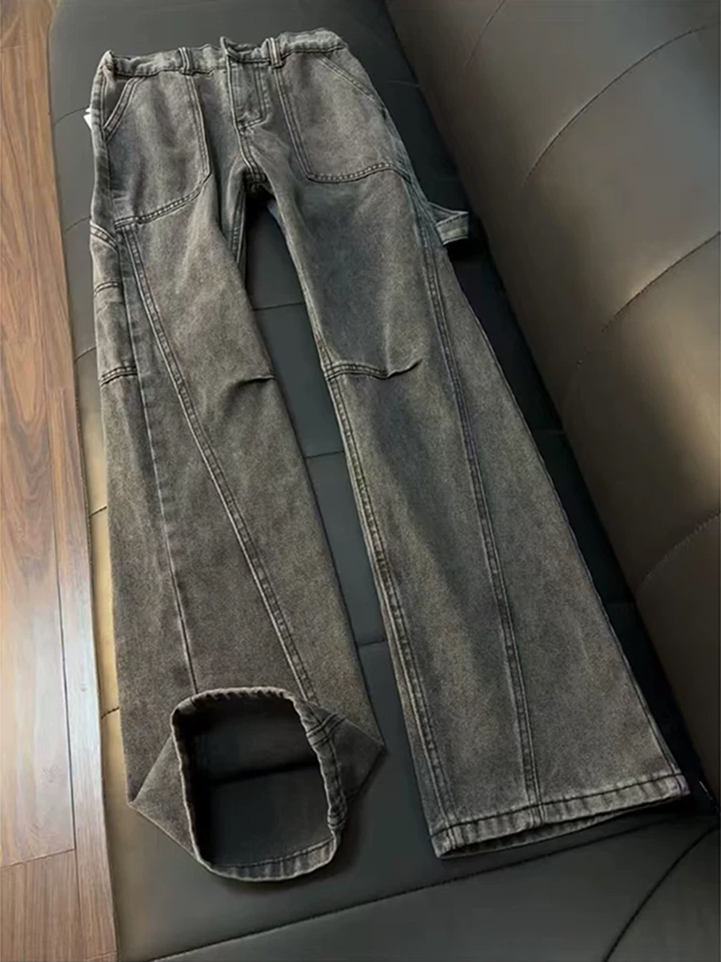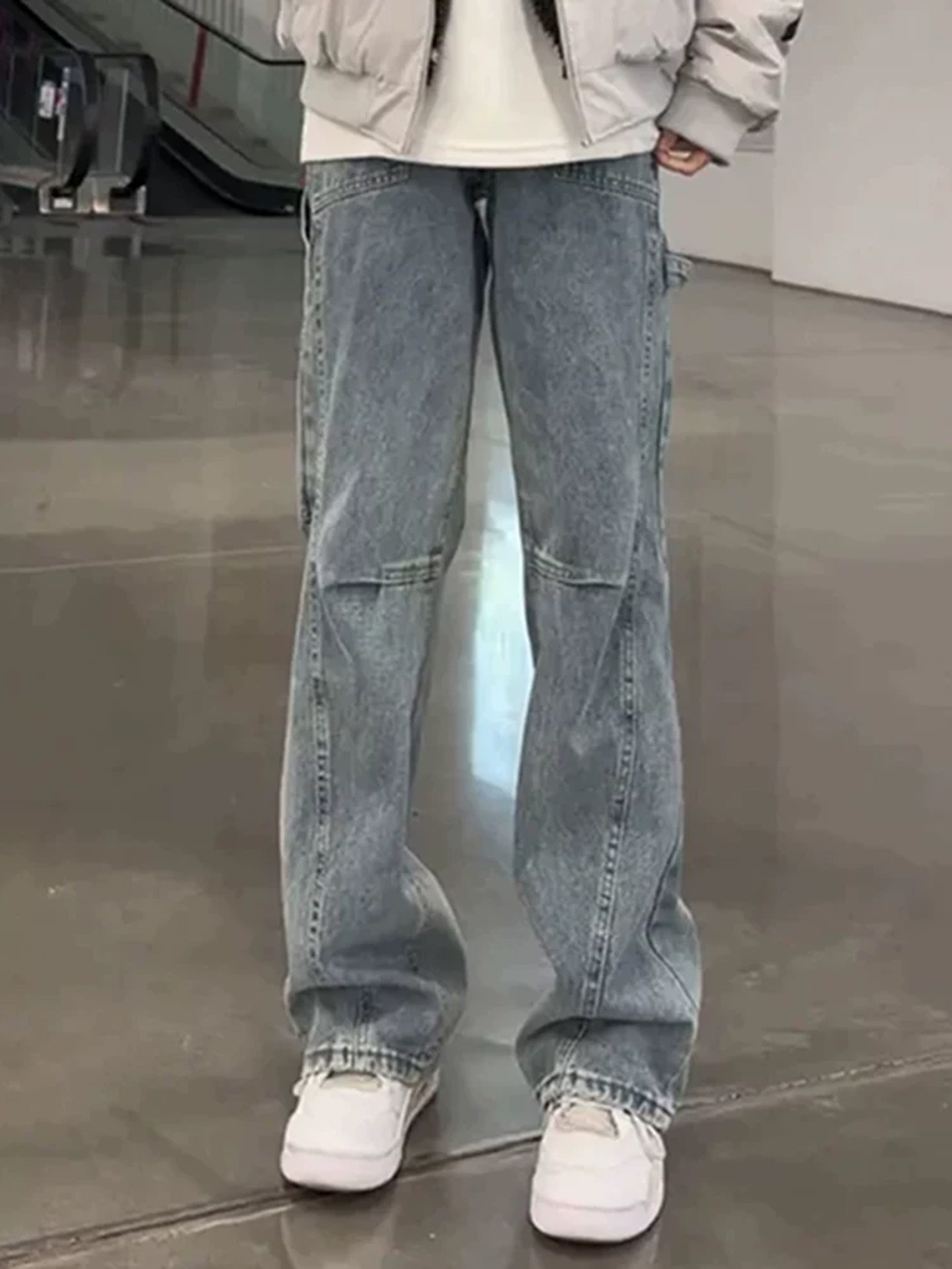 Light Blue Diagonal Cut Flared Jeans for Men, Winter Cool Vibe Pants, American High Street Straight-Leg Lumberjack Work Pants