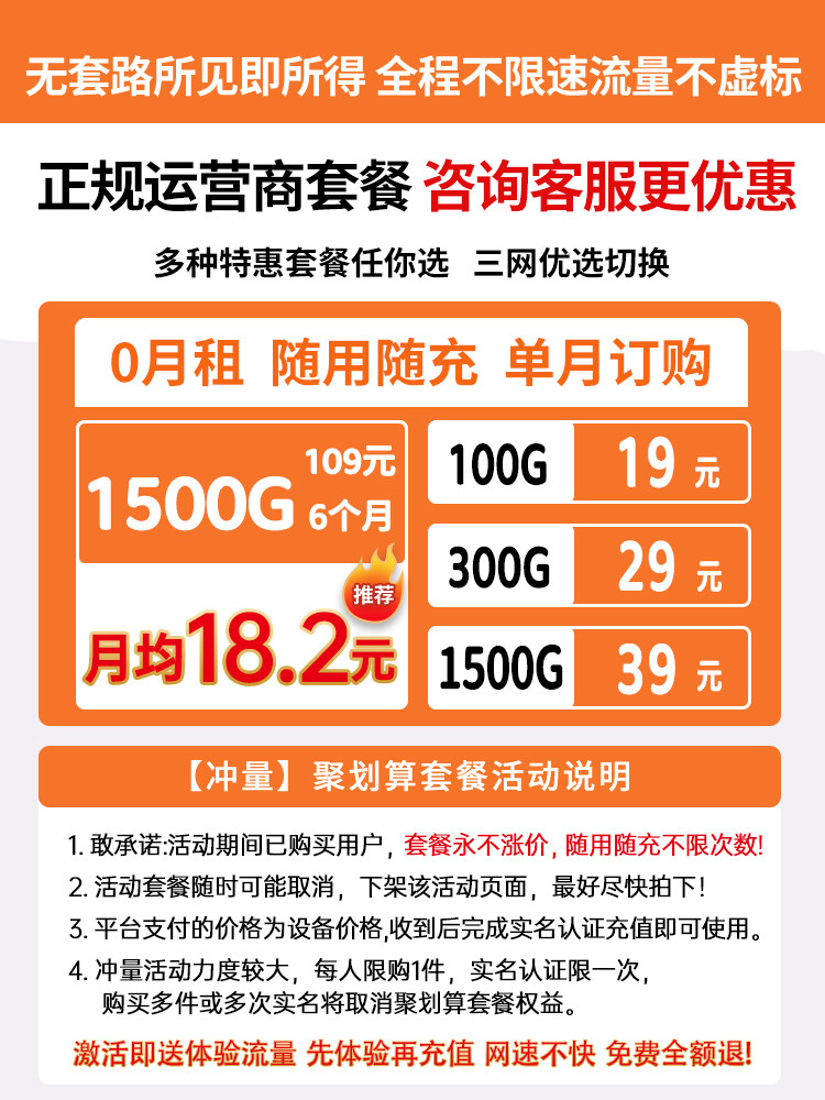 | Data Plan | 1500G/Month*12 Months,1500G/Month*1 Month,300G/Month*1 Month,100G/Month*1 Month |