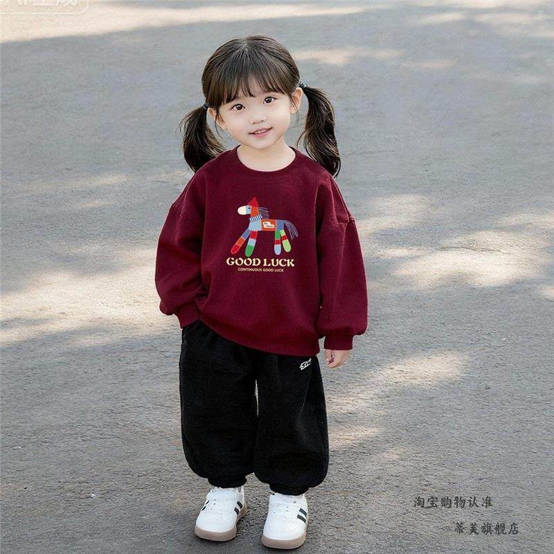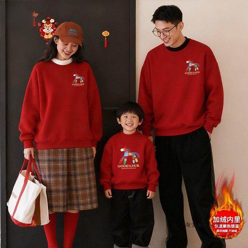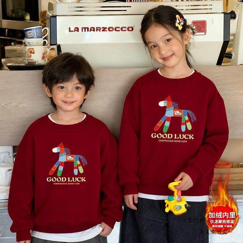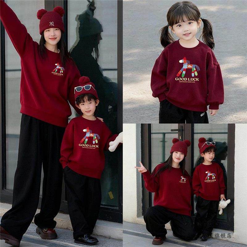 2026 Year of the Horse Cartoon Parent-Child Outfit Cute Printed Fleece-Lined Thickened Crewneck Sweatshirt Festive Bright Red Mother-Daughter Matching Outfit Trendy