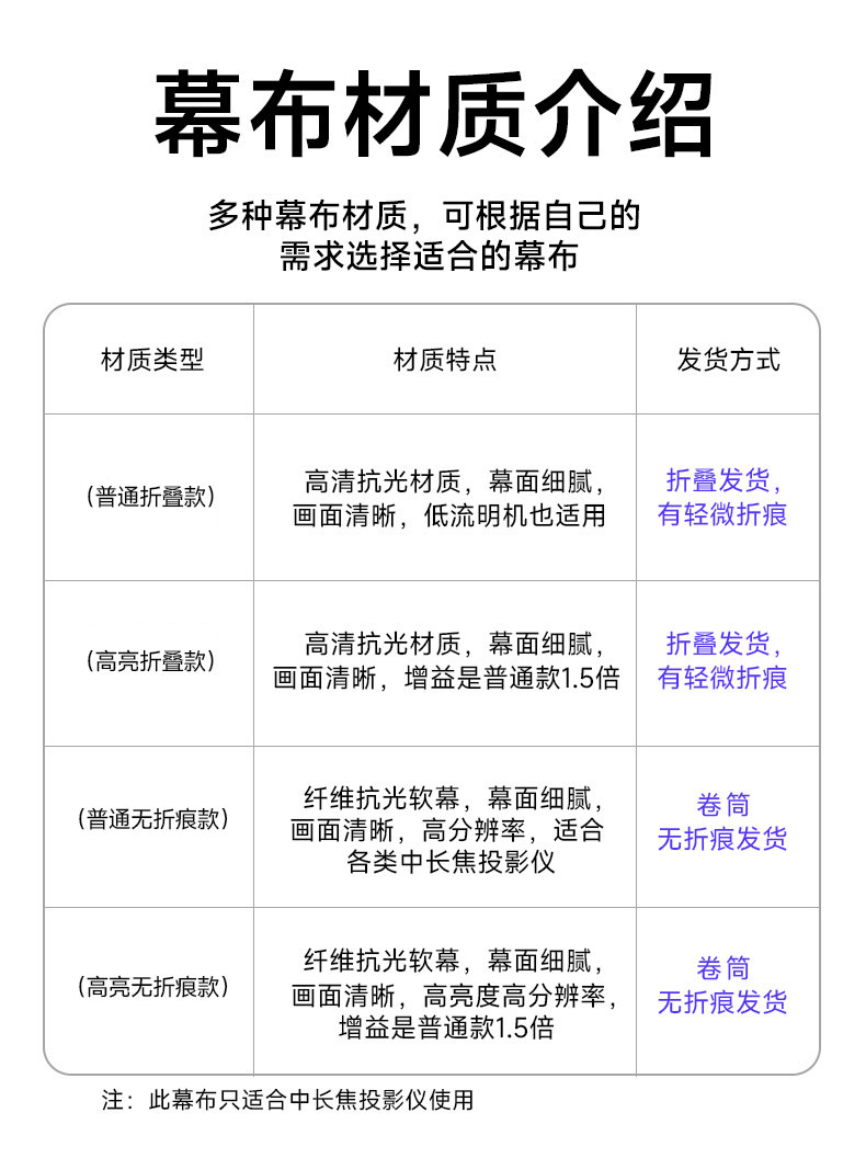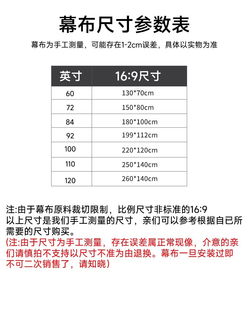 | Size/Processing Method | 120 Inches 16:9 Free Velcro,100 Inches 16:9 Free Velcro,84 Inches 16:9 Free Velcro,60 Inches 16:9 Free Velcro,72 Inches 16:9 Free Velcro |