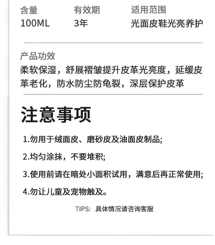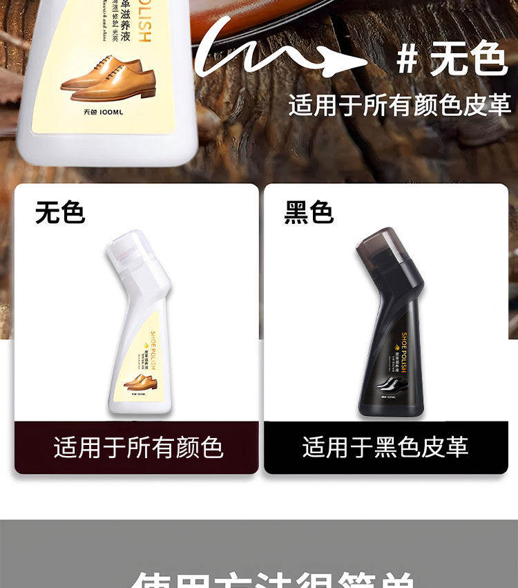| Color Classification | [100ml Leather Nourishing Liquid] Black,[100ml Leather Nourishing Liquid] Colorless,[100ml Leather Nourishing Liquid] Black*2,[100ml Leather Nourishing Liquid] Colorless*2,[100ml Leather Nourishing Liquid] Black + Colorless,[100ml Leather Nourishing Liquid] Black*4,[100ml Leather Nourishing Liquid] Colorless*4,[100ml Leather Nourishing Liquid] Black*2+Colorless*2 |