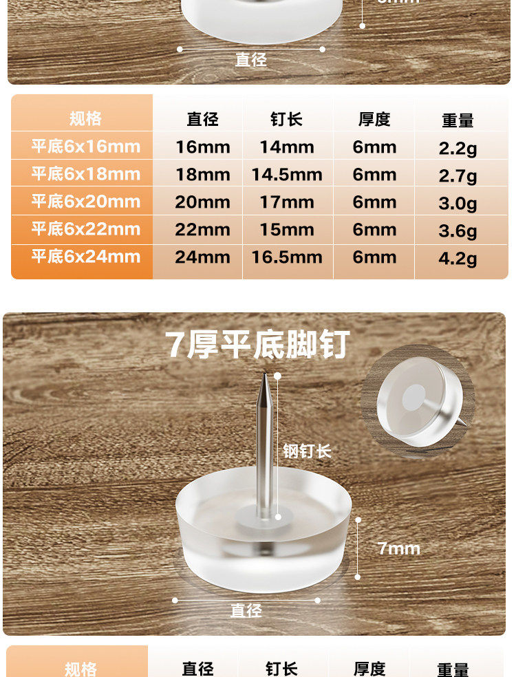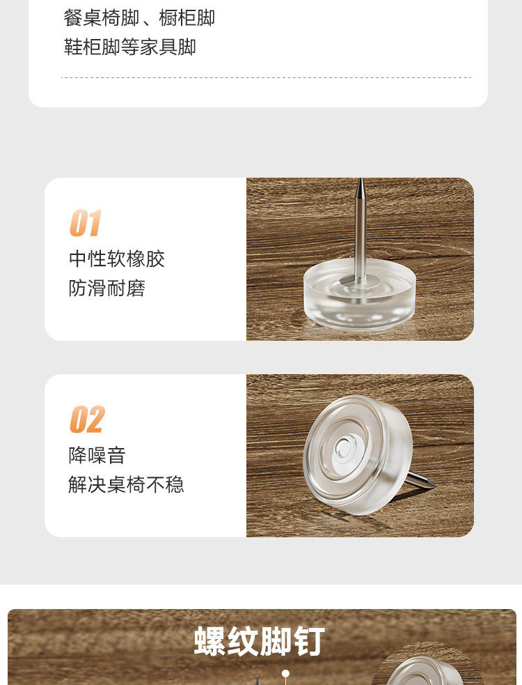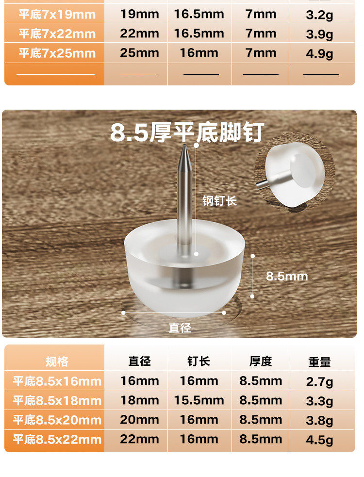 | Color Classification | Flat Bottom 6*16 [Pack of 20] Anti-Slip,Flat Bottom 6*18 [Pack of 20] Anti-Slip,Flat Bottom 6*20 [Pack of 20] Anti-Slip,Flat Bottom 6*22 [Pack of 20] Anti-Slip,Flat Bottom 6*24 [Pack of 20] Anti-Slip,Flat Bottom 7*19 [Pack of 20] Anti-Slip,Flat Bottom 7*22 [Pack of 20] Anti-Slip,Flat Bottom 7*25 [Pack of 20] Anti-Slip,Flat Bottom 8.5*16 [Pack of 20] Anti-Slip,Flat Bottom 8.5*18 [Pack of 20] Anti-Slip,Flat Bottom 8.5*20 [Pack of 20] Anti-Slip,Flat Bottom 8.5*22 [Pack of 20] Anti-Slip,Threaded Bottom 6*16 [Pack of 20] Anti-Slip,Threaded Bottom 6*19 [Pack of 20] Anti-Slip,Threaded Bottom 6*22 [Pack of 20] Anti-Slip,Threaded Bottom 6*25 [Pack of 20] Anti-Slip,Hat Type Bottom 6*19 [Pack of 20] Anti-Slip,Hat-Shaped Base, 6*22mm, [Pack of 20], Anti-Slip,Hat-Shaped Base 6*25 [Pack of 20] - Non-Slip,7*15 White Felt Furniture Leg Caps [20-Pack] - Silent Glide,7*18 White Felt Foot Pads [20-Pack] - Silent Glide,7*20 White Felt Furniture Leg Caps [20-Pack] - Silent Glide,7*22 White Felt Foot Pads [Pack of 20] - Silent,7*24 White Felt Furniture Leg Caps [20-Pack] - Silent Glide,7*28 White Felt Foot Pads [20-Pack] - Silent Glide,7*15 Brown Felt Foot Pads with Nail [20-Pack] - Silent,7*18 Brown Felt Foot Pads with Nail [20-Pack] - Silent,7*20 Brown Felt Foot Pads [Pack of 20] - Silent,7*22 Brown Felt Foot Pads with Nail - [Pack of 20] - Silent,7*24 Brown Felt Foot Pads [20-Pack] - Silent,7*28 Brown Felt Foot Pads [Pack of 20] - Silent,Screw Type No. 1/10*30 [20 Pieces],Screw Type No. 2/9*22 [20 Pieces],Screw Type No. 3/10*30 [Pack of 20] Screws Included,Screw Type No. 4/9*22 [Pack of 20] Screws Included,Screw Type No. 5/9*29 [Pack of 20] Screws Included,Screw Type No. 6/6*17.5 [Pack of 20] Screws Included,Screw Type No. 7/7*15 [Pack of 20] Screws Included,Screw Type No. 8/11*26 [Pack of 20] Screws Included,Screw Type No. 9/12*27 [Pack of 20] Screws Included,Screw Type No. 10/[20 Pieces] Free Screws,Screw Type No. 11/6.5*18 [Pack of 20] Screws Included,Screw Type No. 12/14*20 [Pack of 20] Screws Included,Screw Type No. 13/14*23 [Pack of 20] Screws Included,Screw Type No. 14/6*39 [Pack of 20] Screws Included,Screw Type No. 15/9*24.5 [Pack of 20] Screws Included,Screw Type No. 16/20*20 [Pack of 20] Screws Included,Screw Type No. 17/20*20 [Pack of 20] Screws Included,Screw Type No. 18/25*30 [Pack of 4] Screws Included,Screw Type No. 19/29*38 [Pack of 4] Screws Included,Screw Type No. 20/29*38 [Pack of 4] Screws Included,Screw Type No. 21/48*48 [Pack of 4] Screws Included,Screw Type No. 22 Ming/20*30 [Pack of 4] Screws Included,Screw Type No. 22 Black/20*30 [Pack of 4] Screws Included,Screw Type No. 23 Ming/20*30 [Pack of 4] Screws Included,Screw Type No. 23 Black/20*30 [Pack of 4] Screws Included |