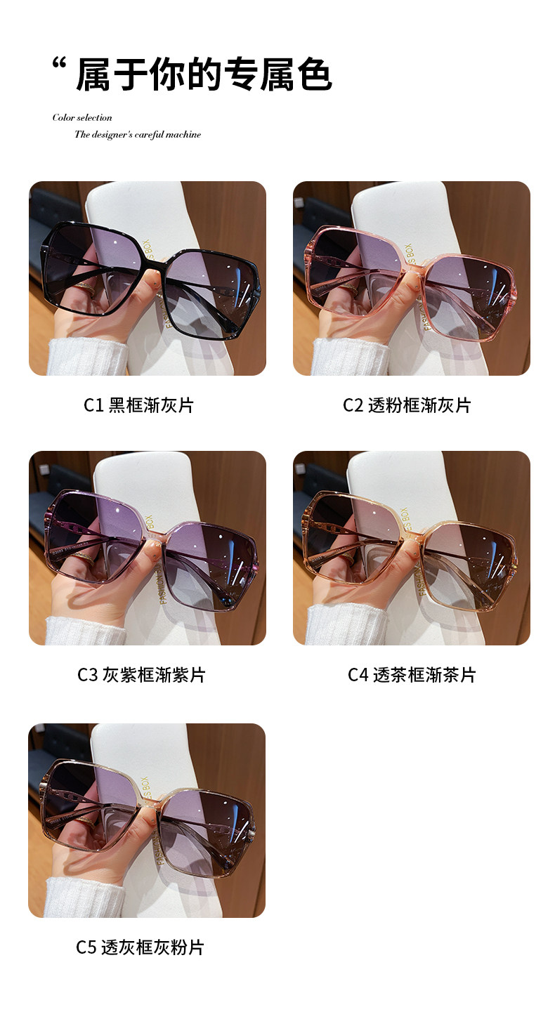 | Color Classification | C1 Black Frame Gradually Gray Film,C2 Transparent Powder Frame Gradually Gray Film,C3 Gray Purple Frame Gradient Purple Film,C4 Transparent Tea Frame with Tea Slices,C5 Transparent Gray Frame Gray Powder Frame |