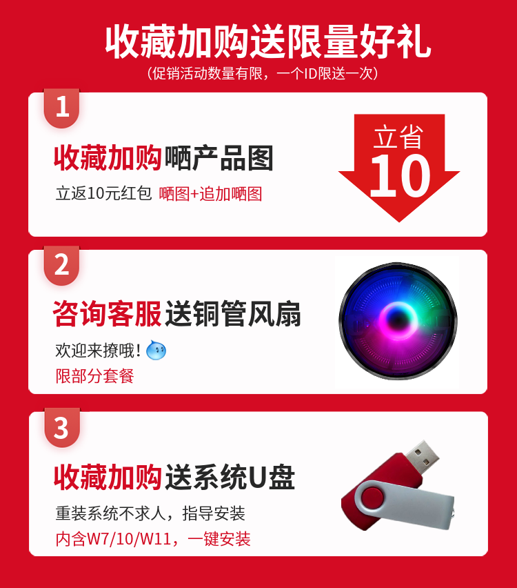 | Color Classification | Dual-Core I3 2120+B75A Motherboard+8Gd3+Fan,Dual-Core I3 3220+B75A Motherboard+8Gd3+Fan,Dual-Core I3 4150+B85A Motherboard+8Gd3+Fan,Quad-Core I5 2500+B75A Motherboard+8Gd3+Fan,Quad-Core I5 3570+B75A Motherboard+8Gd3+Fan,Quad-Core I5 4590+B85A Motherboard+8Gd3+Fan,Quad-Core I5 4690+B85M Motherboard+16Gd3+Fan,Quad-Core I7 2600K+B75M Motherboard+16Gd3+Fan,Quad-Core I7 3770+B75M Motherboard+16Gd3+Fan,Quad-Core I7 4790+B85M Motherboard+16Gd3+Fan,Dual-Core I3 6100+H310A Motherboard+16Gd3+Fan,Dual-Core I3 7100+H310A Motherboard+16Gd3+Fan,Quad-Core I3 8100+H310A Motherboard+16Gd3+Fan,Quad-Core I3 9100+H310A Motherboard+16Gd3+Fan,Quad-Core I5 6500+H310A Motherboard+16Gd3+Fan,Quad-Core I5 7500+H310A Motherboard+16Gd3+Fan,Six-Core I5 8500+H310A Motherboard+16Gd3+Fan,Six-Core I5 9600K+H310A Motherboard+16Gd3+Fan,Six-Core I7 8700K+H310A Motherboard+16Gd3+Fan,Eight-Core I7 9700K+H310A Motherboard+16Gd3+Fan,(No Integrated Graphics) Quad-Core I3 9100F+H310A Motherboard+16Gd3+ Fan,(No Integrated Graphics) Six-Core I5 9400F+H310A Motherboard+16Gd3+ Fan,(No Integrated Graphics) Six-Core I5 9600Kf+H310A Motherboard+16Gd3+ Fan,(No Integrated Graphics) Octa-Core I7 9700F+H310A Motherboard+16Gd3+Fan |