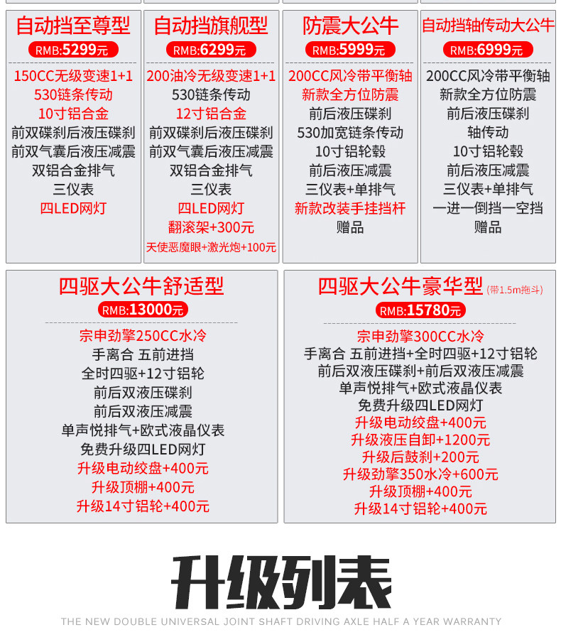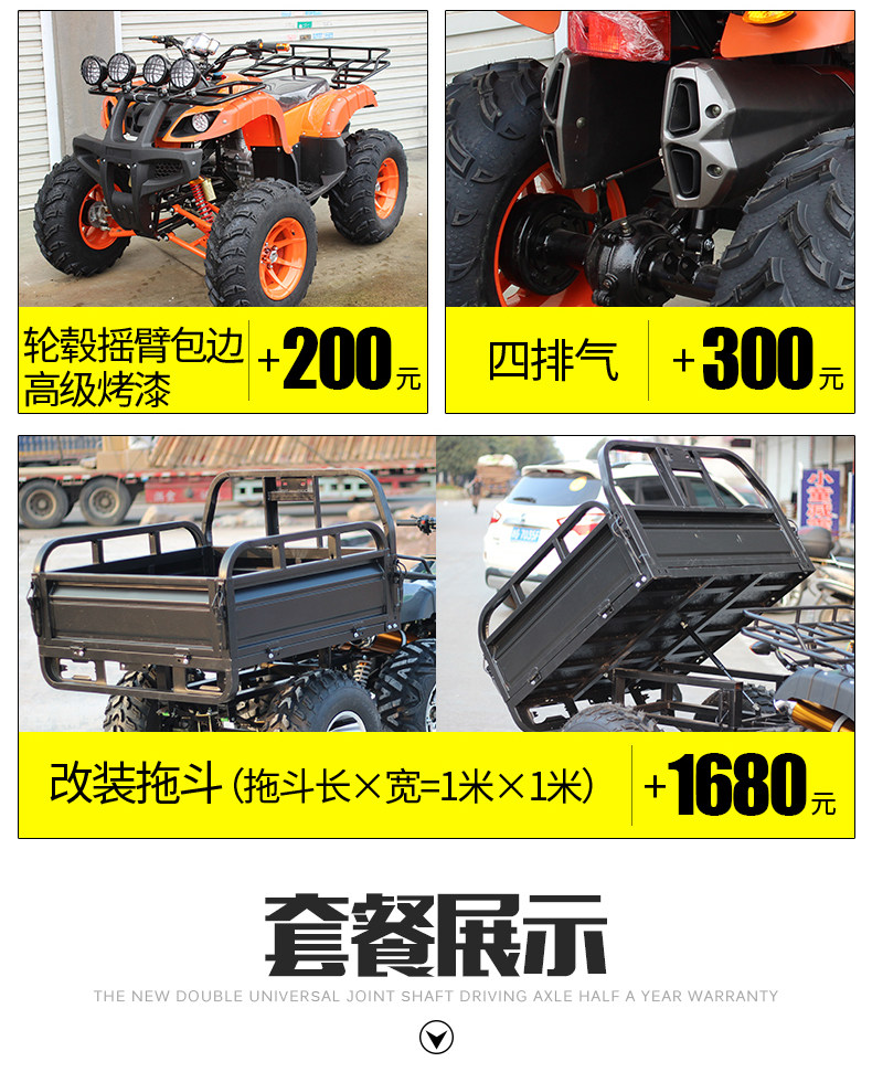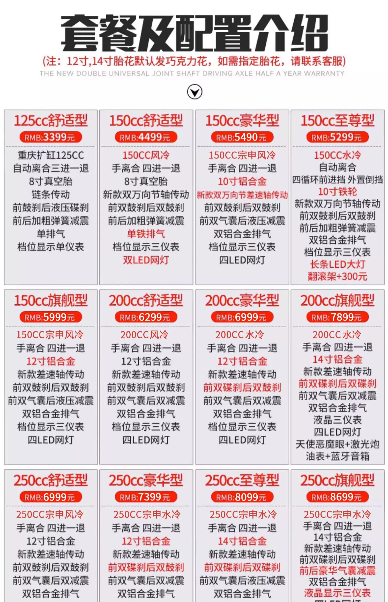 | Color Classification | 125Cc Comfort Type,150Cc Comfort Type,150Cc Luxury Model,150Cc Supreme Type,150Cc Flagship Model,200Cc Comfort Type,200Cc Luxury Model,200Cc Flagship Model,250Cc Comfort Type,250Cc Luxury Type,250Cc Supreme Type,250Cc Flagship Model,Automatic Transmission Supreme Type,Automatic Flagship Store,Automatic Shockproof Big Bull,Automatic Transmission Axle Drive Big Bull,Four-Wheel Drive Big Bull Plaid Type/Zongshen Jinqing 250 Water-Cooled/Full-Time Four-Wheel Drive/ 12inch Aluminum Wheels,Four-Wheel Drive Luxury Model/Zongshen Jinqing 300 Water-Cooled/Full-Time Four-Wheel Drive/ 12inch Aluminum Wheels/ 1.5m Buckets,Deposit, Advance Payment |