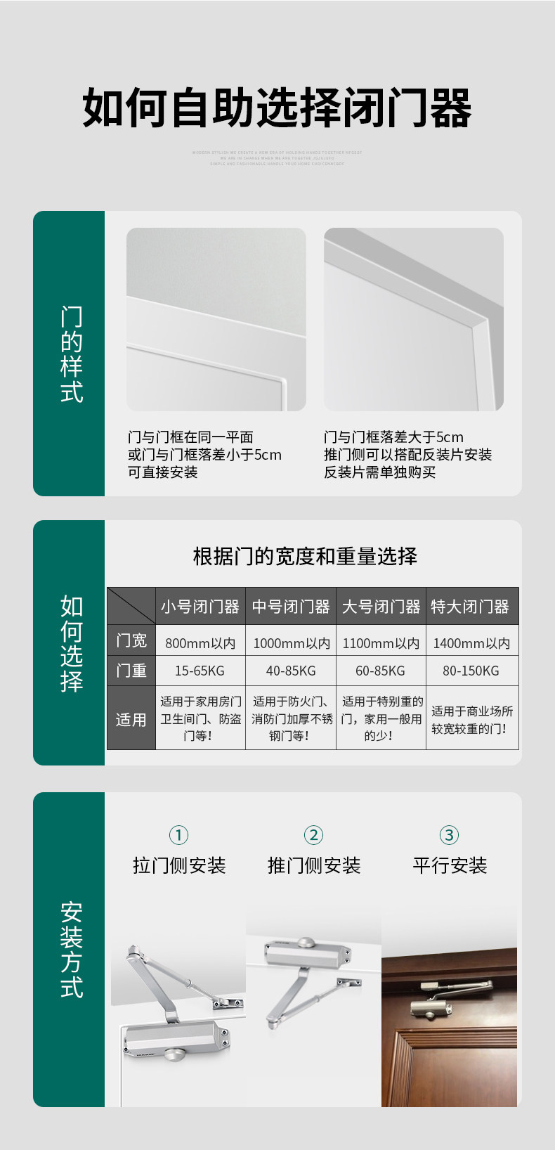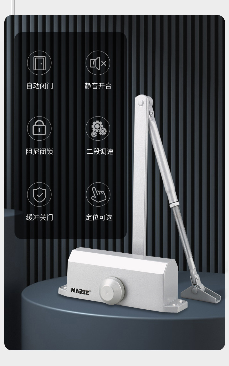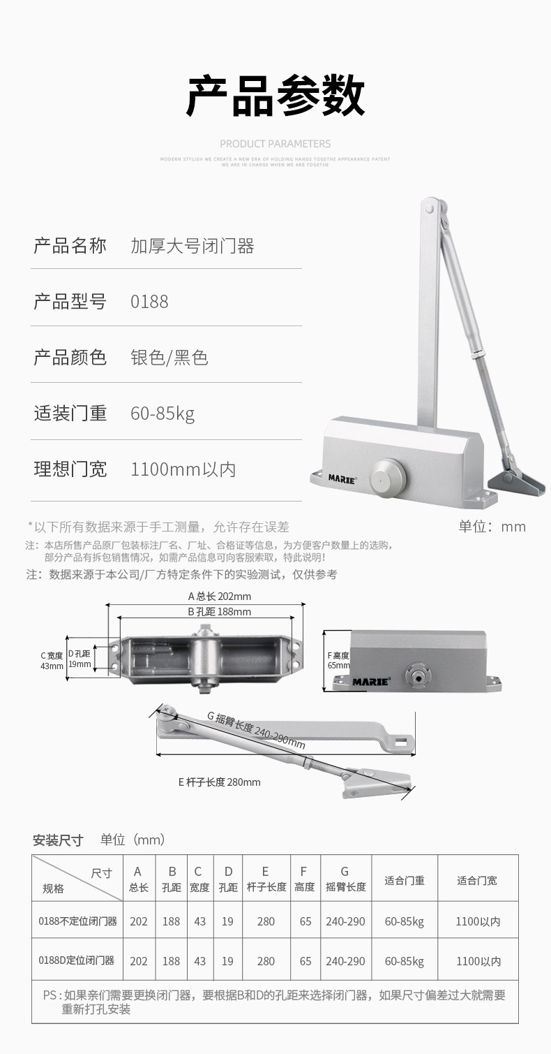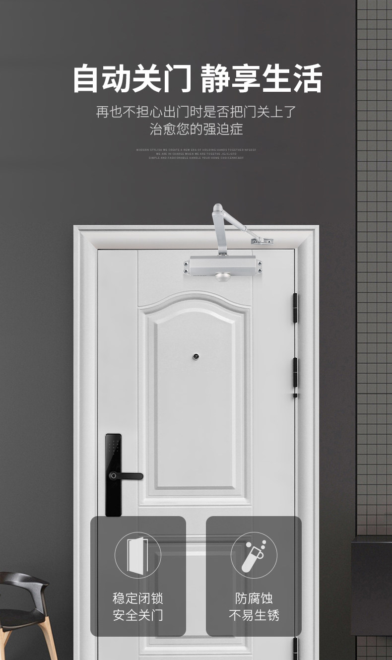 | Color Classification | [New Small Size]Suitable for Door Weights of 15-45kg. Silver, Non-Locking Model,[New Small Size]Suitable for Door Weights of 15-45kg, Silver, Fixed Position Model,[New Small Size]Suitable for Door Weights of 15-45kg. Matte Black, Non-Locking,[New Small Size]Suitable for Door Weights of 15-45kg. Matte Black, Fixed Position Model,[New Medium Size]Suitable for Door Weights of 40-85kg. Matte Black, Non-Locking,[New Medium Size]Suitable for Door Weights of 40-85kg. Matte Black, Fixed Position Model,[New Medium Size]Suitable for Door Weights of 40-85kg, Silver, Fixed Position Model,[New Medium Size]Suitable for Door Weights of 40-85kg. Silver, Non-Locking Model,[New Large Size]Suitable for Door Weights of 60-85kg, Matte Black, Non-Positioning Model,[New Large Size]Suitable for Door Weights of 60-85kg, Matte Black, Fixed Position Model,[New Large Size]Suitable for Door Weights of 60-85kg, Silver, Non-Locking Model,[New Large Size]Suitable for Door Weights of 60-85kg, Silver, Fixed Position Model,[Extra Thick & Oversized]Suitable for Door Weight 25-80kg, Silver, No Positioning,[Extra Thick & Oversized]Suitable for Door Weight 40-65kg, Black, No Positioning,[Commercial Extra Large]Suitable for Door Weight 60-85kg, Silver, No Positioning,[Commercial Extra Large]Suitable for Door Weight 80-120kg, Silver, No Positioning,[Commercial Extra Large]Suitable for Door Weight 80-120kg, Black, No Positioning,[Commercial Extra Large]Suitable for Door Weight 100-150kg, Silver, No Positioning |