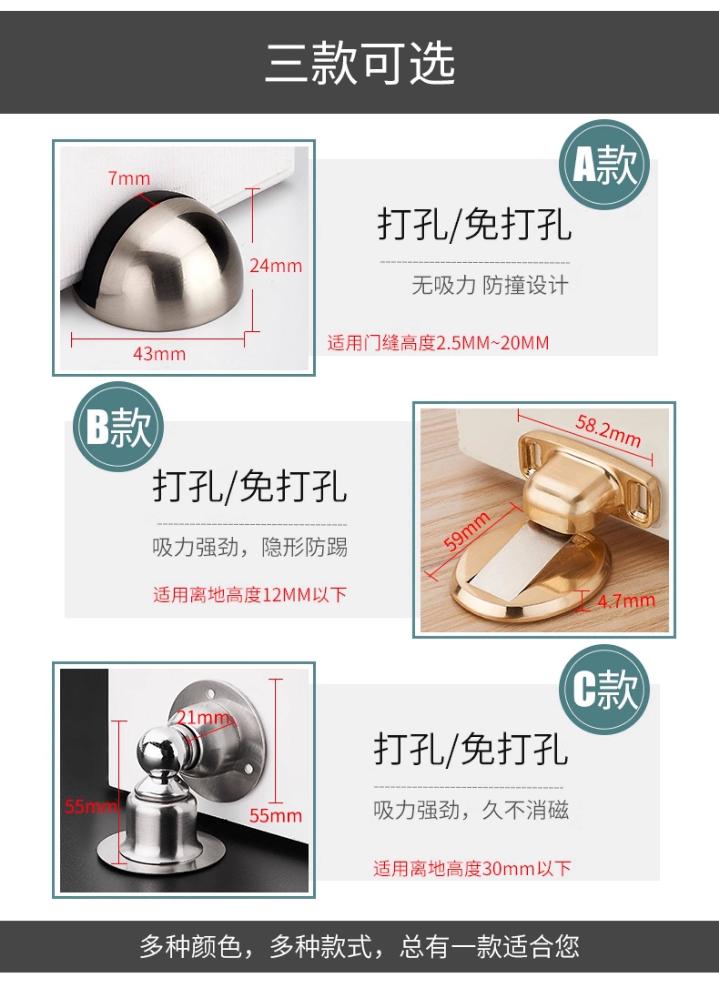 | Color Classification | Black,Brushed Stainless Steel Door Catch (Contact Customer Service to Redeem the Buy-One-Get-One-Free Offer),Matte Black Door Stop (Contact Customer Service to Activate Buy One Get One Free Offer),Red Antique Black (Contact Customer Service to Note "Buy One Get One Free"),Brushed Silver,Red Bronze,Brushed Gold,Bronze,304 Brushed Silver,304 Matte Black,304 Brushed Gold,304 Red Bronze,304 Bronze,Brushed Silver-Upgraded Version,Black-Upgraded Version,Red Bronze-Upgraded Version,Matte Black (Mechanical Lock),Brushed Silver (Mechanical Stop Lock),Red Bronze (Mechanical Locking),Bronze (Mechanical Stop Lock),Yao Ye Gray (Mechanical Lock),Matte Black (Height Adjustable) (Contact Customer Service to Note Buy One Get One Free),Brushed Silver (Height Adjustable) (Contact Customer Service to Note Buy One Get One Free),Antique Bronze (Adjustable Height) (Contact Customer Service to Redeem the Buy-One-Get-One-Free Offer),Midnight Grey (Adjustable Height) (Contact Customer Service to Redeem Buy One Get One Free Offer),Bronze (Height Adjustable) (Contact Customer Service to Note Buy One Get One Free) |