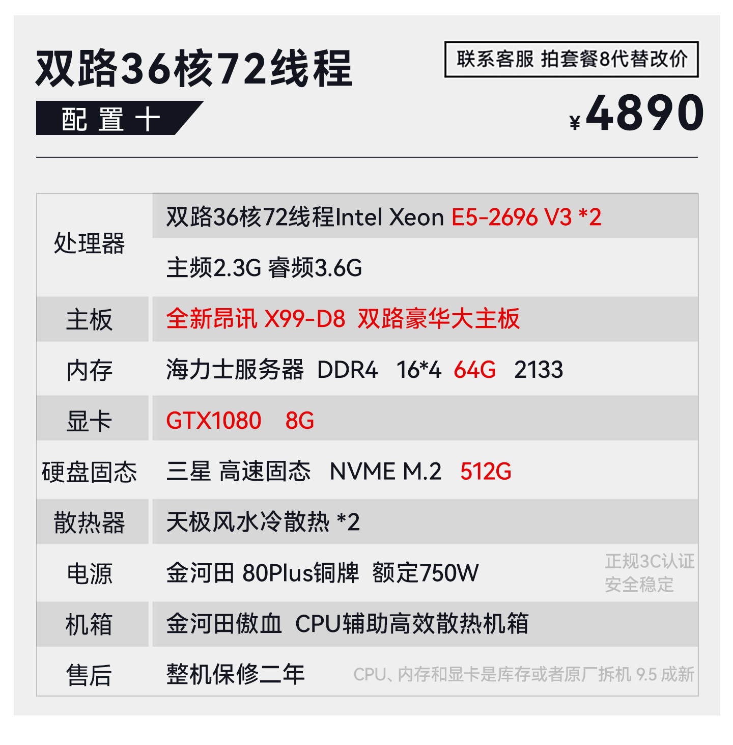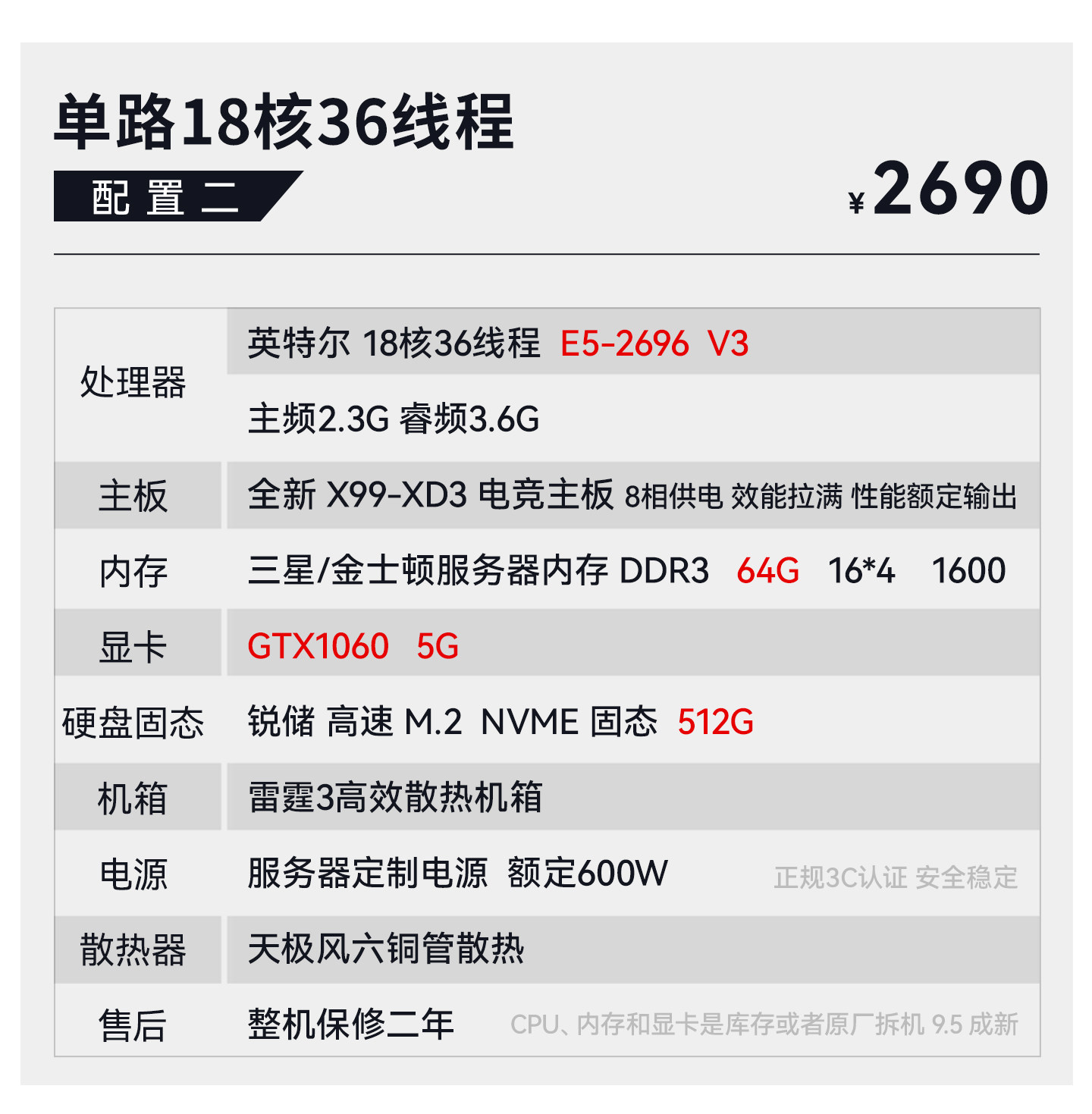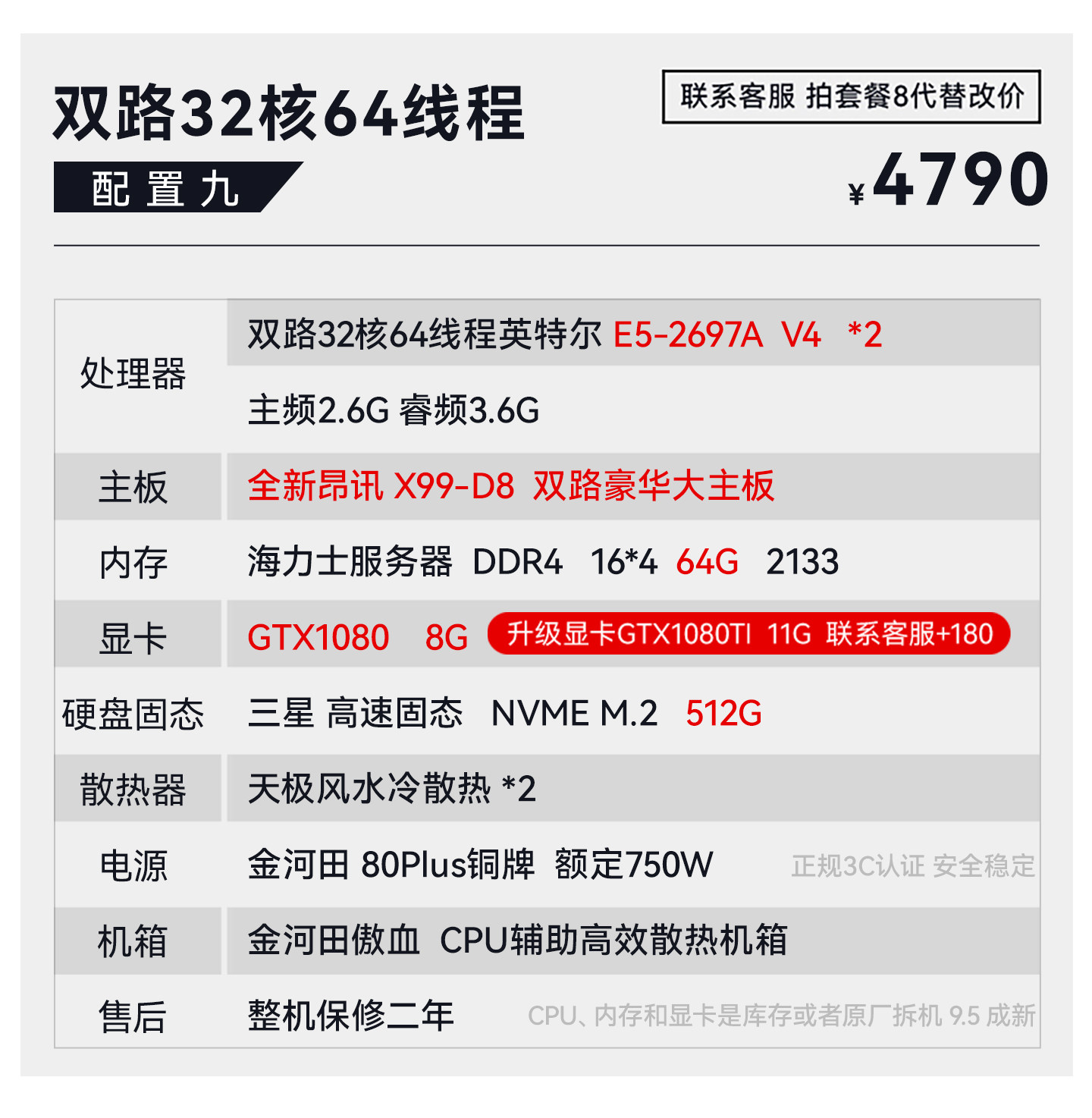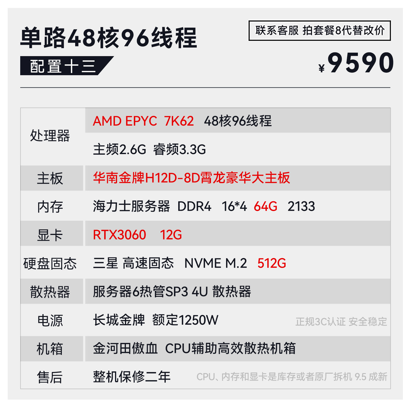 Package Type Package 1 18-Core 2686V4+64G+750 4G+512G,Package 2 18-Core 2696V3+64G+10605G+512G,Set of Three 20-Core 2680V2*2+64G+10605G+512G,Package Four 22 Core 2696V4+64G+10606G+512G,Set of Five 24-Core 2678V3*2+64G+10606G+512G,Set of Six 28-Core 2680V4*2+64G+10606G+512G,Set of Seven 32-Core 2682V4*2+64G+10606G+512G,Set of Eight 2682V4*2+64G+10808G+512G,Package Nine 32 Core 2697Av4*2+64G+1080+512G,Package Ten 36 Core 2696V3*2+64G+1080+512G,Set 11 44 Core 96V4*2+64G+1080Ti+512,Set of Twelve 32-Core 7532+64G+10808G+512G,Set of Thirteen 48-Core 7k62+64g+3060 12G+512G