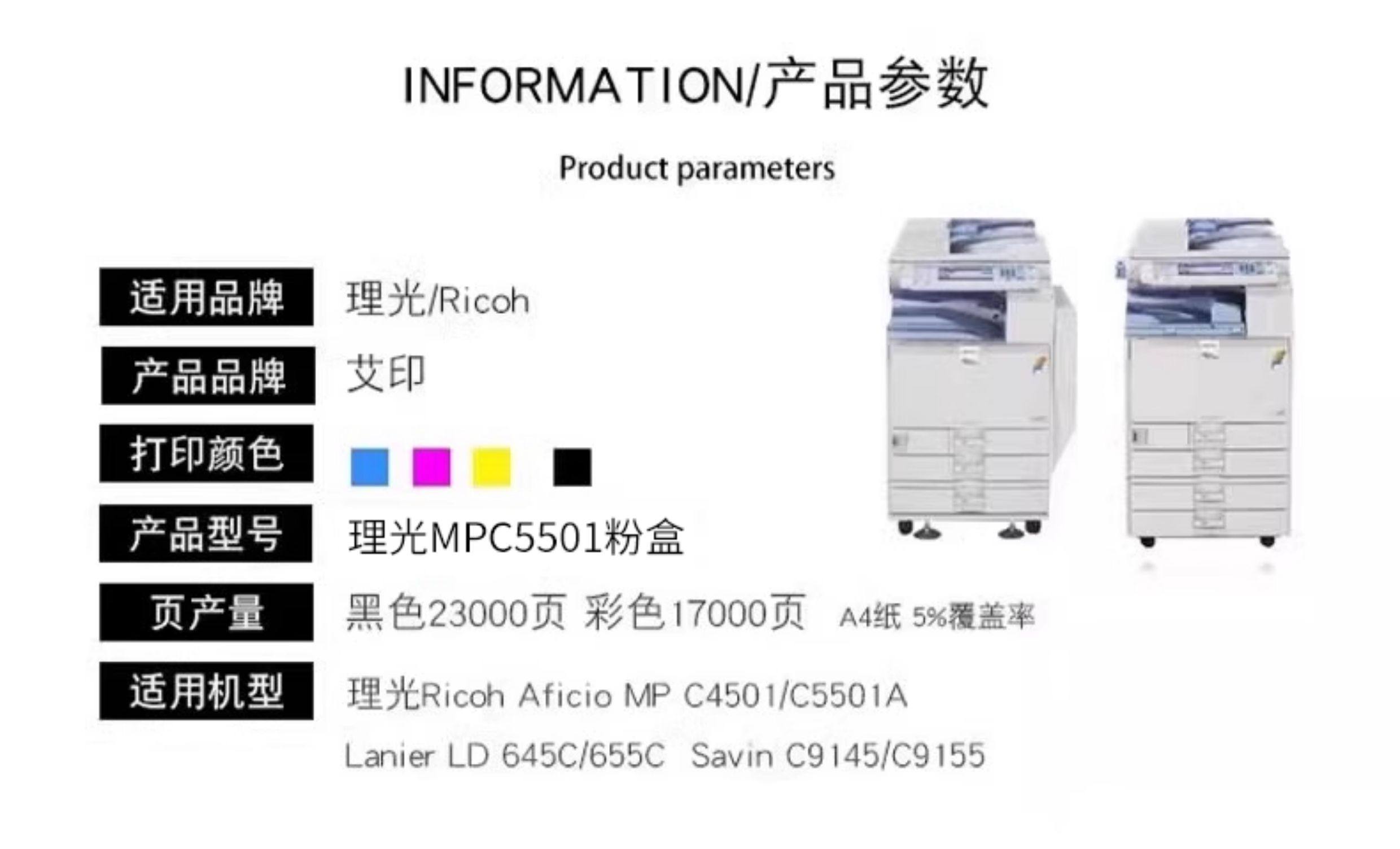 Suitable for Ricoh Mp C5501 Toner C4501 C5501A Mpc4501 Type Mpc5501 Type Colorful Digital Multifunction Printer Toner Cartridge A3 Copier Toner Cartridge Aiyin Original Genuine Product