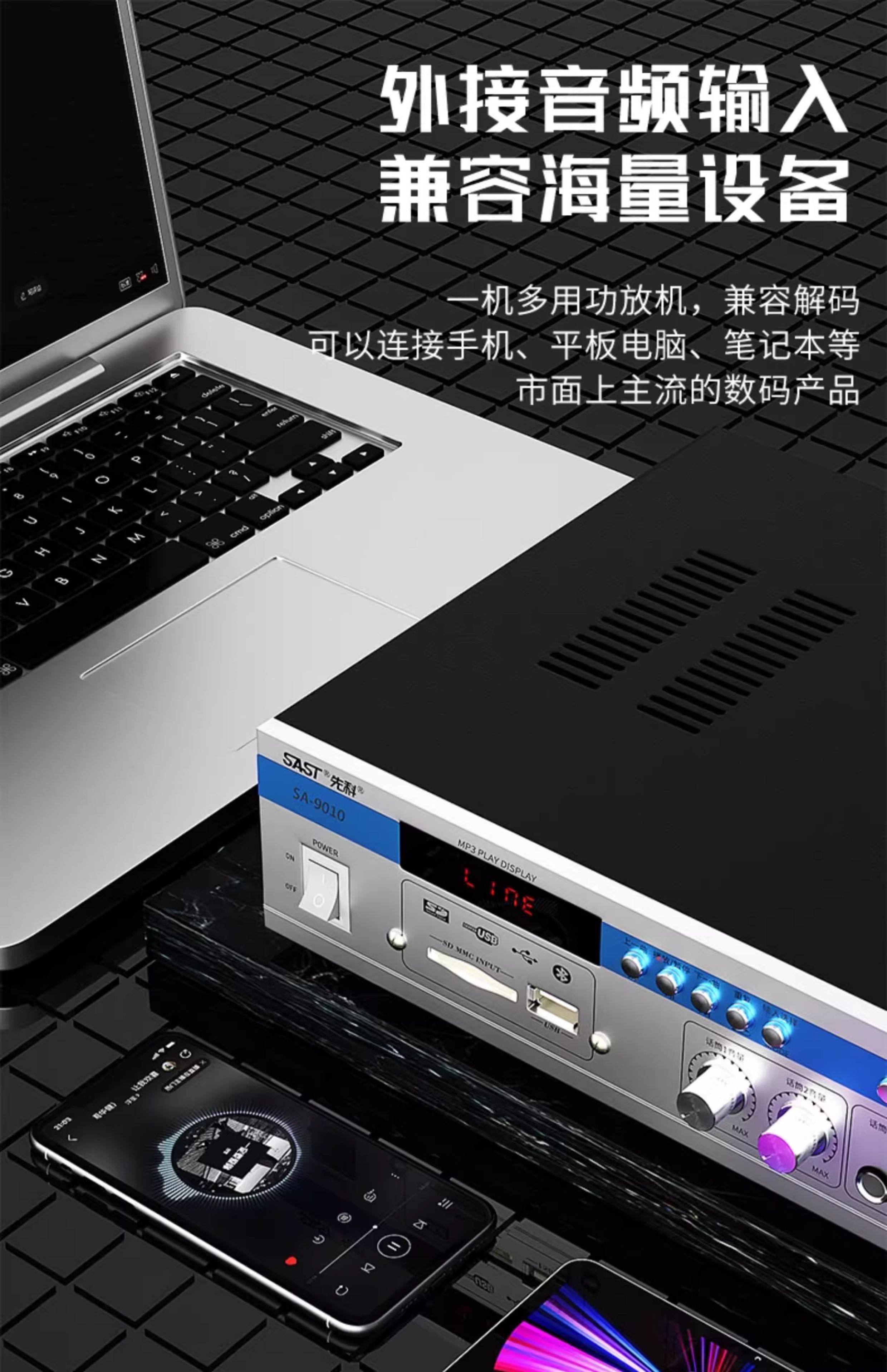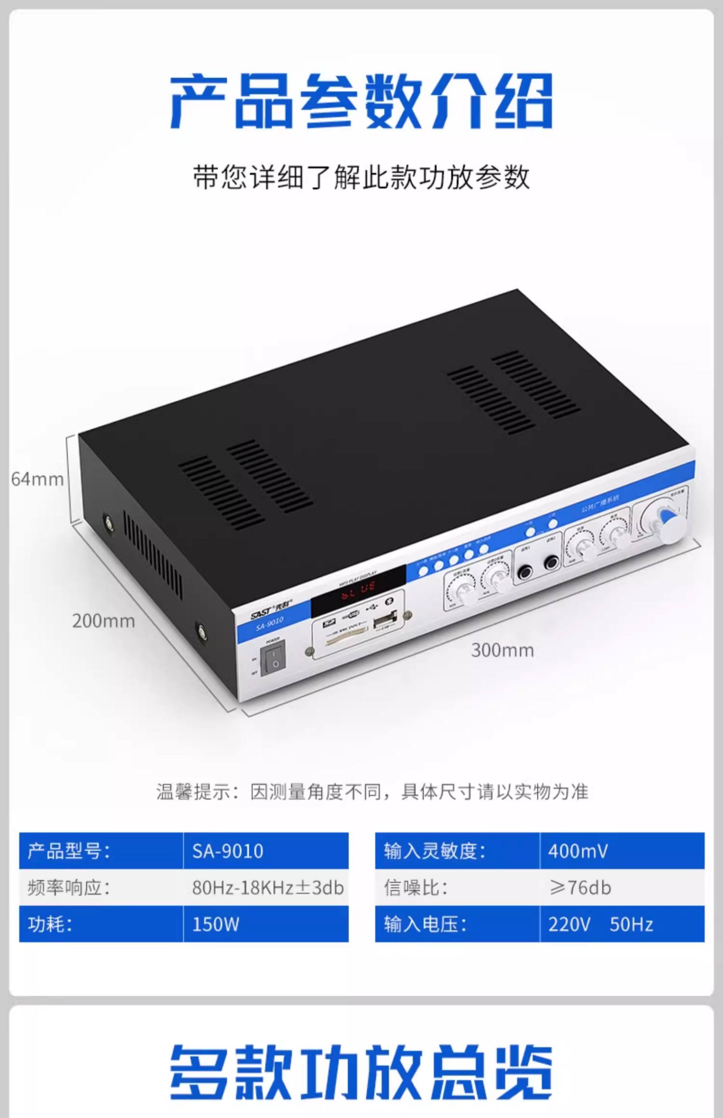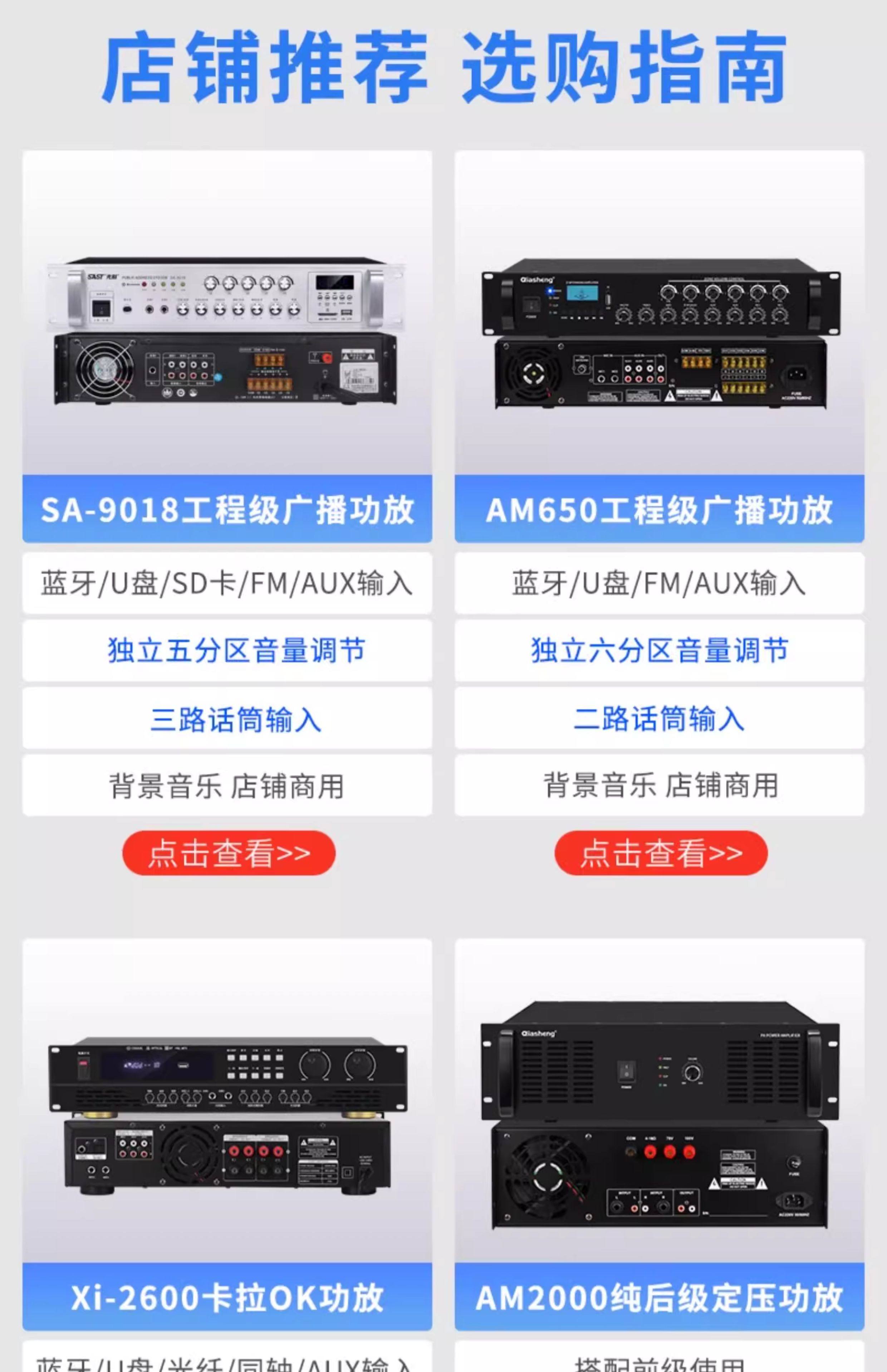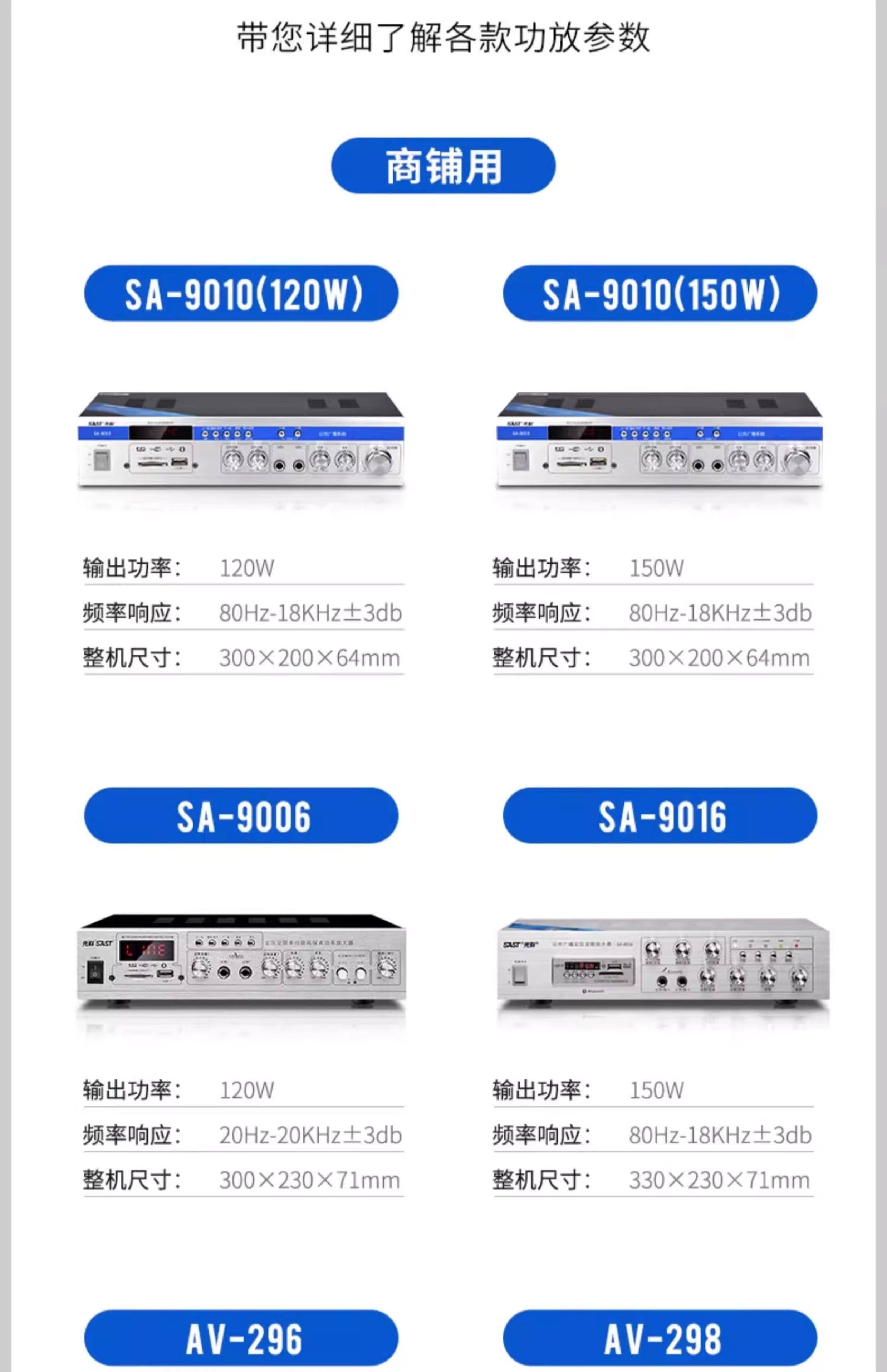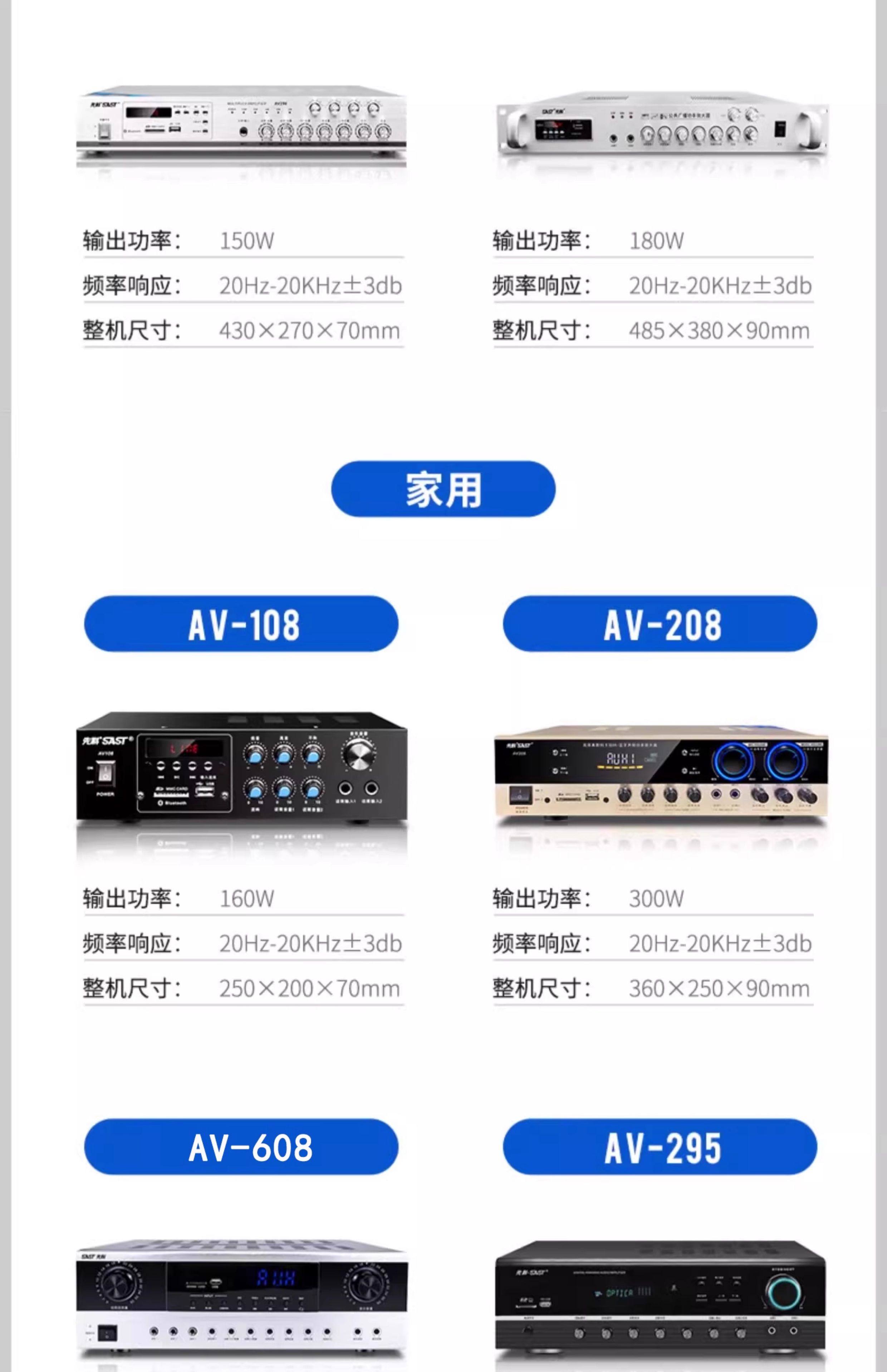 | Color Classification | Su-901 Upgraded Version [120W],Sa-9010 Upgraded Version [120W],Sa-9010 Upgraded Version [150W],Sa-9010 Ai Upgraded Version [150W] Intelligent Voice,Qia Sheng Sa-8018 Indoor/Outdoor Independent Zone, Independent Audio Source [150W],Sa-8028 Independent Indoor and Outdoor Partitions Independent Sound Source [150W],Su-902 Bluetooth Two-Zone [120W] One-Click Tuning,Sa-9006 Extreme Edition [120W],Sa-9016 Deluxe Edition [150W],Av-296 Bluetooth Four Zones [150W],Av-298 Bluetooth Two Zones [180W],Qia Sheng Av-298 Amplifier [180W] - Black,2.0 Bluetooth Digital Fixed Resistance Power Amplifier [100W],Sa-8009 Home Digital Fixed Resistance Power Amplifier [150W],Av-108 Home Fixed Resistance Power Amplifier 2 Channels [80W+80W],V-200 Home Fixed Resistance 2-Channel Power Amplifier [150W+150W],Av-208 Home Fixed Resistance Power Amplifier 2 Channels [150W+150W],Av-608 Home Fixed Resistance Power Amplifier 2 Channels [300W+300W],Av-777 Home Theater Amplifier [500W],Av-295 Home Theater Amplifier [650W] with Lossless Decoding,Av-300 Home Fixed Resistance Power Amplifier 2 Channels [500W],Av-380 Home Fixed Resistance Power Amplifier 2 Channels [700W],Av-380 Home Fixed Resistance Power Amplifier 2 Channels [1000W],[Stereo 2.0] Xi-3100 Flagship 600W|Dsp Bel Canto,[Stereo 2.2] Av-580 Extreme Edition|Can Connect 2 Subwoofers,Av-698 Bluetooth High Power Amplifier|Touch Screen,Av-698 Bluetooth High Power Amplifier|Equipped with Wireless Dual Microphones,Av-798 Bluetooth High Power Amplifier|Touch Screen,Av-798 Bluetooth High Power Amplifier | Equipped with Wireless Dual Microphones,2000W Four-Channel Power Amplifier | Digital Reverb | 48V Phantom Power,[Engineering Use] 200W Five-Zone Power Amplifier,[Engineering Use] 300W Five-Zone Power Amplifier,[Engineering Use] 500W Five-Zone Power Amplifier,[Engineering Use] 700W Five-Zone Power Amplifier,[Engineering Use] 900W Five-Zone Power Amplifier,[Engineering Use] 1200W Five-Zone Power Amplifier |