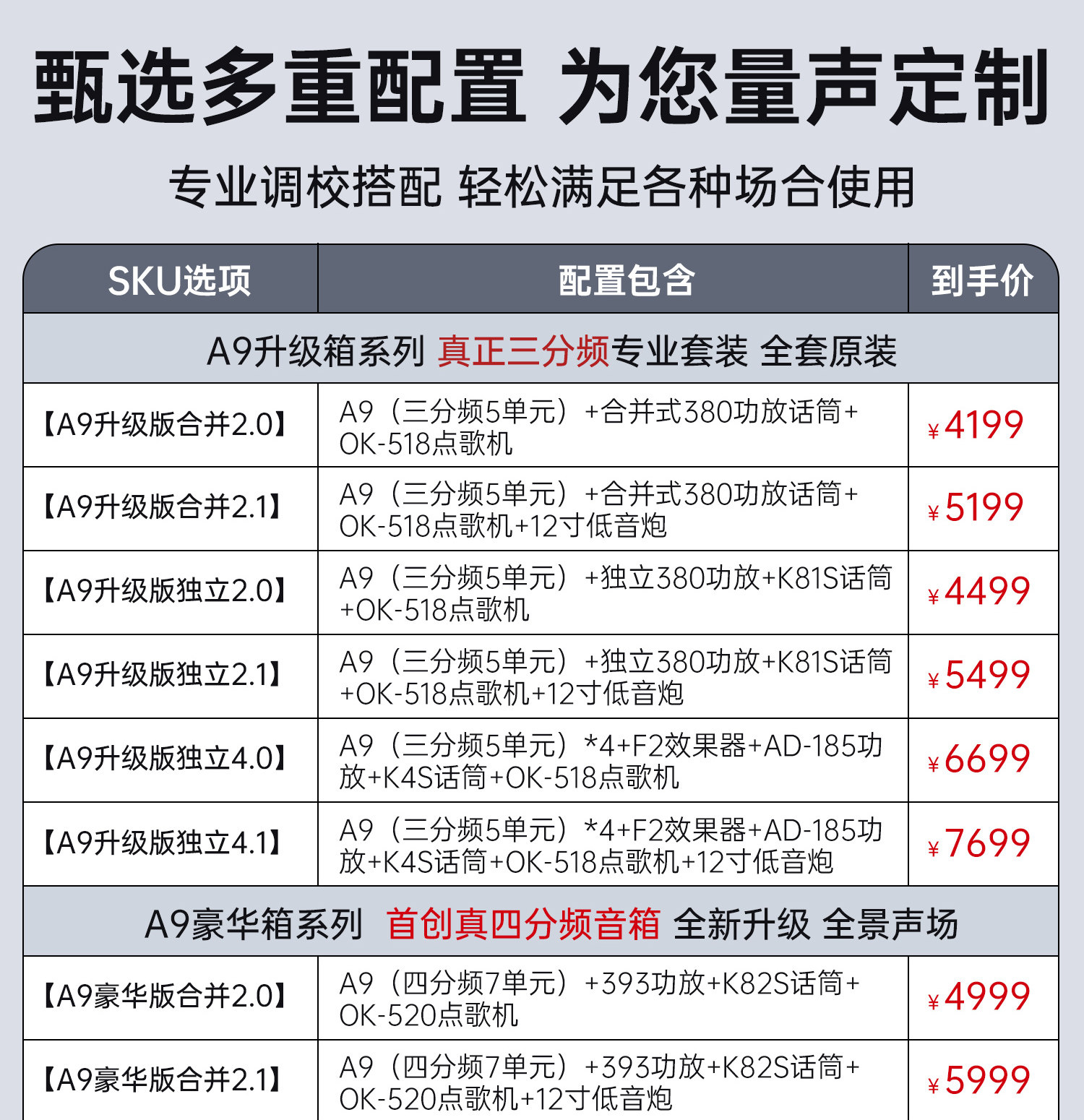 | Color Classification | ✅Professional Karaoke✅The Difference in Sound Effects between Three-Way and Four-Way Crossovers Compared to Two-Way Crossovers,✅Brand New Upgrade✅Singing Is Easier and the Sound Effect Is Improved by 20%-30%,【A9 Upgraded Version 2.0】Microphone + Amplifier + Effects Combo (Making Karaoke Easier Than Ever),【A9 Upgraded Version 2.1】Integrated Amplifier + Subwoofer (Enhanced Bass, Immersive Experience),【A9 Upgraded Version Independent 2.0】Standalone Microphone (Separate Microphone Receiver, Easy to Adjust for Karaoke),【A9 Upgraded Version - Standalone 2.1】Standalone Microphone + Subwoofer (Delivers Ultra-Immersive Sound),【A9 Upgraded Version Independent 4.0】4 Three-Way Speakers + Independent Effects Processor (Ultimate Pure Sound Quality),【A9 Upgraded Version - Standalone 4.1】4-Way 3-Way Speakers + Effects Processor + Subwoofer (Surround Sound for Immersive Audio),【A9 Deluxe Edition Merged 2.0】Industry-First Upgrade: True Quad-Crossover (45°Reflective Treble Surround Sound),【A9 Deluxe Edition Merged 2.1】True Quad-Crossover + 12inch Subwoofer (Rich, Immersive Karaoke Experience),【A9 Deluxe Edition Independent 2.0】True Quad-Crossover + Independent Effects Processor (Vocal Enhancement for Superior Sound),【A9 Deluxe Edition Independent 2.1】Quad-Crossover + Effects Processor + Subwoofer (Million-Tone Tuning, Live-Grade Vocals),【A9 Deluxe Edition Independent 4.0】4 Four-Way Speakers + Independent Effects Processor (Panoramic Surround Sound),【A9 Deluxe Edition Independent 4.1】4-Way Four-Way Speaker System + Effects Processor + Subwoofer (Full, Immersive Sound for Large Spaces),【Ne1 Professional Box Consolidation 2.0】2026 First Release New Model (Ne1 Professionally Customized Box - Significantly Enhanced Audio Quality),【Professional Box Combo 2.1】Newly Released, Stunning Sound (Pairs with a Subwoofer for Immersive, Live-Performance Impact),【Professional Box Independent 2.0】 Professional Box + Independent Effects Processor (High-End Custom Acoustic Configuration),【Professional Speaker System 2.1】Professional Speaker + Effects Processor + Subwoofer (Professional Stage Performance),【Professional Box Independent 4.0】4 X Professional Box Speakers + Independent Effects Processor (Full Soundstage, Panoramic Coverage),【Professional Speaker System 4.1】4 Professional Speakers + Effects Processor + Subwoofer (Ultimate Performance, Immersive Audio-Visual Experience) |